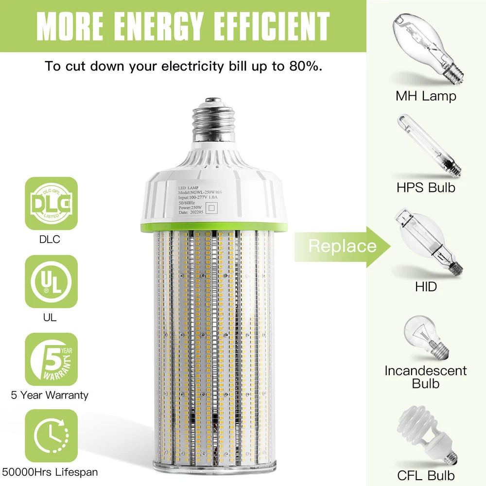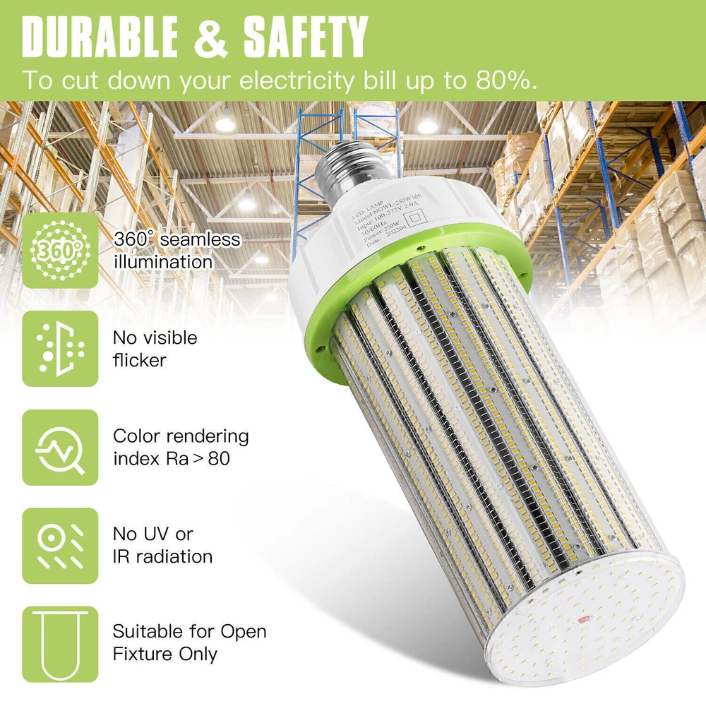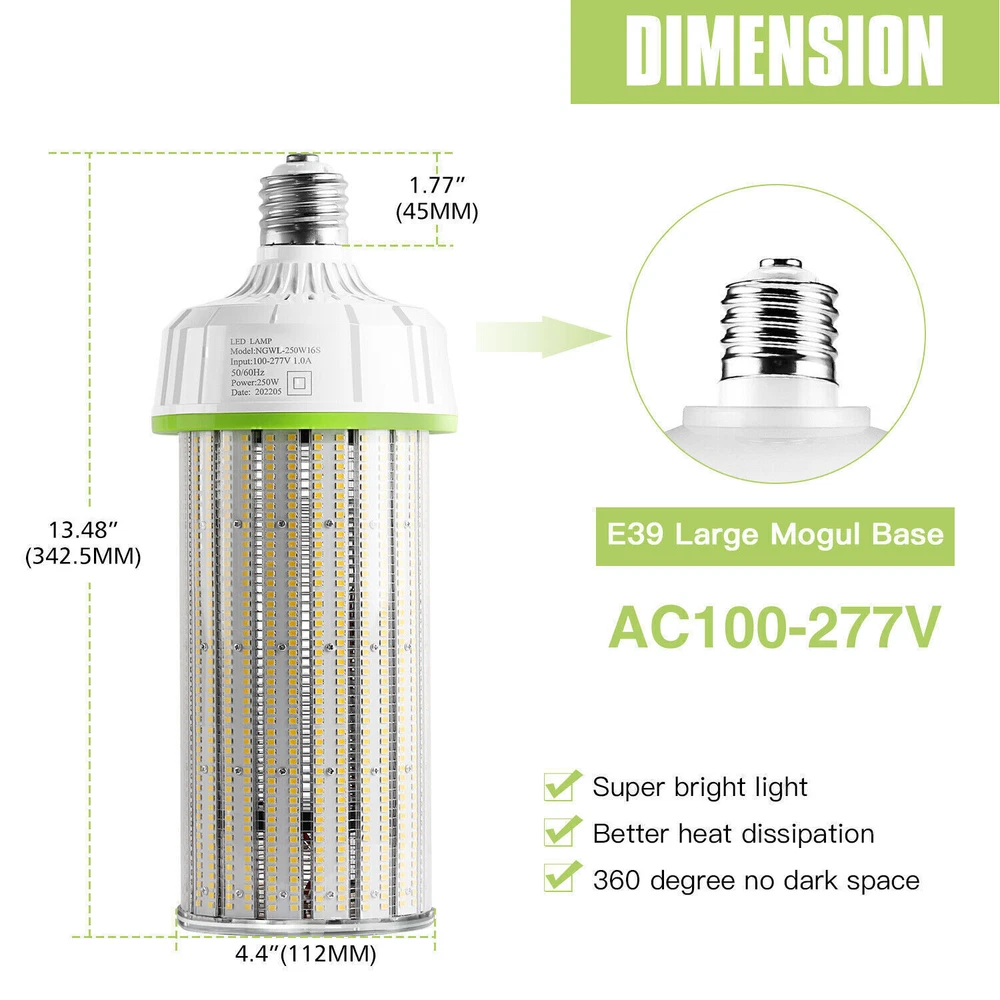 SAFE & SECURE SHOPPING 100% SATISFACTION GUARANTEED FAST SHIPPING 250W LED Corn Bulb Industrial Commercial Open Fixture Light 5000K - 33750 Lumens Product Description This bulb is suitable for OPEN FIXTURE ONLY. Check size first before ordering. WIDELY APPLICATION & ENERGY EFFICIENT --- Adopted SMD2835 LED chips delivery the most comfortable 5000K Daylight for you. 360 degree beam angle, you can save 80% electricity bill by replacing 800W~1200W CFL/MH/HPS and other E39/E40 bulbs. It's perfect for garage, driveway, warehouse, barn, patio, courtyard, garden, street, office, school, hospital, shopping mail, supermarket, station, restaurant, hotel, workshop etc, anywhere need bright light. LONG LIFESPAN --- Aluminum fin heat sink body with two inside fans active cooling solution gives LED corn light 50000 hours long lifetime (23 years, based on 6 hrs/day). Unique full sealed lamp base and transparent PC cover protect LEDs from dust, insect and humidity working environment and make the LED more stable during working. EASY INSTALLATION --- Connect directly into E39 base - just screw in Corn bulb is equipped with internal driver for single component installation.(Don't need ballast, just direct wire them). 5 YEAR WARRANTY --- We offer 5 years warranty for all of it’s products. We pay most attention to the product safety and reliability standards, UL cUL safety certification approved. DLC certified for rebate helps you save money. WE ARE PROFFSSIONAL - We are professional LED light Manufacturer with 3,000 square meters production area. We produce LED lights since 2010 with fully quality certification assured. All LED lights will aging test and packed well before ship, any problems happened within 5 years please feel free to contact us for support. Technical Characteristic: LED Type: 2835 SMD LEDS Luminous Flux(lm): 33,750 Lumens Color temperature: 5000K CRI: >80 Input Power: 250W Beam Angle: 360 degree Input Voltage: AC100-277V 50/60Hz PF: >90% Replacement:1000W Metal Halide / HPS/Mercury Vapor Warranty:5 Years Certificated: UL & DLC Listed NOTICE: 1.The LED Corn bulb is wide input voltage(AC100V-277V). 2.Please turn off power before install or change assembly parts. 3.Make sure to remove ballast or starter before install the lamps. 4.The input voltage and lamps should be matched, after connecting the power line, please make sure the wiring section is insulated. Package Included: 1 x 250W LED corn light (E39 Large Mogul Base) Copyright © 2022 Tongtool