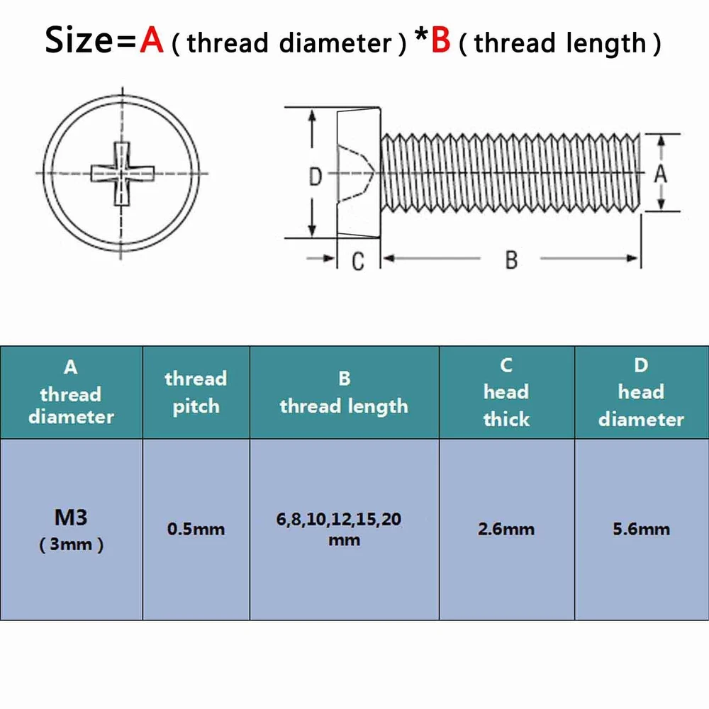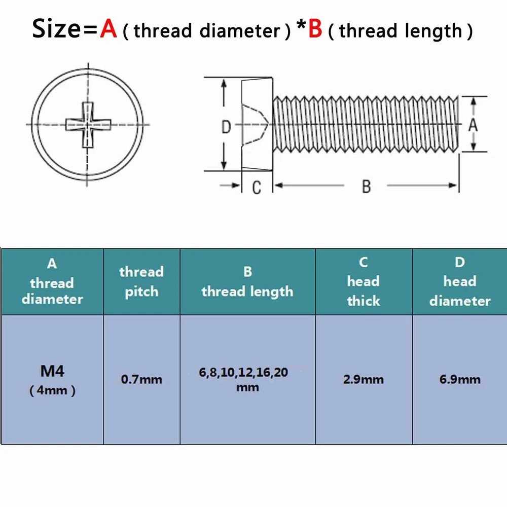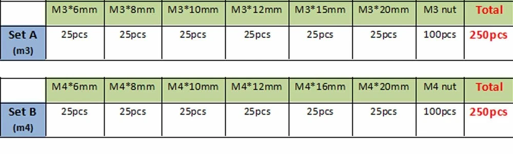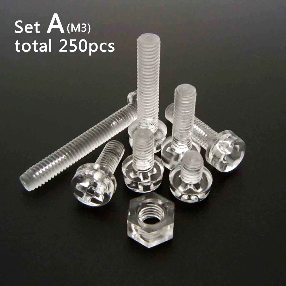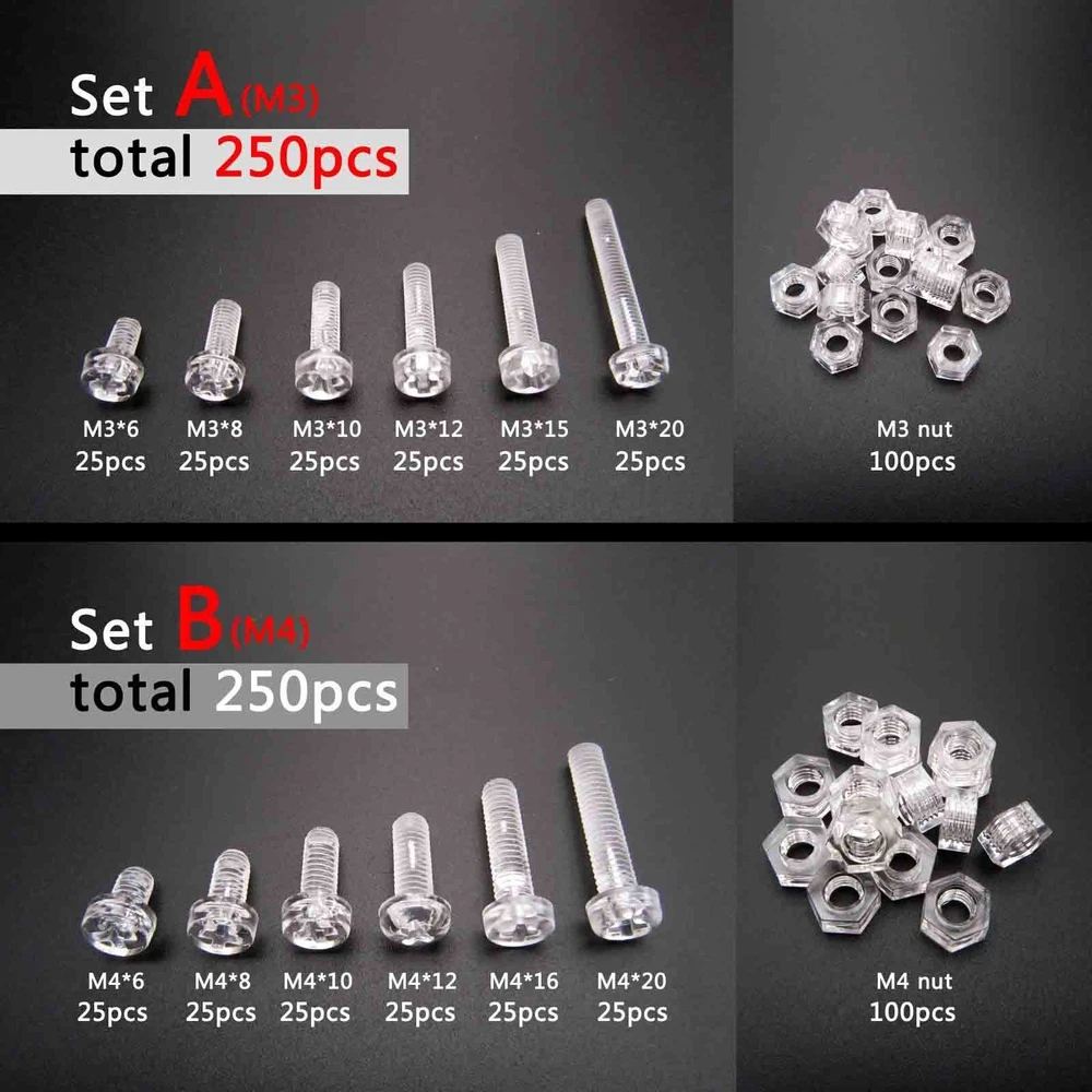 There are 250pcs assortment set high quality acrylic M3/M4 round pan phillips head Screws and hex nuts Package: Material: acylic Size: Screw size: A(thread diameter) x B(total length) Metric thread diameter: M3(3mm) / M4 (4mm) Metric thread pitch: M3(0.5mm) / M4(0.7mm) On Dec 14, 2024 at 18:30:25 PST, seller added the following information: