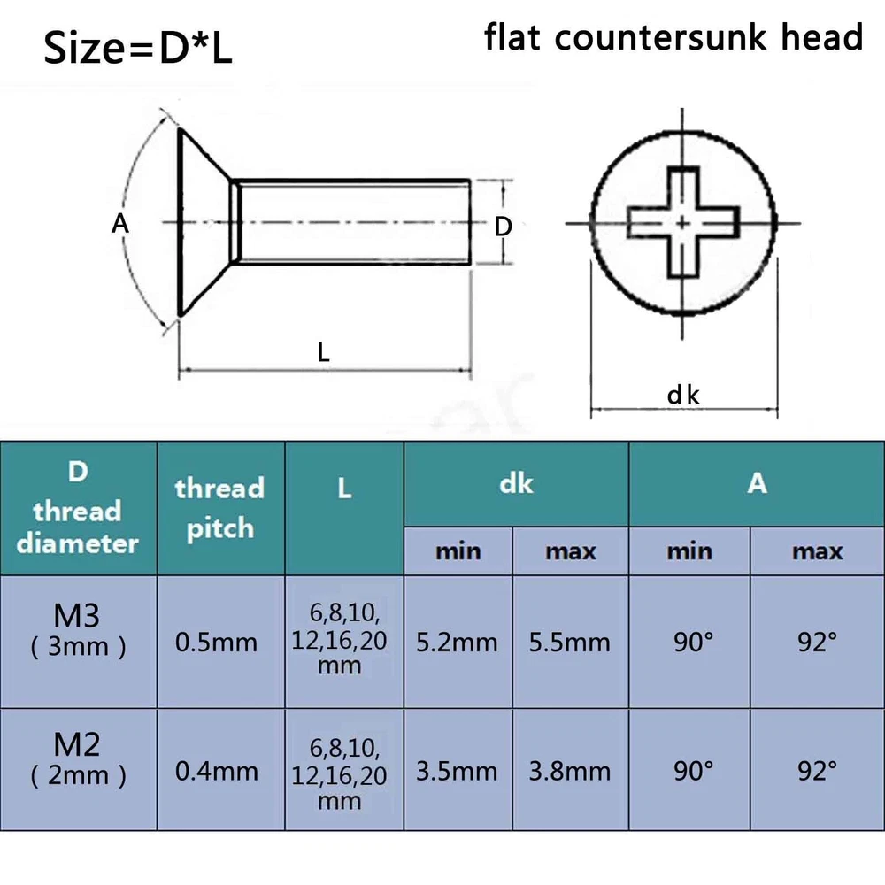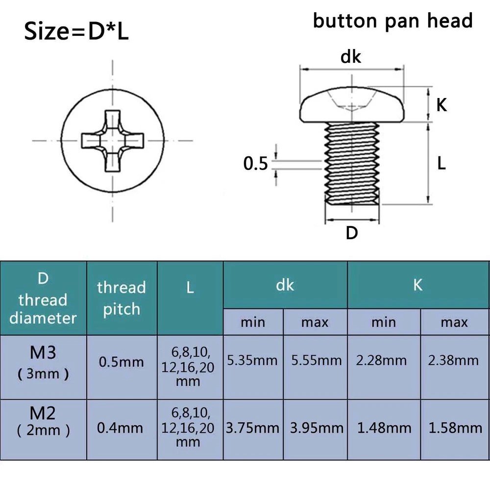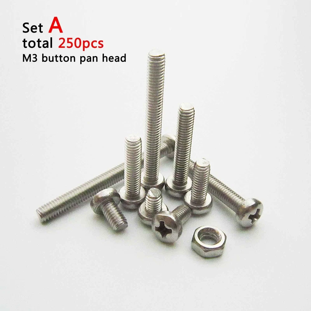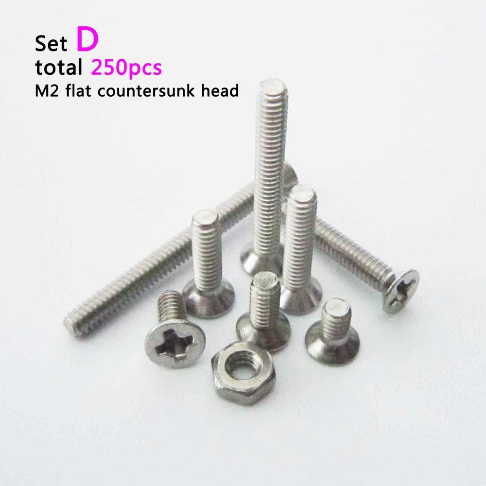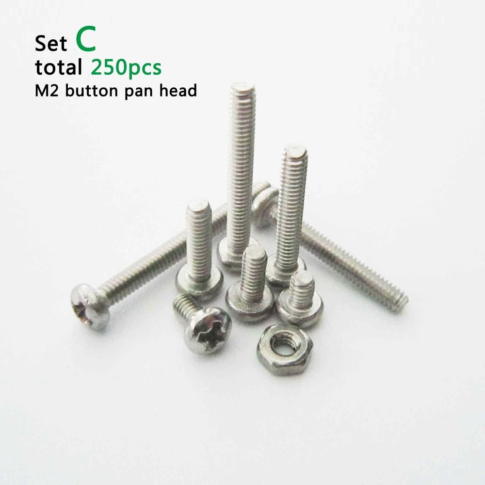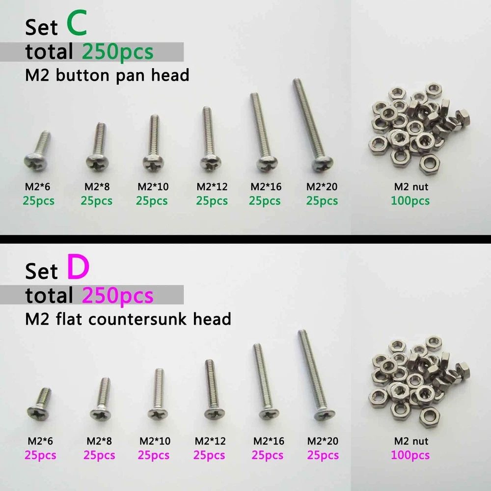 There are 250pcs assortment kit 304 stainless steel Metric Thread M2 M3 Phillips pan head/flat head screws and nuts Package: Set A M3 phillips pan head M3*6, M3*8, M3*10, M3*12, M3*16, M3*20 each size 25pcs + M3 nut 100pcs =total 250pcs Set B M3 phillips flat countersunk head M3*6, M3*8, M3*10, M3*12, M3*16, M3*20 each size 25pcs + M3 nut 100pcs =total 250pcs Set C M2 phillips pan head M2*6, M2*8, M2*10, M2*12, M2*16, M2*20 each size 25pcs + M2 nut 100pcs =total 250pcs Set D M2 phillips flat countersunk head M2*6, M2*8, M2*10, M2*12, M2*16, M2*20 each size 25pcs + M2 nut 100pcs =total 250pcs Description: Material: 304 stainless steel Screw size: D(thread diameter) x L(length) Metric thread diameter:M3(3mm) / M2 (2mm) Metric thread pitch: 0.5mm(M3) / 0.4mm(M2) On Dec 14, 2024 at 19:11:31 PST, seller added the following information: