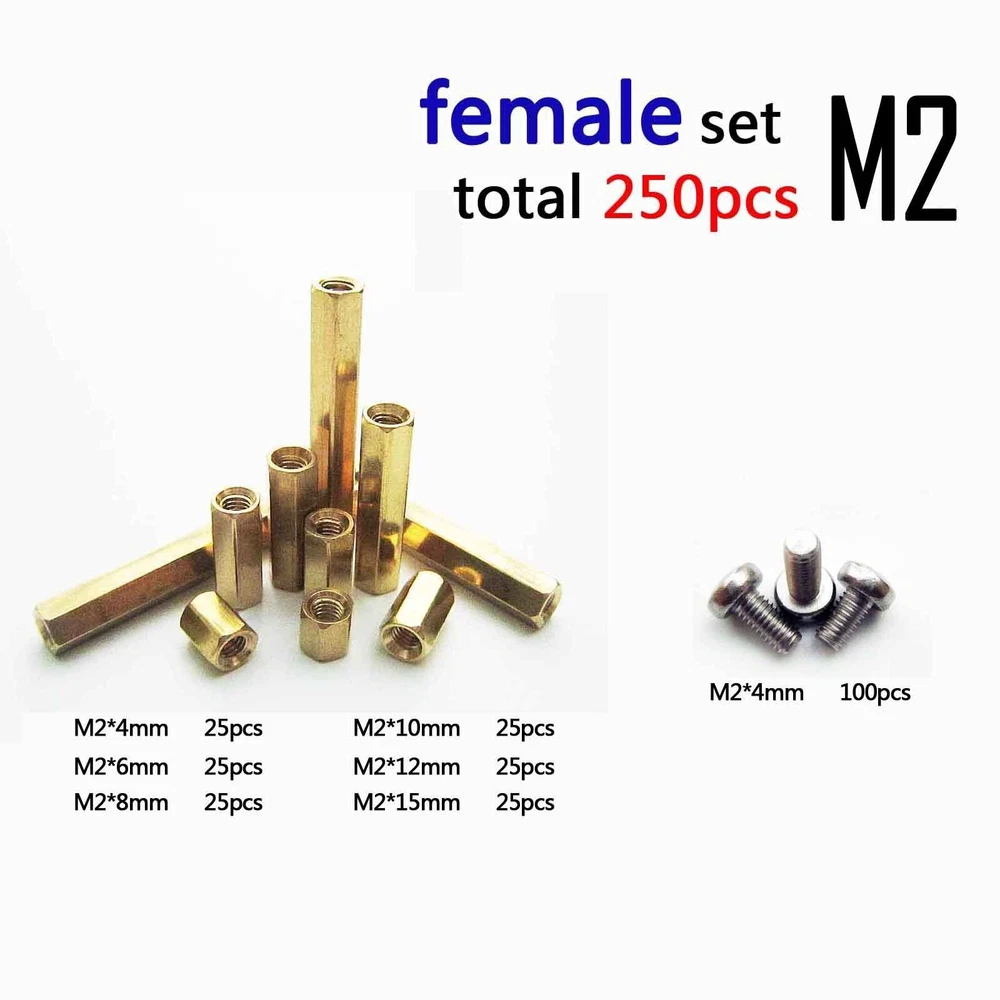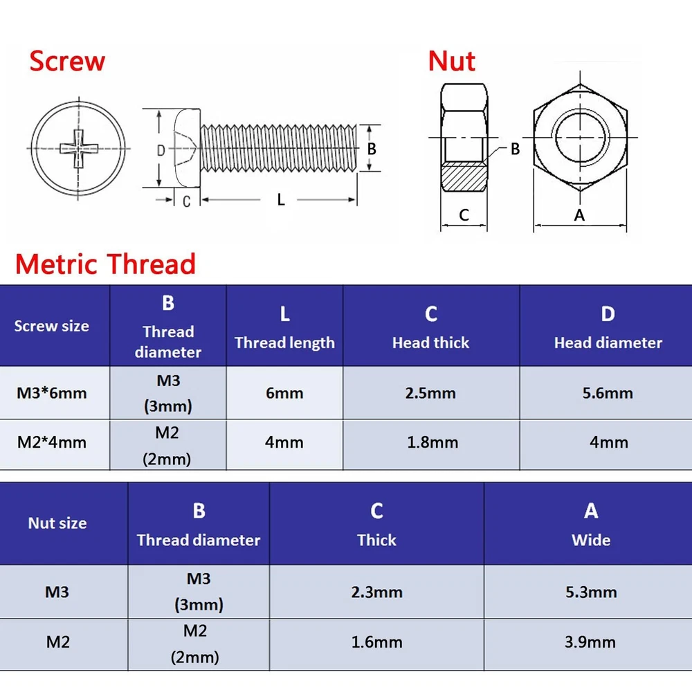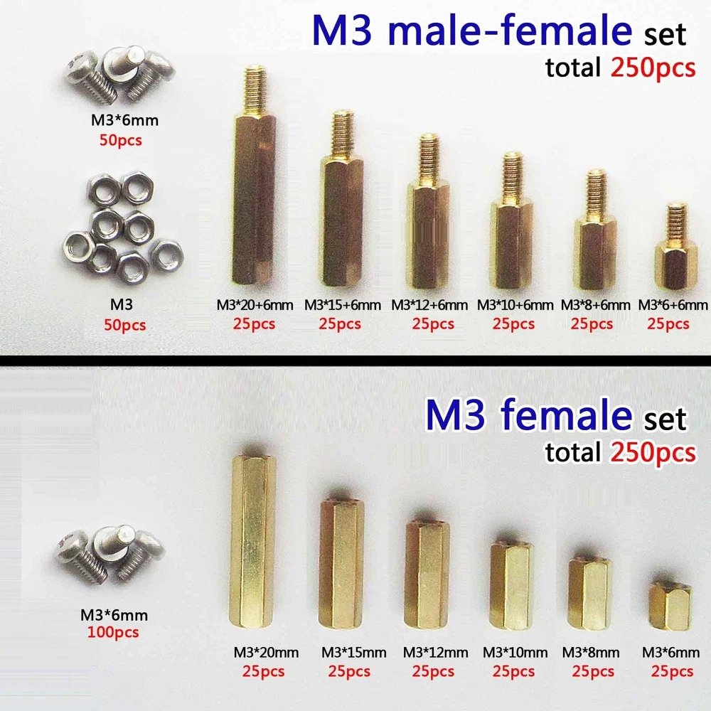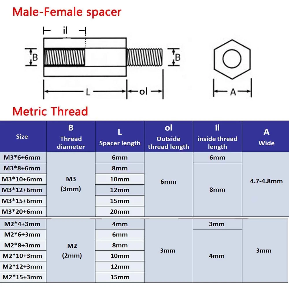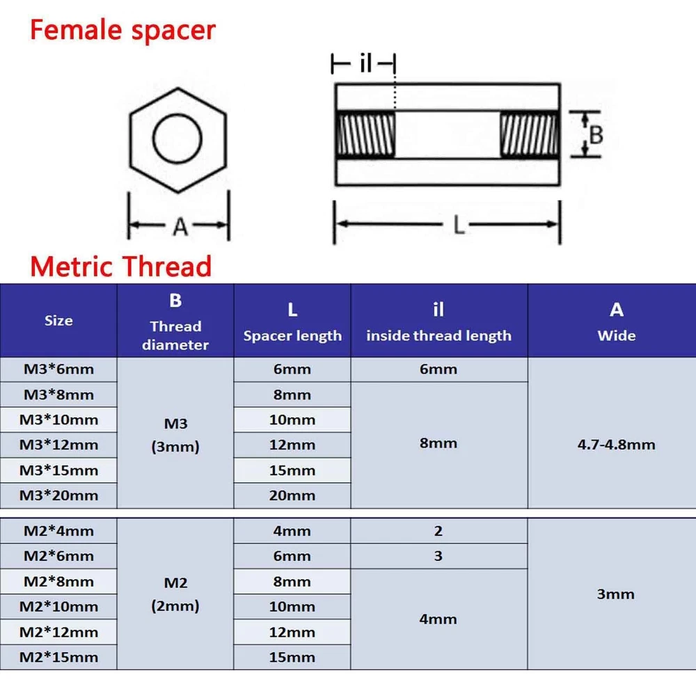 There are 250pcs assortment kit high quality metric thread brass hex spacer, phillips head stainless steel screws and hex stainless steel nuts Package: Material: Solid Brass (male-female spacer/female spacer) 304 stainless steel (screw/nut) Male-Female spacer Size: Size=M3*L+5/6mm M3 metric thread diameter: 3mm M3 metric thread pitch: 0.5mm M3 outside thread length: 5/6mm M3 inside thread length: 5/8mm M3 spacer wide: 4.7-4.8mm Size M2*L+3mm M2 metric thread diameter: 2mm M2 metric thread pitch: 0.4mm M2 outside thread length: 3mm M2 inside thread length: 3/4mm M2 spacer wide:3mm Female spacer Size: Size=M3*L M3 metric thread diameter: 3mm M3 metric thread pitch: 0.5mm M3 inside thread length: 5/8mm M3 spacer wide: 4.7-4.8mm Size M2*L M2 metric thread diameter: 2mm M2 metric thread pitch: 0.4mm M2 inside thread length: 2/3/4mm M2 spacer wide:3mm Screw Size: M3metric thread diameter: 3mm M3 metric thread pitch: 0.5mm M3 thread length: 6mm M2 metric thread diameter: 2mm M2 metric thread pitch: 0.4mm M2 thread length: 4mm Nut Size: M3metric thread diameter: 3mm M3 metric thread pitch: 0.5mm M3 thick: 2.3mm M2 metric thread diameter: 2mm M2 metric thread pitch: 0.4mm M2 thick: 1.6mm On Dec 14, 2024 at 19:27:54 PST, seller added the following information: