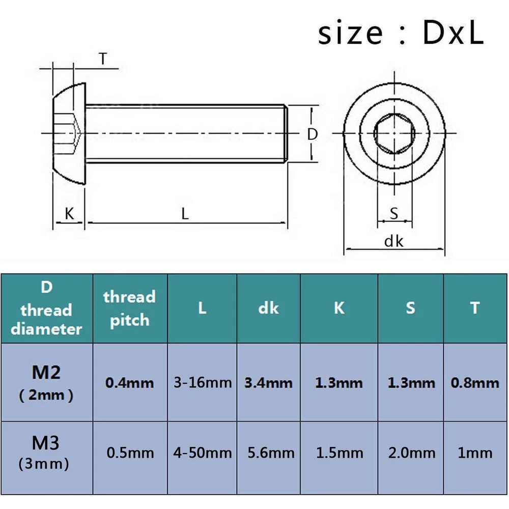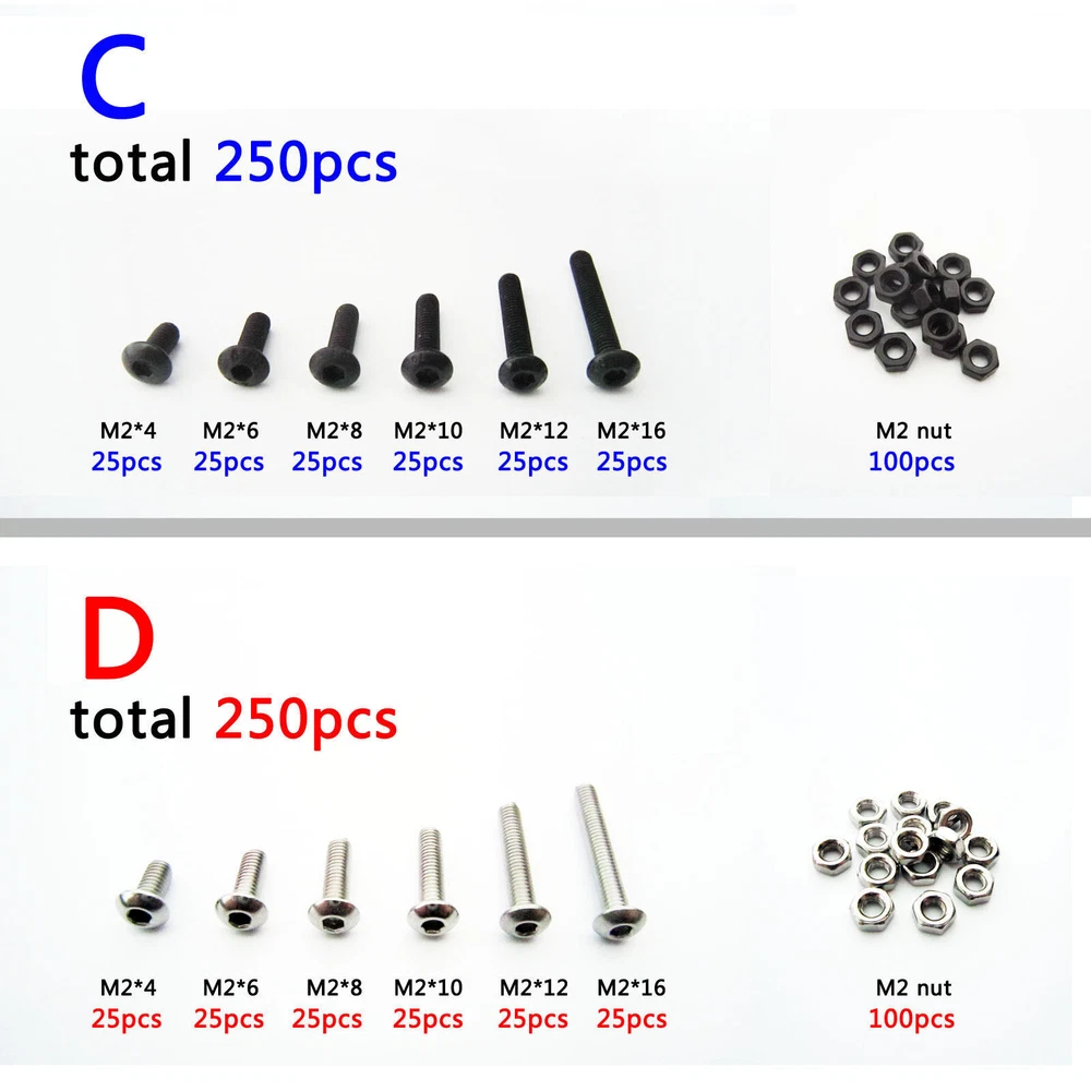 There are 250pcs assortment kit Metric Thread high quality 10.9class steel / 304 stainless steel button head hex socket screws and nuts Package: Set A / Set B M3*6, M3*8, M3*10, M3*12, M3*16, M3*20 each size 25pcs + M3 nut 100pcs =total 250pcs Set C / Set D M2*4, M2*6, M2*8, M2*10, M2*12, M2*16 each size 25pcs + M2 nut 100pcs =total 250pcs Description: Material:10.9 class steel / 304 stainless steel Screw size: D(thread diameter) x L(thread length) Metric thread diameter: M3 (3mm) / M2 (2mm) Metric thread pitch: 0.5mm(M3) /0.4mm(M2) On Dec 14, 2024 at 19:27:47 PST, seller added the following information: