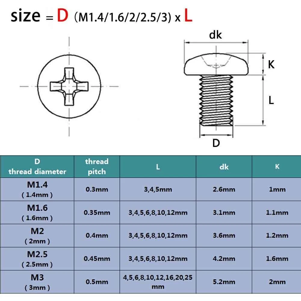 There are 25/50/100pcs high quality carbon steel metric thread phillips pan head screw/hex nut Screw Description: Material: carbon steel Color: Black ( balck zinc-plated) Size: D(thread diameter) x L(thread length) Metric thread diameter: M1.4(1.4mm)/M1.6(1.6mm)/M2(2mm)/M2.5(2.5mm)/M3(3mm) Metric thread pitch0.3mm(M1.4)/0.35mm(M1.6)/0.4mm(M2)/0.45mm(M2.5)/0.5mm(M3) Thread length: 3mm,4mm,5mm,6mm,8mm,10mm,12mm,16mm,20mm,25mm Nut Description: Material: carbon steel Color: Black ( balck zinc-plated) Size: M1.4/M1.6/M2/M2.5/M3 Metric thread pitch0.3mm(M1.4)/0.35mm(M1.6)/0.4mm(M2)/0.45mm(M2.5)/0.5mm(M3) On Dec 14, 2024 at 22:46:43 PST, seller added the following information: