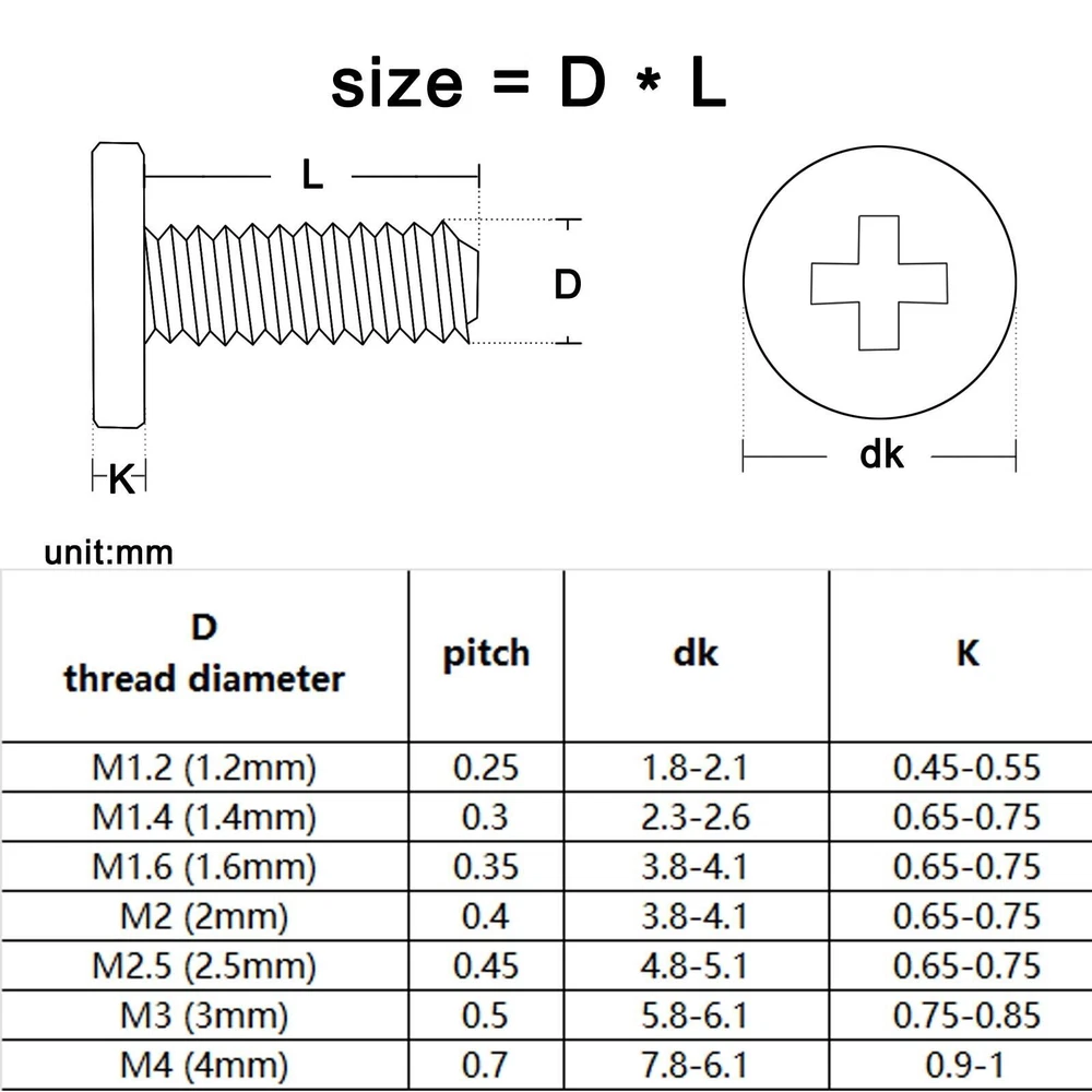There are 25/50pcs high quality metric threaded phillips flat head machine screws Material: steel Surface:plated (black / silver) Size: Size=M1.2/M1.4/M1.6/M2/M2.5/M3/M4* L(thread length) Thread diameter: M1.2(1.2mm) / M1.4(1.4mm) / M1.6(1.6mm) / M2(2mm) M2.5(2.5mm) /M3(3mm) / M4(4mm) Thread pitch: 0.25mm(M1.2) / 0.3mm(M1.4) / 0.35mm(M1.6) /0.4mm(M2) 0.45mm(M2.5mm) / 0.5mm(M3) / 0.7mm(M4) On Dec 14, 2024 at 22:21:08 PST, seller added the following information: