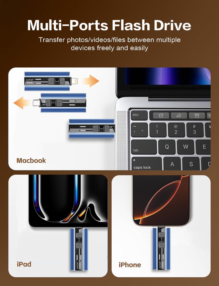 Do you want to make your Phone more convenient? Are you tired of your Phone running out of memory? Do you want to keep enough Phone memory during your trip? Plug and Play, No Application Required! Never lose important documents, videos, photos again thanks to large and reliable Phone flash drives. Free up iPhone and iPad Memory Space Immediately If your iPhone or iPad has almost used up all the memory space, this iPhone USB storage flash drive can help alleviate 256GB of storage space. Whether you like to shoot short videos or take selfies, our iPhone memory stick are perfect for you. Quickly Backup Without Using iTunes or Cloud You can easily backup and manage files at any time. No need of iTunes or Cloud, manage files, pictures and videos through the mobile app to quickly backup to iPhone flash drive, save the storage space of the mobile phone, and at the same time, operations such as forwarding files on the USB drive can be performed. Plug and Play Share your photos, videos, songs and other files between iPhone picture stick easily. You don't have to pay extra for additional storage, just insert iPhone external storage and enjoy the extra space of your flash drive. High Transfer Speed Smart and upgraded chip with high efficiency and stability. read speed up to 30MB/s and write speed up to 15MB/s. The upgraded chip provides you with more efficient storage experience. How to Transfer for iPhone iPad Requires iOS 13 and higher: Simply insert the flash drive into your iPhone iPad, then go to the "Files" app to find "Untitled" and move files to your iPad or iPhone as needed. How to Transfer for Android Android phones need to support OTG, and flash drives can be found in the “File Manager” of most Android devices. 【Plug and Play, No Application Required, Instantly Increases iPhone and iPad Memory Space】If you almost used up all space on your iPhone or iPad, this photo stick for iPhone helps to expand your memory at full storage with 256GB. And usb memory stick for photos is also a great partner for traveling photographers editing on iPad. Using this memory device for your iPhone, iPad or Computers, no worries with the iPhone storage anymore! 【Multi-Port USB Drive】The 3 IN 1 phone photo stick with USB-C Port/ USB-L Port/ USB Port (Independent interface), which is more convenient for data transfer between different devices, so as to get rid of the data cable and iTunes and iCloud, let you switch easily storage space. The Phone thumb drive is designed for use with a wide range of devices, Compatibility iPhone 16/15/14/13/12/11/8/7/6S/SE/XR/XS/XS Max/X Series/iPad Air Series/iPad Pro Series. Also support Android smartphones/Computers and other devices with USB-C Ports. (Tip: For iPhone system version requires iOS 13 or higher, For Android smartphones need to open OTG function) 【Watch Movies, Photos and Play Music Directly From Phone Flash Drive】Store your favorite videos, audios and music on your iPhone's Photo Stick, then seamlessly plug and play on your iPhone or iPad anytime, anywhere. No more need for Internet or WiFi. This iPhone storage device plays videos in many different formats.Pictures stored on the Phone storage device also support different formats. Great way to store all your pictures and videos on an phone external storage device. 【High Transfer Speed】Transfer photos, videos, and files in seconds with our USB stick. With a write speed of up to 15 MB/s and a read speed of up to 30 MB/s, our flash drive for iphone have higher performance than conventional usb storage flash drive. Save time and get more done with iphone photo storage stick. Enjoy the whole relaxing trip with never stuttering or buffering video play on the go. (Tip: No Third-Party Apps Required, Simply insert the flash drive into the iPhone iPad and go to "Files" app) 【How to transfer in iPhone iPad】Requires iOS 13 and higher: Simply insert the flash drive into your iPhone iPad, then go to the "Files" app to find "Untitled" and move files to your iPad or iPhone as needed. 【How to transfer in Android Phones】Android phones need to support OTG, and flash drives can be found in the “File Manager” of most Android devices. 【Kindly Note】1) For Flash Media Devices, 1 megabyte = 1 million bytes; 1 gigabyte = 1 billion bytes. Actual useable capacity may vary. Some of the listed capacity is used for formatting and other functions, and thus is not available for data storage. 2) Up to 30MB/s read speed, write speed is lower. Based on internal testing; performance may be lower depending on the host devices and user’s settings and configurations. 【Kindly Note】The phone case may prevent the proper connection between a phone and a usb flash drive, which could result in the phone being unable to recognize the usb flash drive. In this situation, please do not conclude that the usb flash drive cannot be used, remove the phone case and try again. 【Reliable After-Sales Service】Experience the convenience of high-quality USB memory stick and enjoy our premium customer service at the same time. For the phone flash drive, if you have any questions, we are willing to provide help.