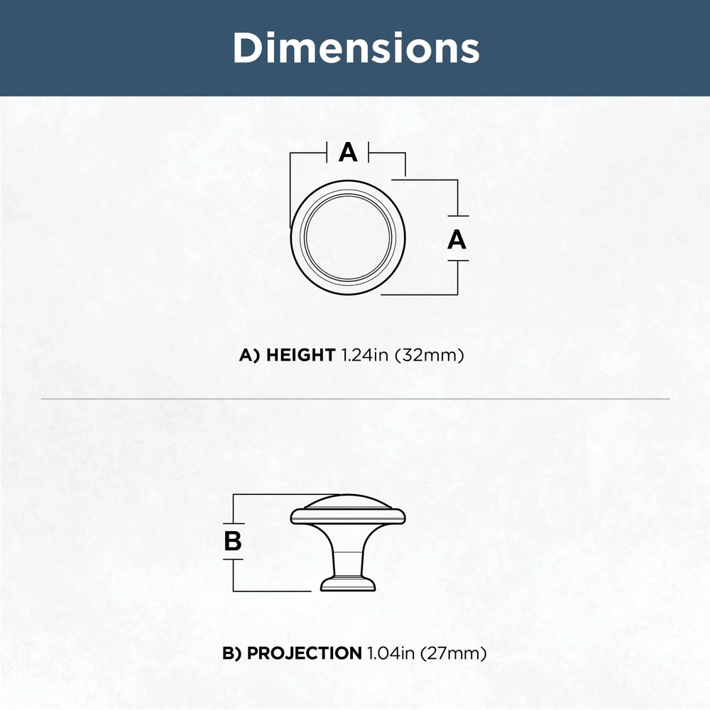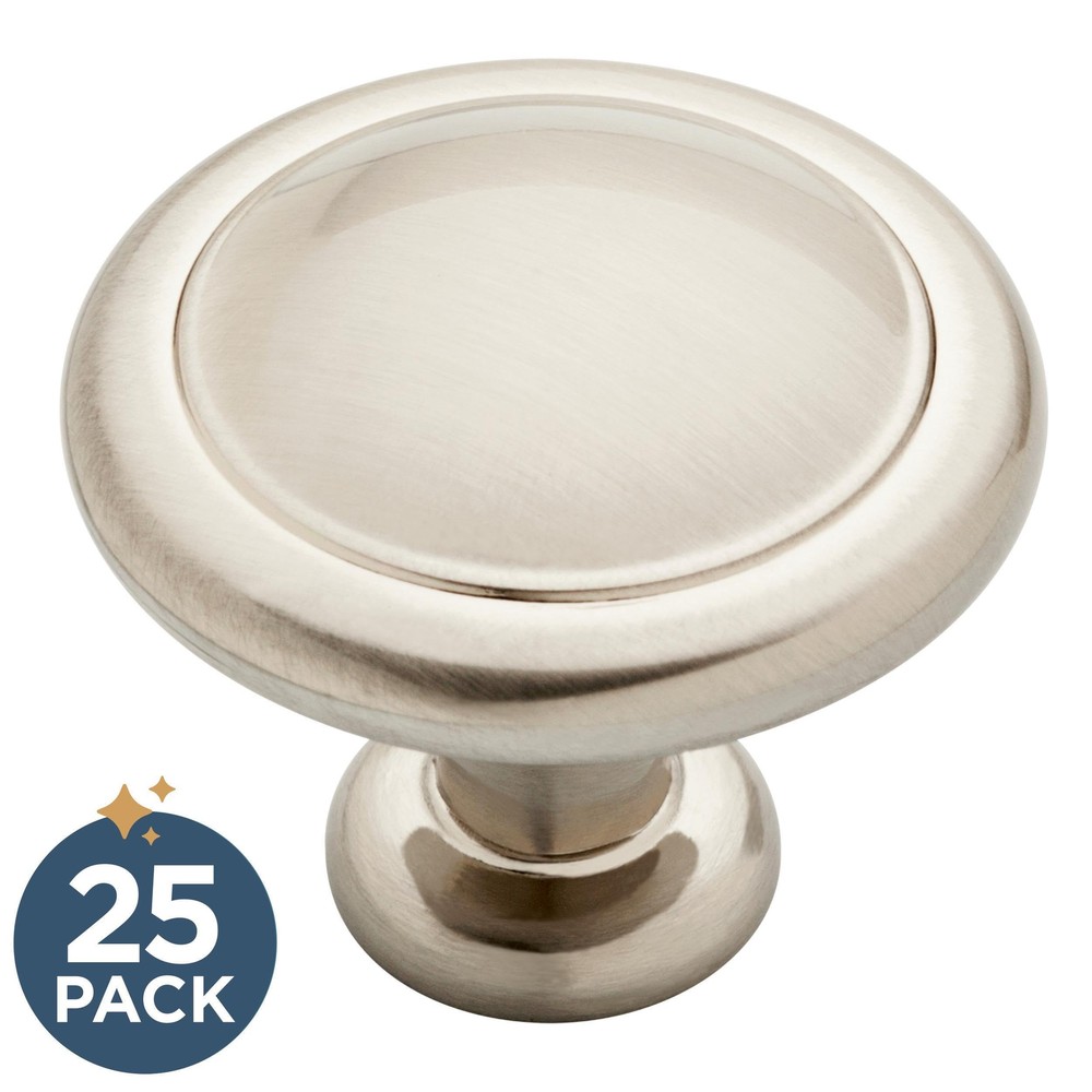 The Round Ringed cabinet knob collection makes it easy to give an updated look to your kitchen, bathroom, office, or furniture. The Classic cabinet handle design makes it the perfect addition to your cabinets, desk, and even dresser drawers. Available in multiple finishes and pack sizes to fit any home decor project and cabinet hardware style. STYLE: Easily update your kitchen and bathroom cabinets or furniture with our classic cabinet hardware collection. MATERIAL: Our satin nickel finish provides a complimentary tone to the brass handles. SIZING: The collection of 1-1/4 in (32 mm) kitchen cabinet drawer knobs comes in a pack of 25, so you can make your cabinet upgrades in bulk. DURABLE: We work with highly durable materials to ensure your cabinets and drawers are equipped with top quality hardware that will last for years. EASE OF USE: Our round ringed kitchen cabinet drawer knobs are specially designed for easy installation and use.