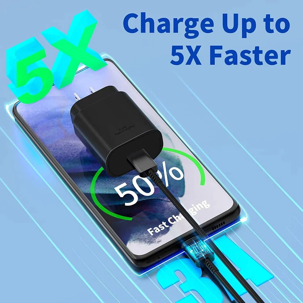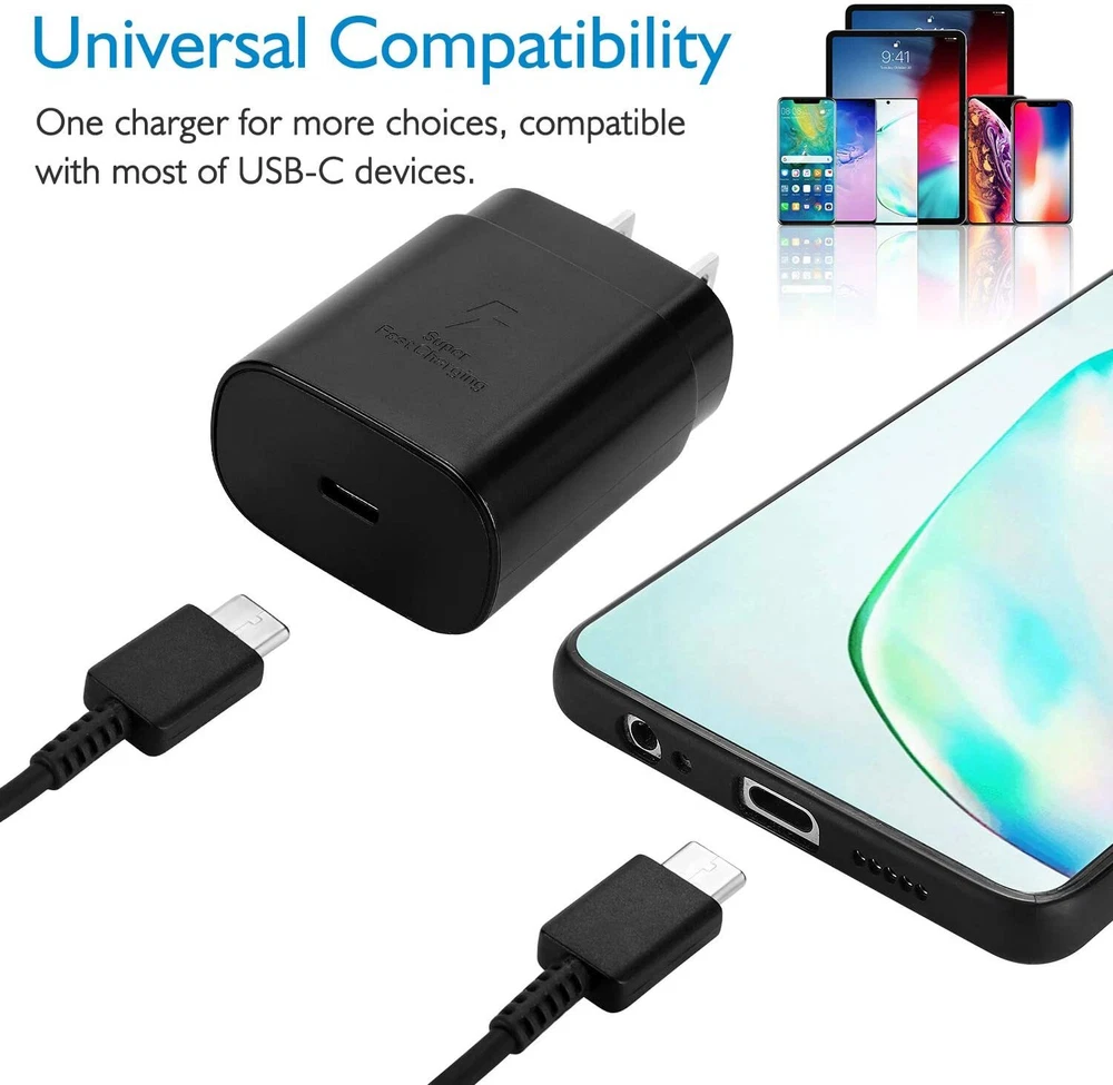 Feature : 1.This is a USB-C to USB-C cable NOT USB-C to USB-A cable, so you need a USB C wall charger to charge your device. 2. For ensure the charging speed of your device, please use the original USB C port wall charger, or other high quality charger which can support QC 2.0/3.0 and USB PD fast charging. 3. It is a charging and data cable not Thunderbolt 3 cable so it can not output video. 4. Supports Qualcomm Quick Charge and USB Power Delivery Charge. Also compatible with Thunderbolt 3 port. 5. These cables are designed according to the USB 2.0 specification. The actual transmission speed is within 480 Mbps( 60 MBps) , so it cannot reach the speed of usb 3.0 (5 Gbps). 25W Fast Wall Charger: [ 25W Rapid Charging ] PD3.0 Power Delivery Technology guarantees an optimized and fast safe charging experience (25W) for all Samsung Galaxy devices. [ Broad Compatibility ] The USB C charger charges majority of USB Type-C and PD devices and non-PD Devices at full speed. Provides up 25W fast charge. [ Dependable Protection ] With the intelligent chip inside, it matches the current as your device's need automatically. Over-current, over-voltage and short-circuit protection effectively protect your devices from damage and ensure the safer charging overnight. [ Slim & Compact ] Small, lightweight and convenient store in your bag and carry. Connectors: Type C to Type C Cable length :3FT Color: Black Compatible With: For Samsung Galaxy S10/Note 10/S20 / Note 20 For MacBook 2016/2017 For Macbook Air 2018 For MacBook Pro 13.3'' For iPad Pro 11'' (2018)/12.9'' (2018) For Google Pixel 2/2XL/3/3XL For Nexus 6P For Huawei P20/P30/Mate 20/Matebook