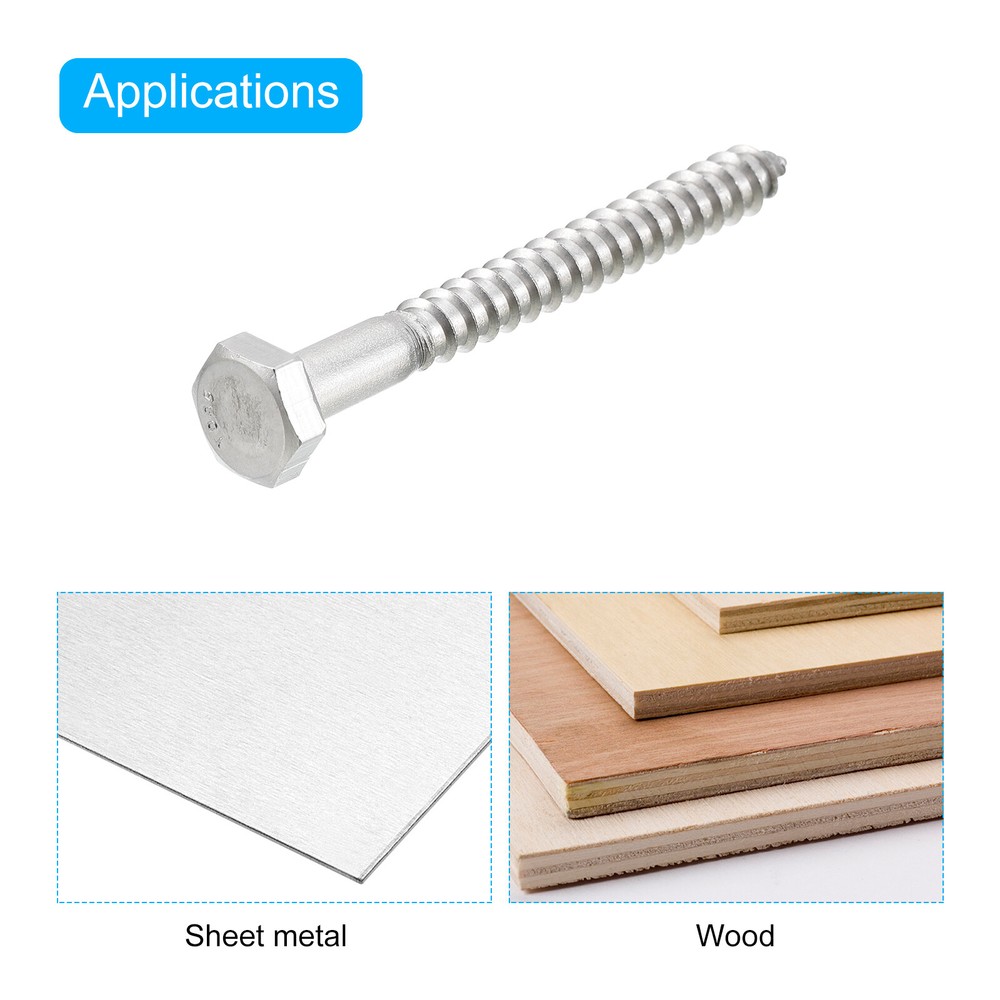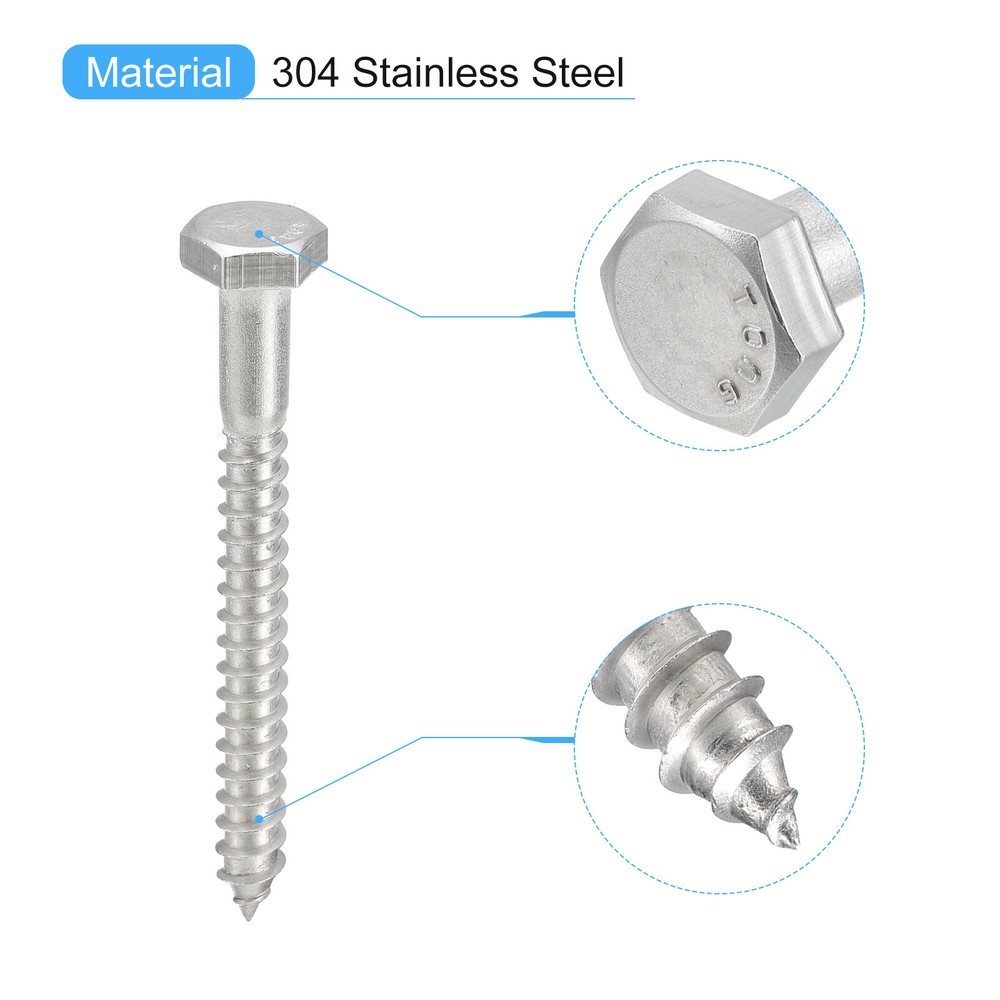 Document 1. Hex lag screws, also known as lag bolts, are wooden fasteners commonly used in construction projects such as building decks, fences, docks, bridges and other outdoor structures. They are hexagonal in shape with a pointed tip and have coarse threads making them strong and durable. They have a high level of holding power and are resistant to vibration and loosening.2. Made of 304 stainless steel material, which is corrosion-resistant and oxidation-resistant, ensuring that the bolts can withstand pressure and tension without deformation or breakage. The pickling passivation surface treatment gives the bolts a clean, beautiful and shiny finish.3. The hex self-tapping screws can be installed quickly and easily with a socket wrench or a hex wrench.4. Hex head lag screws can be used in a variety of applications including wood to wood, wood to concrete, and other heavy construction projects such as bridge building, dock building, deck building, shelving, furniture building, etc.Tips: To prevent splitting, drill a guide hole slightly smaller than the screw.Specification:Material: 304 Stainless SteelSurface Treatment: Pickling PassivationThread Size: 1/4" x 2-1/2"Threads Per Inch: 20Hex Head Size: 11 x 4.2mm / 0.43" x 0.17"(W*T)Package Content: 25pcs x Hex Lag Screws Hex Head Lag Screws Bolts, 25pcs 1/4" x 2-1/2" 304 Stainless Steel Wood Screws 1. Hex lag screws, also known as lag bolts, are wooden fasteners commonly used in construction projects such as building decks, fences, docks, bridges and other outdoor structures. They are hexagonal in shape with a pointed tip and have coarse threads making them strong and durable. They have a high level of holding power and are resistant to vibration and loosening. 2. Made of 304 stainless steel material, which is corrosion-resistant and oxidation-resistant, ensuring that the bolts can withstand pressure and tension without deformation or breakage. The pickling passivation surface treatment gives the bolts a clean, beautiful and shiny finish. 3. The hex self-tapping screws can be installed quickly and easily with a socket wrench or a hex wrench. 4. Hex head lag screws can be used in a variety of applications including wood to wood, wood to concrete, and other heavy construction projects such as bridge building, dock building, deck building, shelving, furniture building, etc. Tips: To prevent splitting, drill a guide hole slightly smaller than the screw. Specification: Material: 304 Stainless Steel Surface Treatment: Pickling Passivation Thread Size: 1/4" x 2-1/2" Threads Per Inch: 20 Hex Head Size: 11 x 4.2mm / 0.43" x 0.17"(W*T) Package Content: 25pcs x Hex Lag Screws Hot Item Payment 1.We accept eBay payment . 2.Payment must be received within 7 business days of auction closing. Shipping 1.We ship to your eBay or Paypal address. Please make sure your eBay and Paypal address is correct before you pay. 2.Items will be shipped within 1-3 business day when we received payment. 3.Delivery time depends on destination and other factors. Description Policy Hex Head Lag Screws Bolts, 25pcs 1/4" x 2-1/2" 304 Stainless Steel Wood Screws 1. Hex lag screws, also known as lag bolts, are wooden fasteners commonly used in construction projects such as building decks, fences, docks, bridges and other outdoor structures. They are hexagonal in shape with a pointed tip and have coarse threads making them strong and durable. They have a high level of holding power and are resistant to vibration and loosening. 2. Made of 304 stainless steel material, which is corrosion-resistant and oxidation-resistant, ensuring that the bolts can withstand pressure and tension without deformation or breakage. The pickling passivation surface treatment gives the bolts a clean, beautiful and shiny finish. 3. The hex self-tapping screws can be installed quickly and easily with a socket wrench or a hex wrench. 4. Hex head lag screws can be used in a variety of applications including wood to wood, wood to concrete, and other heavy construction projects such as bridge building, dock building, deck building, shelving, furniture building, etc. Tips: To prevent splitting, drill a guide hole slightly smaller than the screw. Specification: Material: 304 Stainless Steel Surface Treatment: Pickling Passivation Thread Size: 1/4" x 2-1/2" Threads Per Inch: 20 Hex Head Size: 11 x 4.2mm / 0.43" x 0.17"(W*T) Package Content: 25pcs x Hex Lag Screws Hot Item Payment 1.We accept eBay payment . 2.Payment must be received within 7 business days of auction closing. Shipping 1.We ship to your eBay or Paypal address. Please make sure your eBay and Paypal address is correct before you pay. 2.Items will be shipped within 1-3 business day when we received payment. 3.Delivery time depends on destination and other factors.