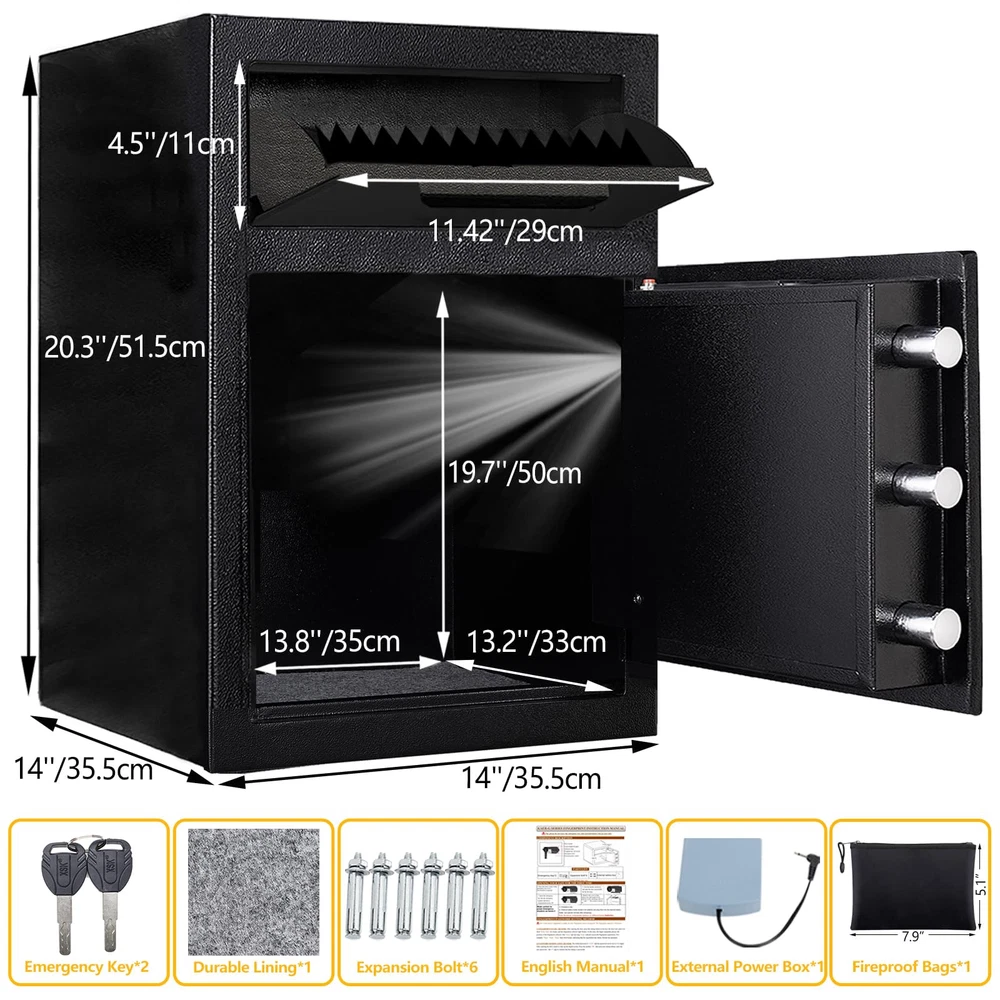 đ°ă2.6 CUB DROP SLOT BUSINESS SAFEăLarge cash safe comes with drop slot, any shift employees are allowed to put large volumes of deposit inside faster without keys. Meanwhile manager can access by password or key to check, which is secure and well prevents internal theft in your job. Spacious interior is ideal to protect cashier report envelope, coin, night money, bill slips, check payment, files from theft for hotel, motels, bank counter, cab, cafĂ©, restaurants, office, retail businesses, etc. đ°ăANTI-FISHING DESIGN+THICKENED SOLID STEEL PANELăAnti-fishing baffle is deep and long, moreover not only there is a row of big jaggecaja fuerte edge teeth at the drop end, but also a small jagged edge teeth edge above the door. Both effectively prevent thieves from fishing out your valuables. Safe with drop slot adopts 10mm door panel, more stronger than traditional hollow. 26mm solid lock bolts, concealed pry-resistant u-shaped hinges, theyâre excellent in anti-break-in and anti-collision. đ°ăLED LIGHT+SILENT FUNCTION+120° OPEN DOORăYou will get a drop slot safe: â The LED light will light up automatically to help you enter the code.⥠Press 1 to turn on the mute function to provide you with security in case of danger. âą 120° oversized opening, wider and more convenient to put in items than the old 90° safe opening. âŁThe triangular metal handle is more solid and textured; â€The gray lining is soft and scratch-resistant. Come on and have a try with this useful and secure safe. đ°ă2 WAYS TO OPENăâ Emergency key+knob (first use, forgotten password, low battery). âĄPassword+handle (quick access, 3-8 any digits). Green: unlock or promptl light, Yellow: wrong password , Red: low battery indicator. If you enter wrong password for three times, the alarm will âdidiâfor 20 seconds. Please donât worry, solution: open with emergency key and take out a battery, then the alarm can be released immediately (Note: not included 4 AA alkaline batteries). đ°ăEASY WALL GROUND MOUNTINGăThere are 4 holes back and 2 holes bottom of the depository safe and comes with 6 mounting bolts, the hidden safe can be installed in the concrete slab or wooden wall. This increases the anti-theft coefficient. Owing to good concealment and classic black, which easily integrates into your home and workplace and widely serve in many social place. Such as, safe box for home, night money drop box, lost and found box, love coin box, election box, collection safe, etc. đ°ăPERFECT AFTER-SALES SERVICEă â In order to deliver it to you faster and better, we have upgraded the packaging of the product many times to reduce the risk. ⥠If you have any questions after receiving the product, please contact us, we will quickly and professionally for you to solve. đ°ăWATERPROOF FIREPROOF BAGăOur safe box comes with a waterproof and fireproof document bag, you can use it to store cash, jewelry and important documents, protecting your valuables from fire, hurricanes and earthquakes.