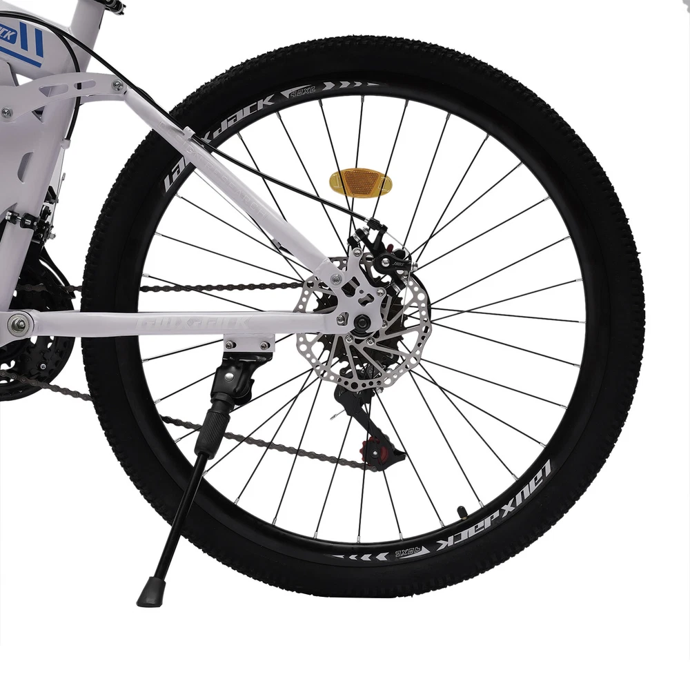 Specification Color: Blue, White Material: Carbon Steel Surface Treatment: Electrostatic Baking Paint Whether to Fold: Yes Frame Structure: Folding Car Frame Type: Hard Frame Pedal Type: Normal Pedals Front Fork Type: Spring Fork (Low Gear Without Damping) Brake Type: Front and Rear Mechanical Disc Brakes Braking System: Hydraulic Disc Brake (Hydraulic Brake Pad), Wire Pull Disc Brake (Finger Force Brake) Propulsion Mode: Chain Applicable Gender: Universal Load Capacity: 120kg/ 264.55lbs Bike Length: 172cm/ 67.71in Distance Between Handlebar and Ground: 106cm/ 63in Wheel Diameter: 65cm/ 25.6in Saddle to Ground Distance: 80-95cm/ 31.5-37.4in Folded Size: 95*35*100cm/ 37.4*13.77*39.37in Package Size: 135*72*19cm/ 53.15*28.35*7.48in Net Weight: 21kg/ 46.3lbs 26" Folding Mountain Bike 21 Speed Men Bikes MTB Bicycle School Dual Disc Brake Description Do You Want to Make Traveling More Environmentally Friendly, Healthier, and More Convenient? Then This 26" Mountain Folding Bike with 21-Speed Gears Is for You. It Allows You to Enjoy Eco-friendly and Safe Travel While Increasing Your Exercise. Imagine, on a Rest Day, Cycling Around with Three or Two Friends, Isn't It a Good Way to Soothe Your Tired Body and Mind and Enhance Your Physical Fitness? Key Features Healthy Living: Compared to Traveling by Car, Cycling Can Help You Exercise. It Not Only Helps You to Strengthen Your Muscles and Bones but Also Helps You to Lose Weight Effectively and Have a Healthy Body! Environment Friendly: Traveling by Bike Does Not Require Fuel or Gasoline and Does Not Produce Harmful Gases During the Ride, Making It an Environmentally Friendly Way to Travel. in Other Words, It Also Does Not Incur Additional Costs and Is Economical and Affordable. 21-Speed Bike: Its Main Wheel Has 3 Discs and the Driven Wheel Has 7 Discs, You Can Choose to Hang on Different Discs of the Main and Driven Wheels to Get 21 Different Speeds to Facilitate Your Ride. Precision Shifting: It Has a Precision Shifting Front and Rear Chainstay That Gives You Precise Shifting for Different Terrain. the Precision 21-Speed Mountain Bike Gives You a Smooth Shifting Experience. Strong Load-bearing Capacity: Its Triangular Frame Design and Thickened and Thickened Tube Type Make It Have a Good Weight-bearing Capacity of 120kg/ 264.55lbs. Adjustable Saddle Height: Its Saddle Can Be Adjusted Between 80-95cm/ 31.5-37.4in, so You Can Adjust the Height According to Your Comfort. Good Damping Effect: Its Shock-absorbing Frame and U-shaped Shock-absorbing Fork Give It a Stronger Damping Effect, Which Can Effectively Relieve the Pressure on Your Hands and Shoulders Caused by Intense Riding. Safe Riding: It Is Designed with Double Disc Brakes, Which Can Make the Brakes More Sensitive and Smooth, Allowing You to Enjoy Riding a Safe Ride. Comfortable Riding: It Has an Ergonomically Designed Saddle and Handlebars, so You Can Ride Easily. the Comfortable Saddle with Foam Will Keep You Feeling Comfortable Even After Long Hours of Use. Space-saving: When Folded, Its Size Is Only 37.4*13.77*39.37in, You Can Fold It up and Put It in the Garage, Trunk, Etc. to save Space When You Are Not Using It. Durable Material: It Is Made of Thickened High Carbon Steel Material, Which Has Strong Corrosion Resistance and Load-bearing Capacity, Making It Very Stable to Ride and Not Easy to Damage at the Same Time. Ideal Gift: the Blue and White Color Scheme Makes It Vibrant, Making It a Fashionable Piece and an Ideal Gift for Friends, Kids, and Family on Occasions Such As Birthdays, Christmas, Thanksgiving, Graduation, and School Advancement. Customer Service: We Aim to Provide Quality Products and Services. If You Have Any Problems, Please Feel Free to Contact Us. We Will Reply and Solve the Problem for You As Soon As Possible. Details Variable Speed Positioning Chain: It Uses a Variable Speed Positioning Chain, Which Is Not Easy to Drop the Chain During the Ride and Can Make the Gear Shift More Sensitive. Lockable Fork: You Can Choose to Lock the Fork or Not Depending on the Road Conditions. the Locked State Is Suitable for Smooth Roads or Uphill and Downhill. the Non-locked State Is Suitable for Outdoor Bumpy Roads Such As Off-road. Folding Clip : It Comes with an Aluminum Folding Clip, Strong and Durable, but Also Convenient for You to Quickly Fold It. Large Footrest: Its Footrest Is Made of Pc Environmental Protection Material and Enlarged Design, so That You Feel Good Pedaling While Not Easy to Wear and Tear and Can Be Used for a Long Time. Electrostatic Baking Paint: Its Surface Uses Electrostatic Baking Paint Technology, Making It More Beautiful While Also Enhancing Its Anti-corrosion and Wear Resistance. Application It Is a Real Everyday Hero, Suitable for Daily Use, the Way to Work, but Also for Touring in the Mountains, and General Outdoor Riding. Thanks to the High-quality Gearing, You're Guaranteed to Mountains with Your Mountain Bike! Specification Color: Blue, White Material: Carbon Steel Surface Treatment: Electrostatic Baking Paint Whether to Fold: Yes Frame Structure: Folding Car Frame Type: Hard Frame Pedal Type: Normal Pedals Front Fork Type: Spring Fork (Low Gear Without Damping) Brake Type: Front and Rear Mechanical Disc Brakes Braking System: Hydraulic Disc Brake (Hydraulic Brake Pad), Wire Pull Disc Brake (Finger Force Brake) Propulsion Mode: Chain Applicable Gender: Universal Load Capacity: 120kg/ 264.55lbs Bike Length: 172cm/ 67.71in Distance Between Handlebar and Ground: 106cm/ 63in Wheel Diameter: 65cm/ 25.6in Saddle to Ground Distance: 80-95cm/ 31.5-37.4in Folded Size: 95*35*100cm/ 37.4*13.77*39.37in Package Size: 135*72*19cm/ 53.15*28.35*7.48in Net Weight: 21kg/ 46.3lbs Package Included 1* 26" Mountain Folding Bike 1* Graphic Installation Manual Notes Please Allow the Slight Color Difference Caused by the Shooting Light and 1-3 Cm Error Due to Manual Measurement, and Make Sure You Do Not Mind Before Ordering. Instructions:not included,please contact selle