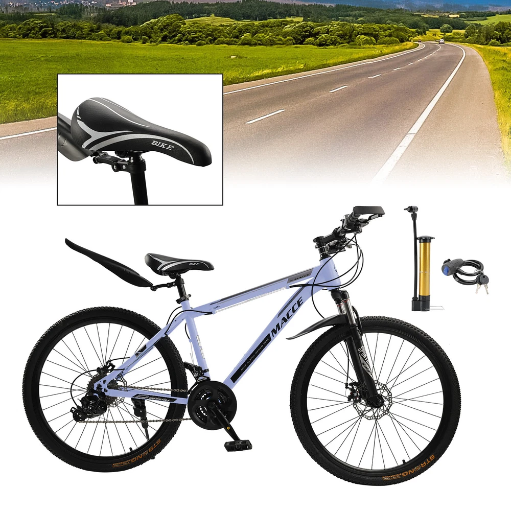 This mountain bike is a fantastic ride! The 27-speed gears make climbing hills smooth, and the double disc brakes provide reliable stopping power. The high-carbon steel frame feels sturdy yet lightweight, and the suspension handles rough trails with ease. Love the sleek blue design—it looks as good as it performs. Assembly was straightforward, and it arrived well-tuned. Perfect for both men and women who want a durable, stylish MTB for adventure!