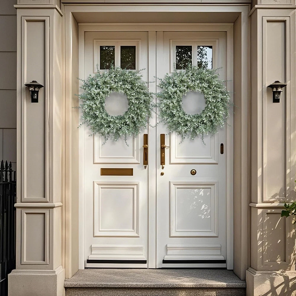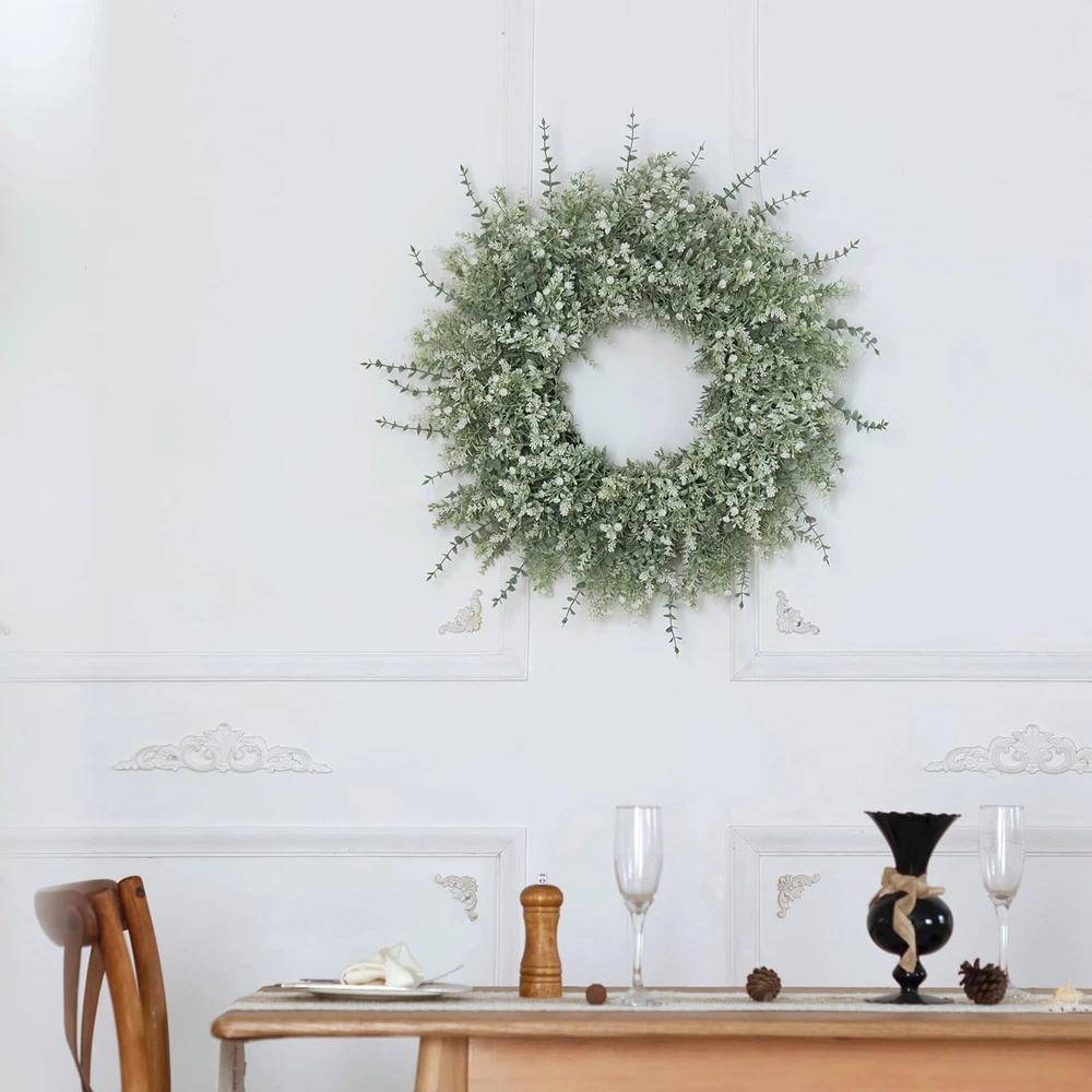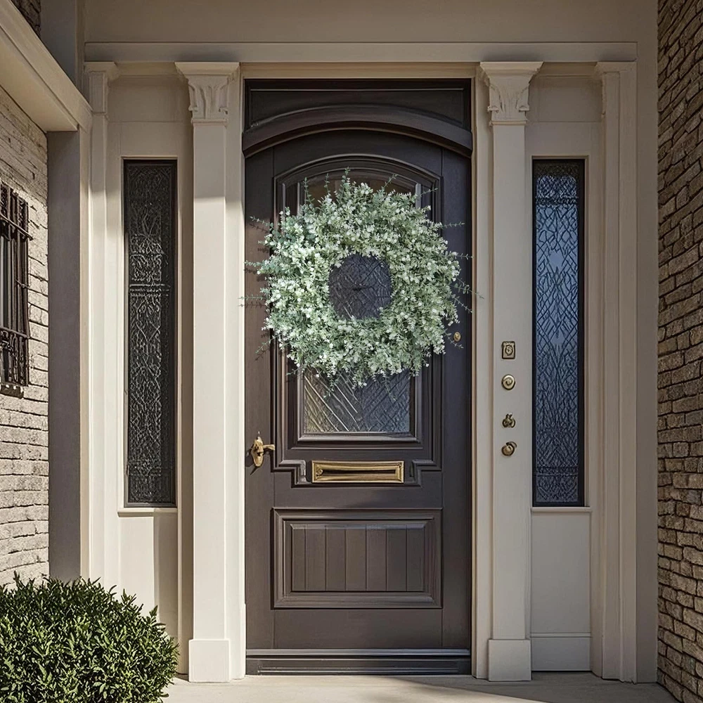 26'' Large Eucalyptus Wreath for Front Door, Porch, Window [Full and Lifelike Wreath] : This wreath is made from eucalyptus leaves and lavender with white babys breath flowers, and we use more leaves to make it look full, vibrant and lifelike. [High Quality Materials] : Our eucalyptus, lavender and babys breath flowers are made of high quality plastic, windproof and waterproof,it won't fade,and can be used for indoor and outdoor decoration, you do not need to worry about its quality. [Size] : With a diameter of 24-26 inches and a height of 26 inches when fully unfolded, this size is ideal for your front door decoration. [Versatile] : This wreath is ideal for all seasons, including front doors, walls, windows, fireplaces, farmhouses, living rooms, porches, central parties, weddings, festivals and celebrations. It will bring a natural and vibrant feel to your home. [Warm Tips]:To prevent the wreath from being damaged during transportation, the wreath decoration is tightened. You can adjust as needed to get the best look.