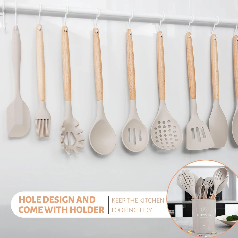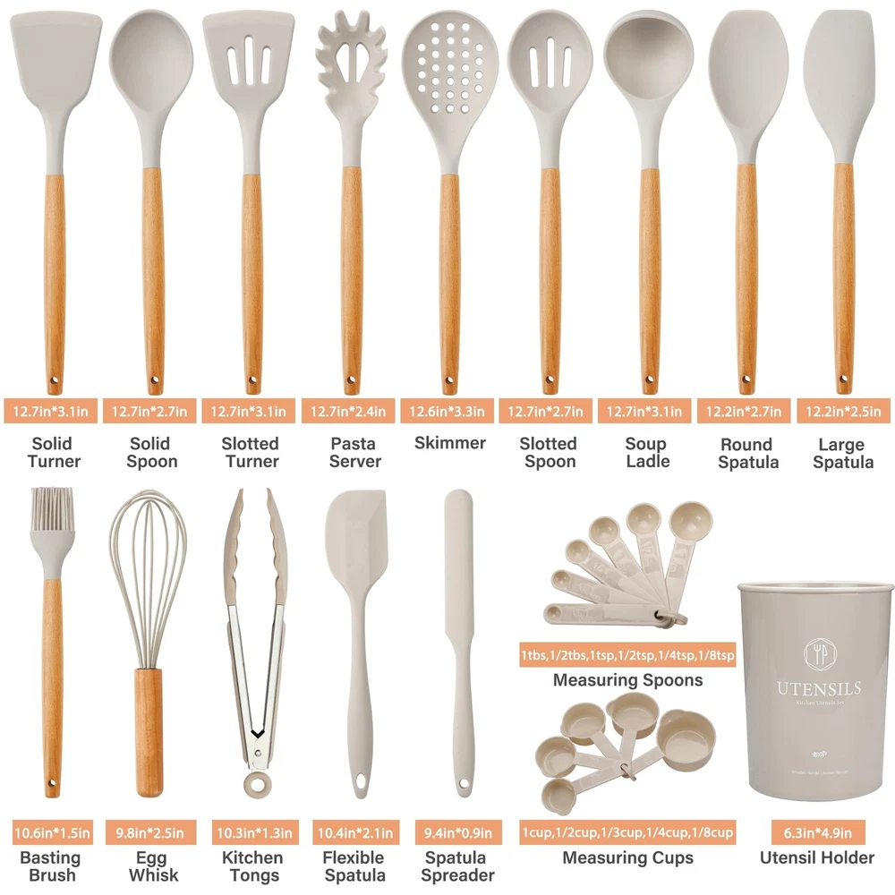 26 PCS KITCHEN UTENSILS SET: We have carefully considered most of the scenarios in which kitchens are used and have handpicked 26 different kitchen cooking utensils set to meet all your cooking needs to cook the perfect dish. Kitchen tongs and spatula set, measuring cups and spoons set, pasta server, solid and slotted turners, skimmer, basting brush, utensil holder, etc. Each piece of silicone utensils for cooking is upgraded to a large size with a perfectly balanced weight and elegant design FOOD GRADE SILICONE COOKING UTENSILS SET: The cooking utensils set is made entirely of odorless food-grade silicone, which is BPA-free and has good scratch resistance to protect the non-stick coating on the cookware and ensure that the cookware surface is not scratched or dented. The silicone kitchen utensils does not react with food or beverages and will not retain odors or colors, you don’t have to worry about the health of your families. And the upgraded silicone thickness for better quality and durability DURABLE & HEAT-RESISTANCE: The kitchen utensils features durable silicone utensil head and ergonomic wooden handle that offer a comfortable grip and heat resistant. This design feature makes cooking more enjoyable and less strenuous on the hands, especially during longer meal preparations. And the silicone kitchen utensils can withstand temperatures up to 446°F/230°C, and they won't melt when stirring food directly in the pan EASY TO CLEAN AND STORE: The higher and stronger welded joints between the silicone cooking utensils and wooden handles eliminate any gaps where food can get trapped, making cleaning a breeze. Simply rinse gently with water. Due to the wooden handle, we don't recommend soaking in water for a long time or dishwasher cleaning. The kitchen cooking utensils set feature hanging holes on the handles to let you hang these to store them without taking much space. The cooking utensils set also come with a holder for storage GREAT KITCHEN TOOLS: Each piece of kitchen utensils offers a perfectly balanced weight and elegant design that will enhance your kitchen decor. From baking and frying to sautéing and grilling, these cooking utensils have proven their worth in various culinary endeavors. The exquisite packaging and reasonable price make it the ideal housewarming gifts wedding gifts, birthday gifts, Christmas gifts, etc. If you have any questions during the purchase or use, please feel free to contact us, we will be happy to help you