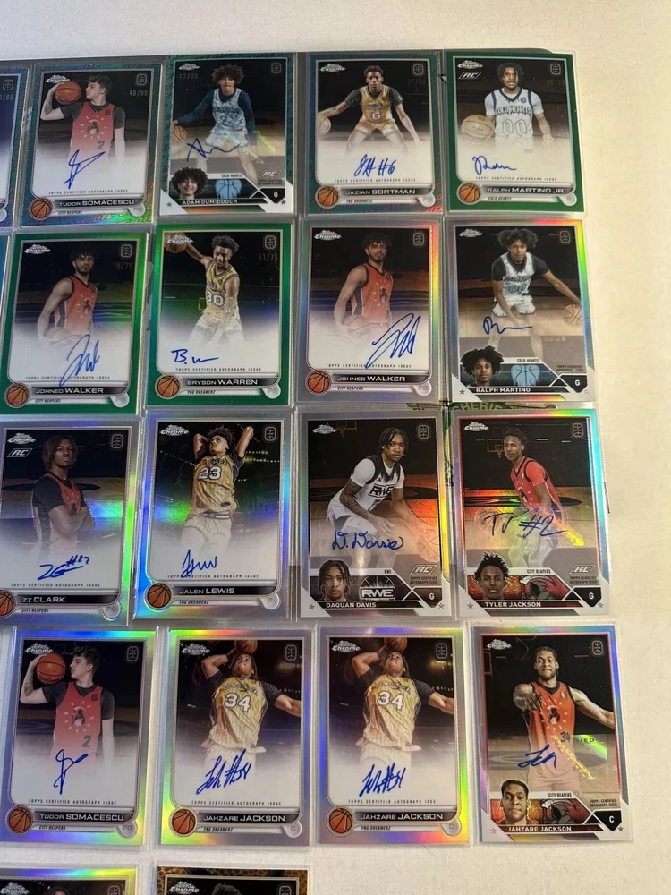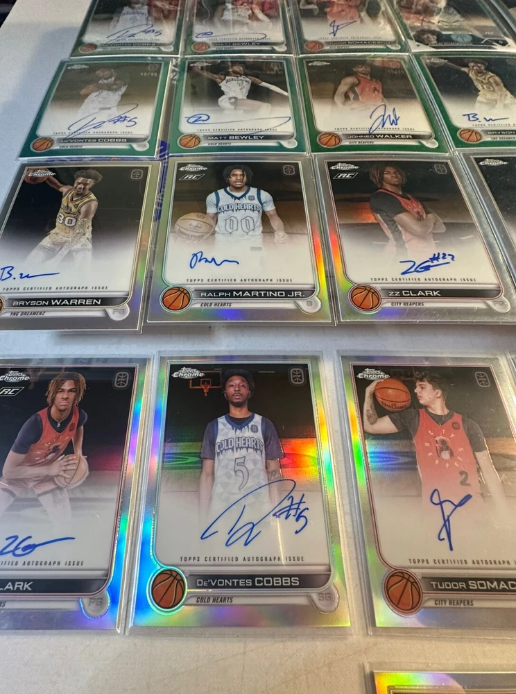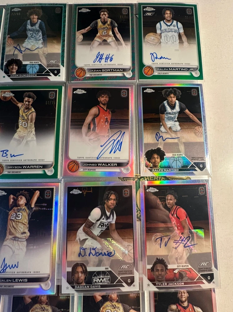2022-24 TOPPS CHROME ote Autographs 1 - /25 orange basketball Bryson warren 3x - #/75 green Ralph martino johned walker Bryson warren 2x - Aqua /99 devonte cobbs matt Bewley 5x - aqua ote /99 Devonte cobbs matt Bewley tudor somacescu jazian gortman adam oumiddoch 15x Silver non numbered – zz clark (2), devontes cobbs, tudor somacesco, jahzare Jackson (4x), tyler Jackson, ralph martino (2x), johned walker, daquan davis, Jalen lewis, Bryson warren