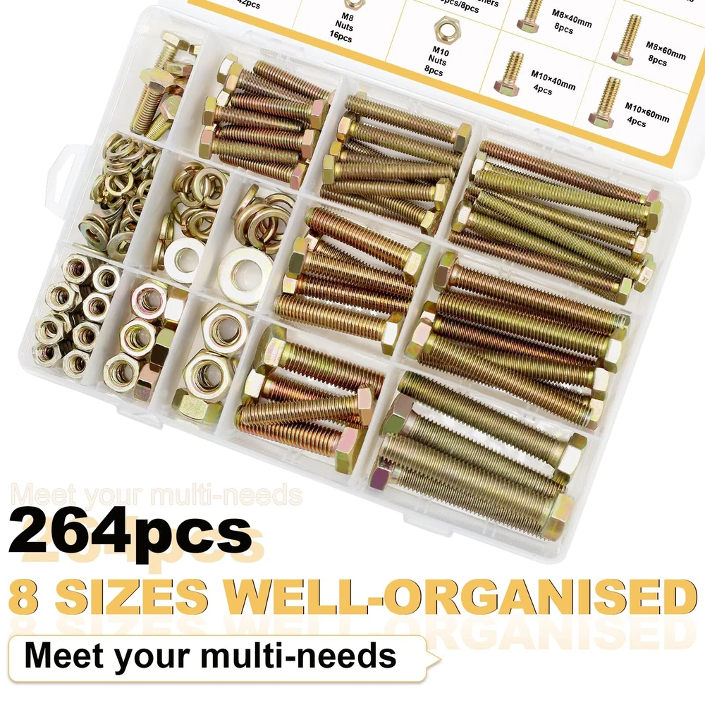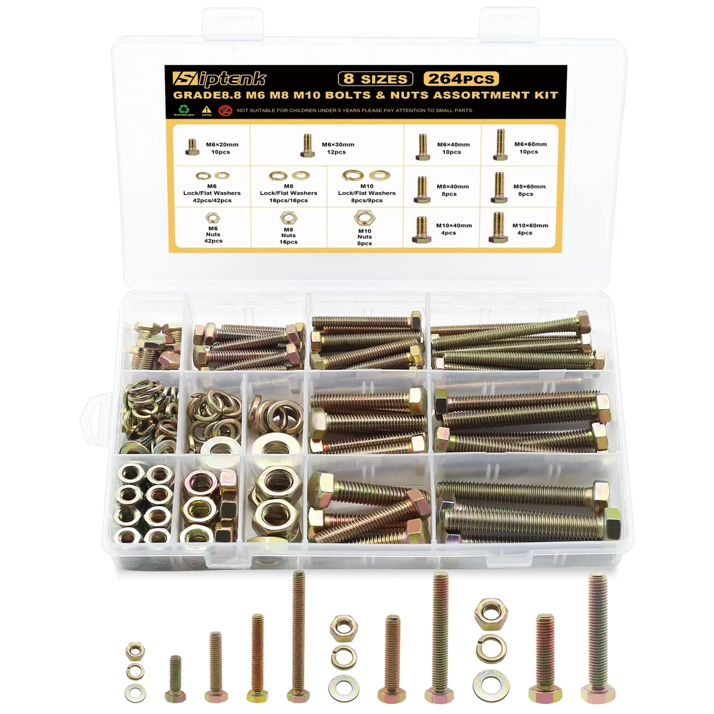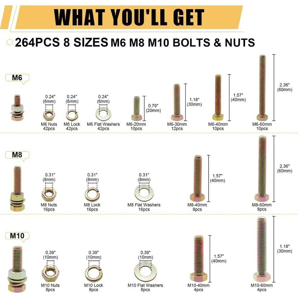 264PCS 8 SIZES M6 M8 M10 NUTS & BOLTS & WASHERS: M6x20 10pcs, M6x30 12pcs, M6x40 10pcs, M6x60 10pcs, M6 Nuts 42pcs, M6 Flat Washers 42pcs, M6 Lock Washers 42pcs; M8x40 8pcs, M8x60 8pcs, M8 Nuts 16pcs, M8 Flat Washers 16pcs, M8 Lock Washers 16pcs; M10x40 4pcs, M10x60 4pcs, M10 Nuts 8pcs, M10 Flat Washers 8pcs, M10 Lock Washers 8pcs. 8.8 HIGH-STRENGTH CARBON STEEL PLATED: The metric screw assortment, made of carbon steel plated with color , are not easy to damage and fade, anti-oxidation and anti-corrosion, no deformation, and can be used for a long time. MORE RELIABLE PACKAGE: The nut & bolt assortment sets are first neatly divided into a plastic storage box. Next, the plastic storage box is covered with a dustproof plastic bag. Then the cushioning foam is added and finally wrapped in a strong cardboard box. EASY TO USE: Bolts and nuts with standard hexagonal allen threads for a wide range of applications and ease of use. Regular household tools make it easy to install screw nuts. It also comes with types of washers for better tightening. PRECISE & CLEAN THREADS: The assorted nuts and bolts, with fine manufacturing process for smooth surface and clear threads without burrs, ensures users have a good purchase experience. A WIDE RANGE & LARGE QUANTITY: The nuts and bolts assortment kit are available in three bolt diameters of M6 M8 M10 and four lengths of 20mm, 30mm, 40mm and 60mm, a total of 8 sizes, and are equipped with enough nuts, flat washers and lock washers, to meet most of your daily needs. WIDE ALLPICATION: The nuts and bolts assortment kit can be widely used in various household appliances, furniture windows and doors, garages, outdoor gazebos, or building pet houses, as well as in the repair of cars, trucks, RVs, lawn mowers, and boats and yachts. AFTER-SALES: If you have any questions about bolts and nuts kit, please feel free to us. We will do our best to help you solve the problem and ensure to provide you with a pleasant shopping experience.