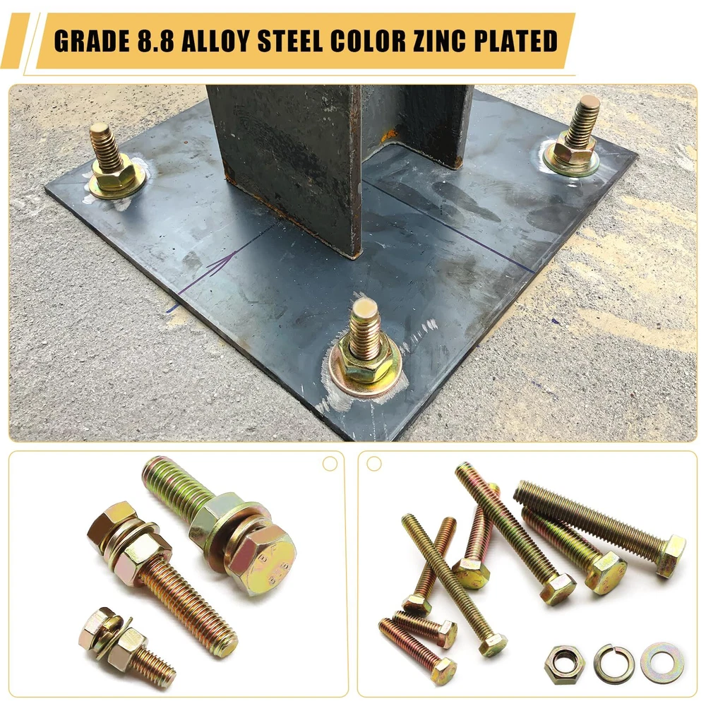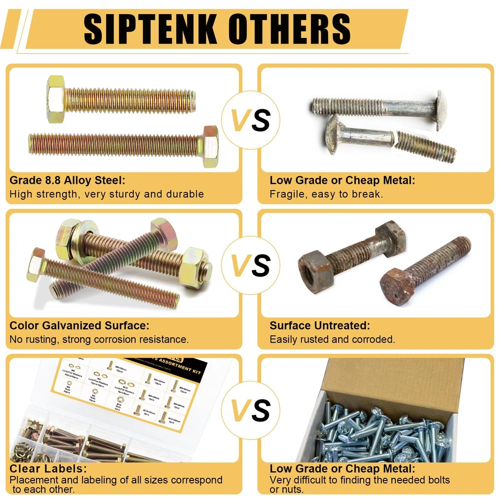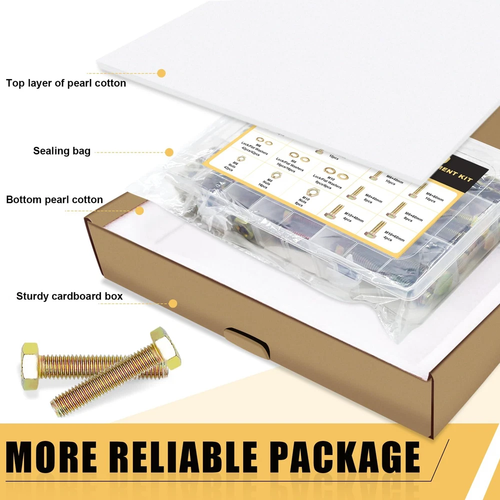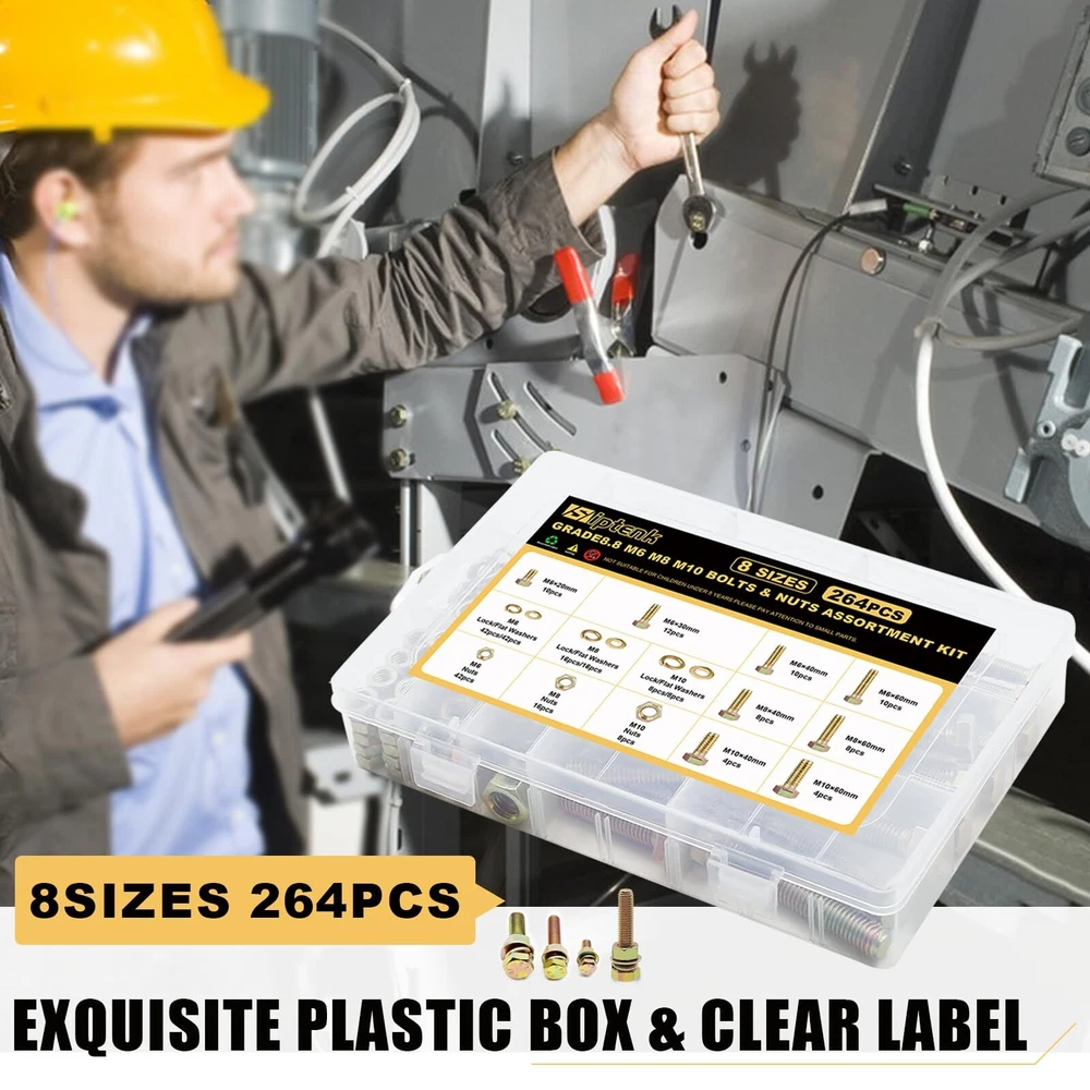 264PCS 8 SIZES M6 M8 M10 NUTS & BOLTS & WASHERS: M6x20 10pcs, M6x30 12pcs, M6x40 10pcs, M6x60 10pcs, M6 Nuts 42pcs, M6 Flat Washers 42pcs, M6 Lock Washers 42pcs; M8x40 8pcs, M8x60 8pcs, M8 Nuts 16pcs, M8 Flat Washers 16pcs, M8 Lock Washers 16pcs; M10x40 4pcs, M10x60 4pcs, M10 Nuts 8pcs, M10 Flat Washers 8pcs, M10 Lock Washers 8pcs. 8.8 HIGH-STRENGTH CARBON STEEL PLATED: The metric screw assortment, made of carbon steel plated with color , are not easy to damage and fade, anti-oxidation and anti-corrosion, no deformation, and can be used for a long time. MORE RELIABLE PACKAGE: The nut & bolt assortment sets are first neatly divided into a plastic storage box. Next, the plastic storage box is covered with a dustproof plastic bag. Then the cushioning foam is added and finally wrapped in a strong cardboard box. EASY TO USE: Bolts and nuts with standard hexagonal allen threads for a wide range of applications and ease of use. Regular household tools make it easy to install screw nuts. It also comes with types of washers for better tightening. PRECISE & CLEAN THREADS: The assorted nuts and bolts, with fine manufacturing process for smooth surface and clear threads without burrs, ensures users have a good purchase experience. A WIDE RANGE & LARGE QUANTITY: The nuts and bolts assortment kit are available in three bolt diameters of M6 M8 M10 and four lengths of 20mm, 30mm, 40mm and 60mm, a total of 8 sizes, and are equipped with enough nuts, flat washers and lock washers, to meet most of your daily needs. WIDE ALLPICATION: The nuts and bolts assortment kit can be widely used in various household appliances, furniture windows and doors, garages, outdoor gazebos, or building pet houses, as well as in the repair of cars, trucks, RVs, lawn mowers, and boats and yachts. AFTER-SALES: If you have any questions about bolts and nuts kit, please feel free to us. We will do our best to help you solve the problem and ensure to provide you with a pleasant shopping experience.