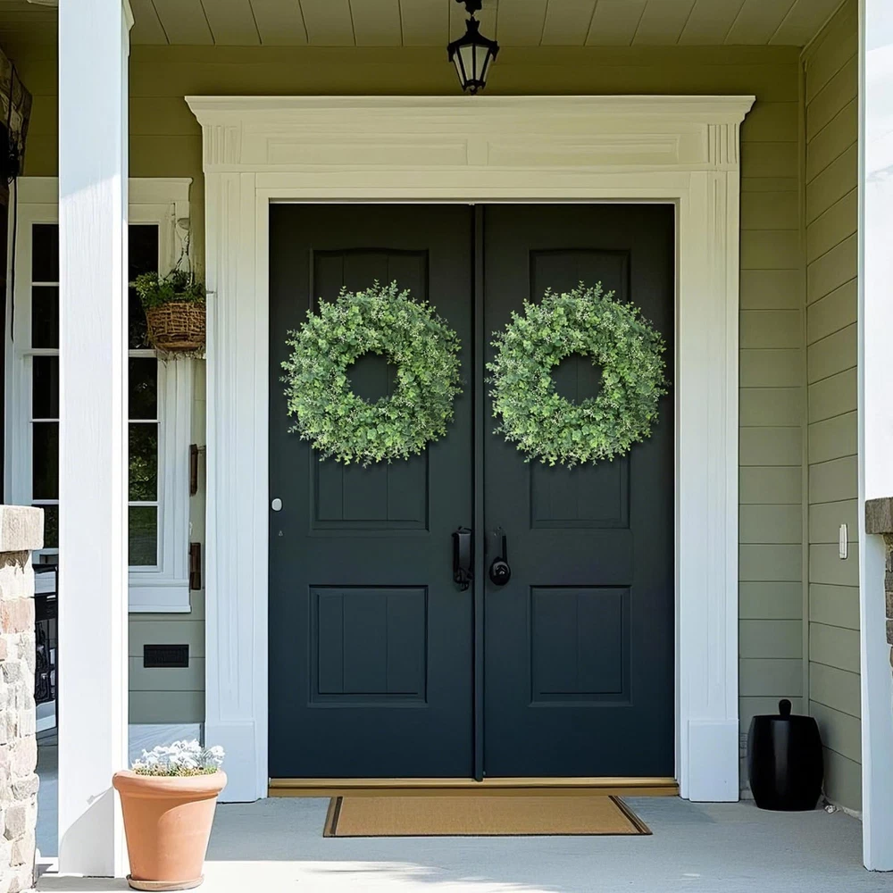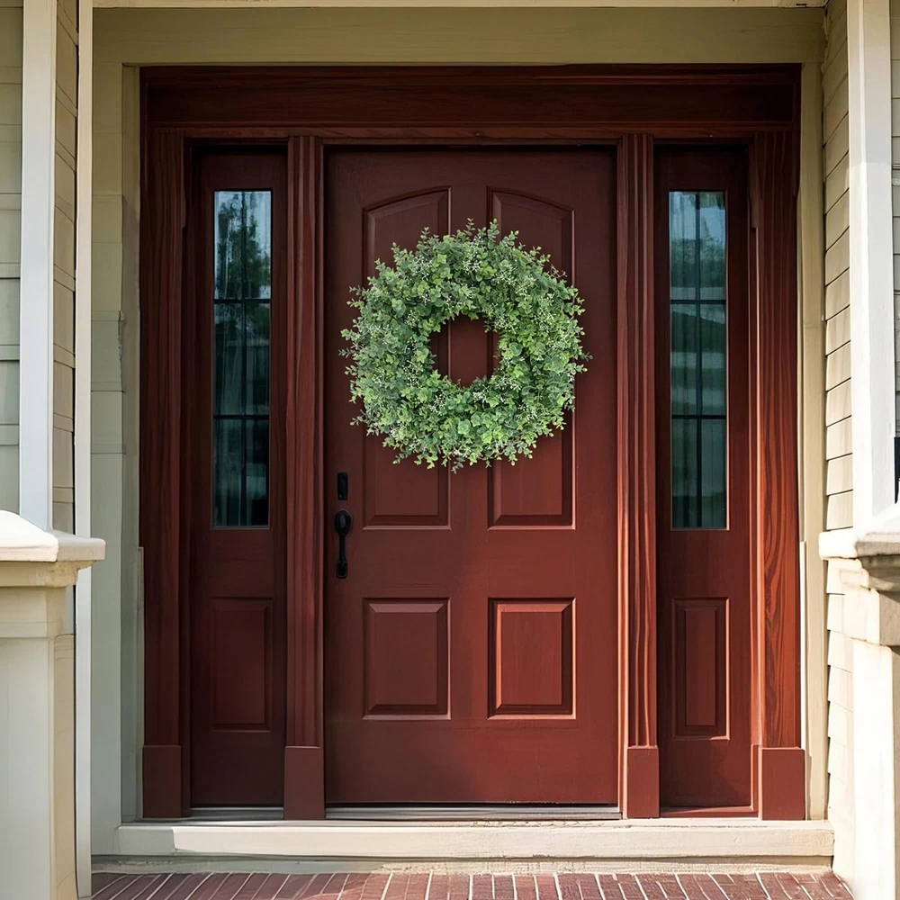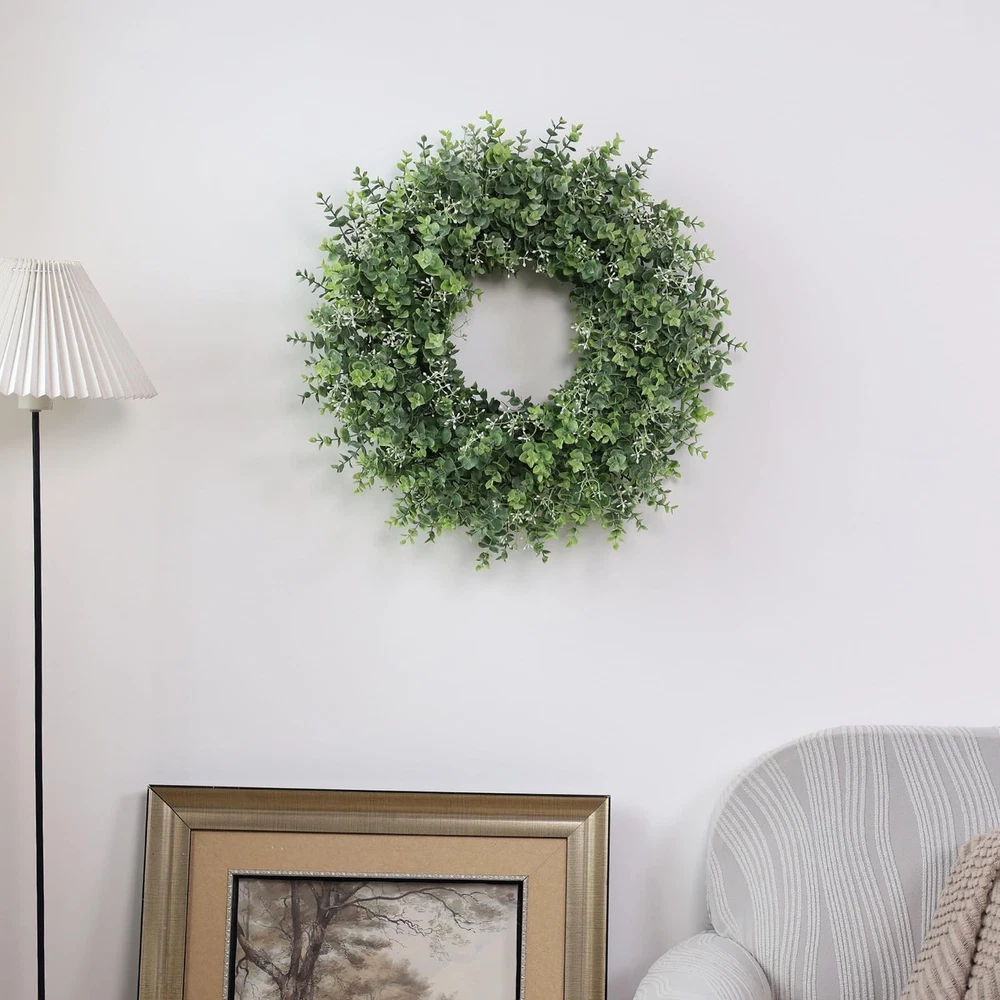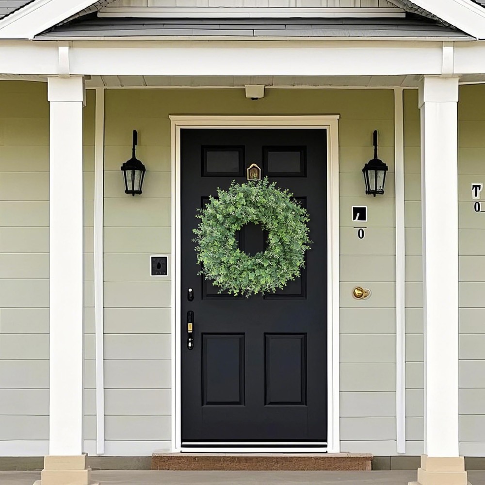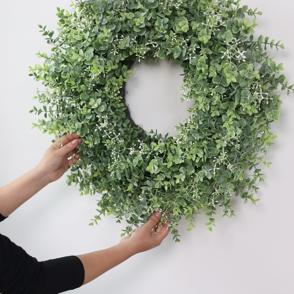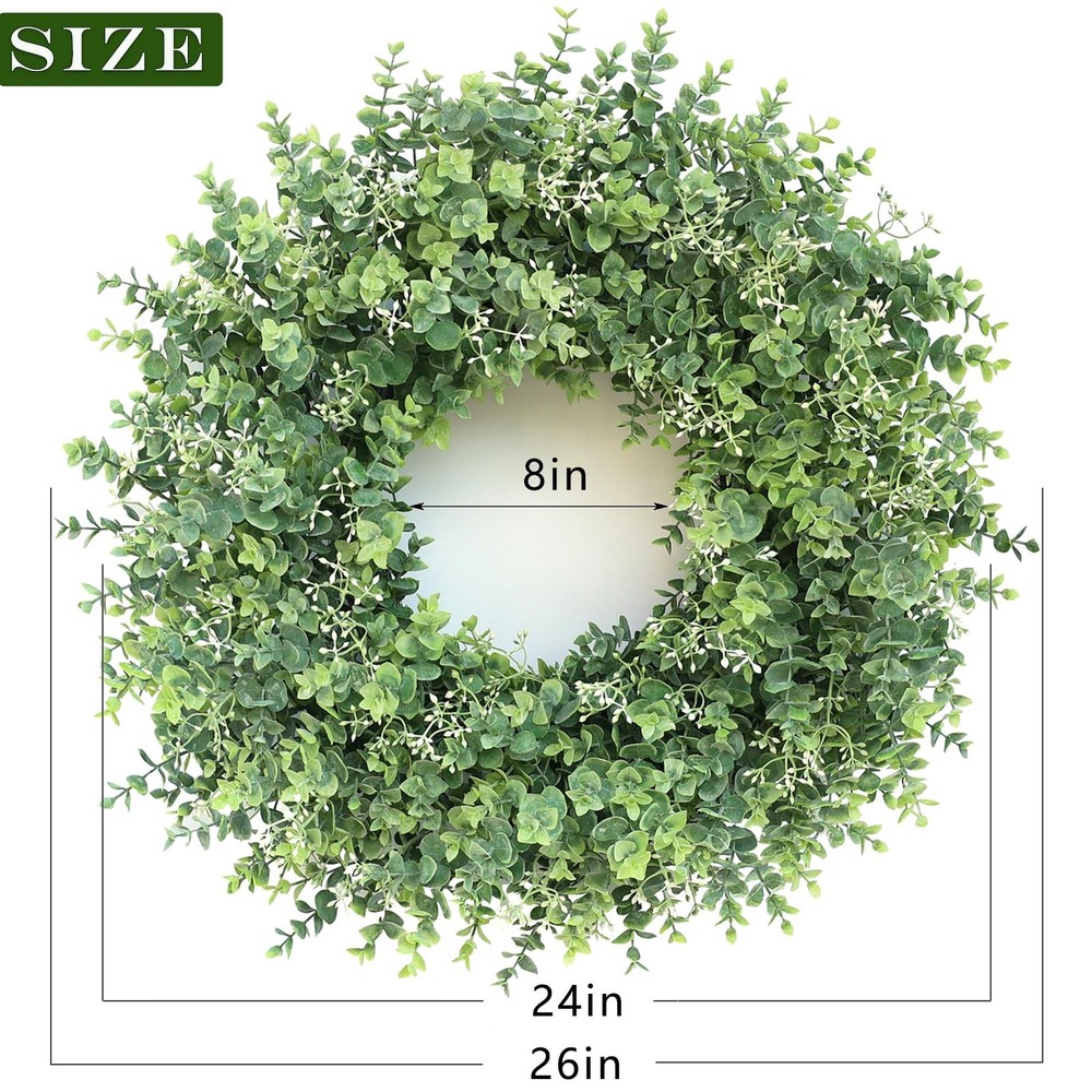 26'' Eucalyptus Wreath for Front Door 【Lifelike wreath】 : This eucalyptus wreath is made of high-quality eucalyptus leaves and is also embellished with white seeds, which makes it look more vibrant and lifelike. 【Quality materials】 : Eucalyptus leaves are made of high-quality plastic, durable, wind and water resistant and will not fade, suitable for indoor and outdoor decoration. 【Perfect size】 : At 24-26 inches in diameter and up to 26 inches when fully unfolded, this large, vibrant wreath is ideal for most home doors and Windows. 【Versatile】 : The front door wreath can be used for all seasons, whether it is in the hallway, window, fireplace, living room, kitchen, farmhouse, etc., it can effortlessly decorate your home. Perfect for weddings, birthday parties, Easter, Valentine's Day, Mother's Day, Thanksgiving and other holiday decorations. This green wreath will bring a pleasant atmosphere all year round. 【Tips】 : In order to prevent damage during transportation, the wreath is tightly packed in the carton, you only need to easily adjust the stem of the eucalyptus leaf to unfold, to obtain the best appearance, achieve the perfect display.