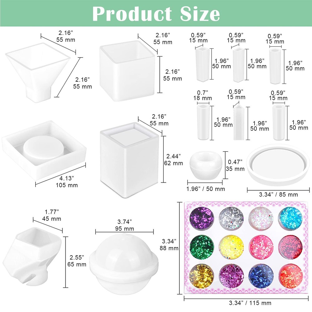 Silicone Resin Molds Kit 26PCS, Epoxy Molds, Large Casting with 12 Glitter Sequins for UV Casting, Including Sphere, Cube, Pyramid, Square, Coaster, Stone & Pendants 【DIY Epoxy Resin Molds Set of 26pcs】Box Resin Molds Kit comes with 1 square silicone mold, 1 round coaster resin mold, 1 pyramid resin mold, 1 flower pot resin mold, 1 pen holder resin mold, 1 ball shape resin mold, 1 stone shape resin mold, 6 diamond pendant resin molds and 12 color Decorative Sequins. Please give full play to your creativity. 【Reusable & Eco-friendly Silicone Coaster Mold】The smooth and clean silicone square resin mold is made from premium silicon which can be used for unlimited casting. Silicone Epoxy Mold is the ideal material with which to make a resin mold, as it acts as a natural release agent. This material is non-toxic, environmentally friendly, and non-allergenic, making it a great option for everyone. 【Easy-to-Demold & Clean Epoxy Molds】Highly Flexible silicone pyramid mold for resin makes it even easier to remove your resin castings with ease. After the resin fully cured, you just need to add soapy water and then take your finished items out. Please hand wash the mold with soap water and let it air dry after use. 【Wide Application】This silicone mold for resin set is ideal for beginners. There are many different available shapes, and you don't need to make resin molds yourself. These resin molds can be used for making coasters, plant pot, pen holder, square holder and other practical items or decorative ornaments and desk decorations. The epoxy molds can be used to make unique handmade gifts for your loved ones and friends. 【Great Gift Idea】The epoxy molds can be used to make unique handmade gifts for your loved ones and friends. lf you have any questions or issues regarding the epoxy resin molds set please do not hesitate to send the seller a message through Amazon and we will respond within 24 hours. The Best Resin Molds: RESIN Silicone Molds When learning how to make something with epoxy resin, you are going to need silicone molds. Those that are still testing the waters when it comes to silicone molds may prefer to begin with a pre-made set rather than making them yourself. A set of 15pcs epoxy molds is perfect for learning how to make resin item. We have provided the best beginner silicone mold kit that includes both basic and complex shapes, providing you with a great starting point. How to better extend the service life of this resin molds kit? 1. Make sure your epoxy resin molds are smooth and clean before use. 2. When you release the item out of the silicone resin mold, please make sure your resin piece is completely cured or you will get a defective one. 3. When you de-mold, you can use a resin release spray and let it dry in the resin mold, which may help extend your molds’ life. If you don't have, you may use a baby wipe or a drop of soap water as a release agent, work it down to the silicone resin mold, then push the resin craft from the bottom. 4. Clean the resin molds silicone with soap water or rubbing alcohol when necessary, then wipe dry with a soft cloth. 5. Keep the resin silicone mold away from direct sunlight, dust and fire. Package Includes: 1 x Square Resin Mold (4.13x4.13 inches) 1 x Coaster Resin mold (3.34x3.34 inches) 1 x Pyramid Resin Mold (2.16x2.16 inches) 1 x Flower pot Resin Mold(1.96x0.47 inches) 1 x Pen holder Resin Mold(2.16x2.44 inches) 1 x Ball shape Resin Mold(3.74x3.74 inches) 1 x Stone shape Resin Mold(1.17x2.55 inches) 6 x Diamond pendant Resin Mold (hight: 1.96 inches) 12 Colors Decorative Sequins Shipping We offer FREE shipping on all orders! We ship within Three business days of payment, usually sooner. We use a selection of shipping services such as UPS, FedEx, USPS etc. We only ship to the lower 48 states, no APO/FPO addresses or PO Boxes allowed. Local pickups and combined shipping options are not provided at this time. Return You can return a product for up to 30 days from the date you purchased it. Any product you return must be in the same condition you received it and in the original packaging. Please keep the receipt. Payment We accept payment by any of the following methods: PayPal Please pay as soon as possible after winning an auction, as that will allow us to post your item to you sooner! Feedback Customer satisfaction is very important to us. If you have any problem with your order, please contact us and we will do our best to make you satisfied. Contact Us If you have any queries, please contact us via ebay. We usually respond within 24 hours on weekdays. Please visit our eBay store to check out other items for sale! Thank you for shopping at our store.