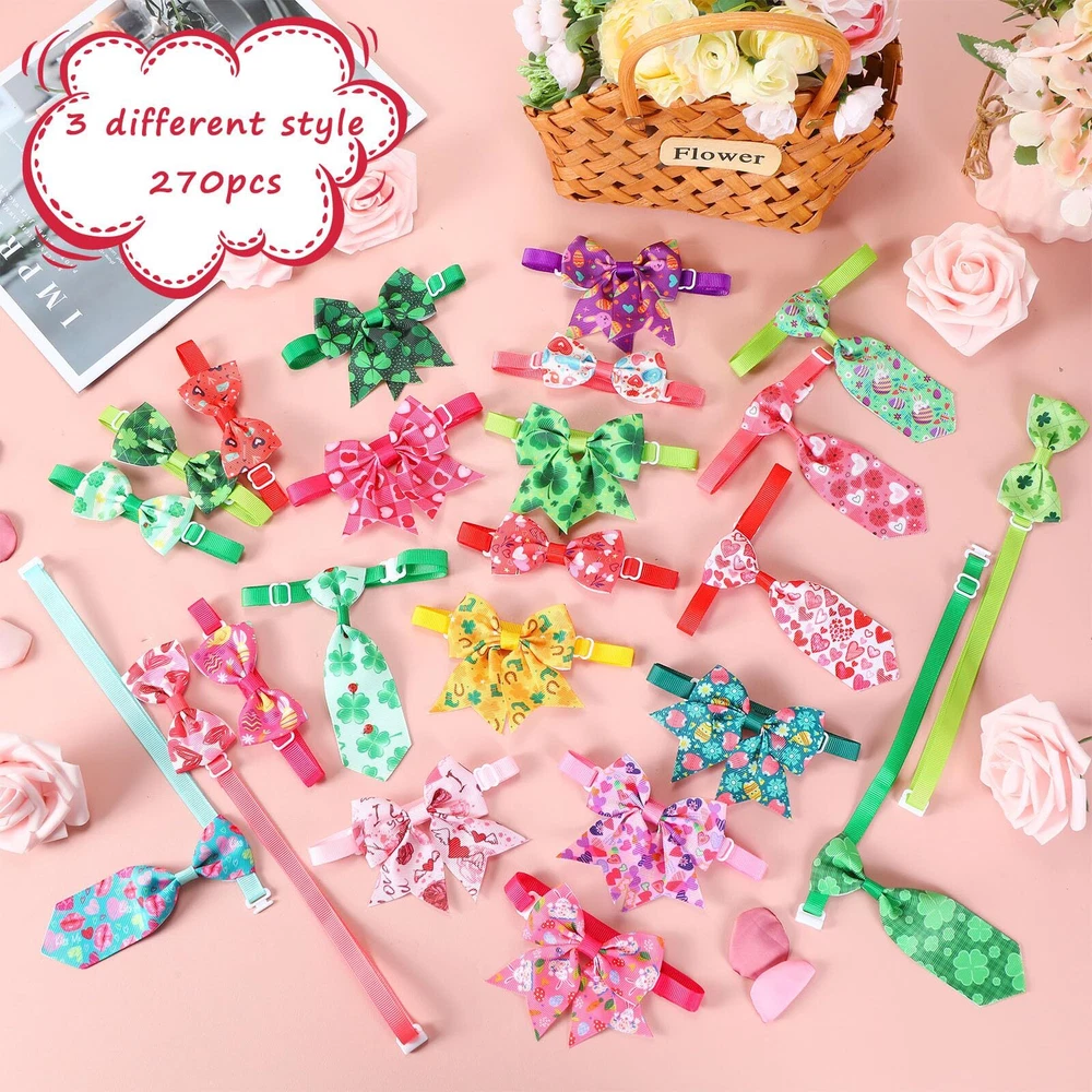 Features: Fit for most breeds: The dog collar bows are designed to suit dogs of most sizes, thanks to their adjustable straps. Whether you have a petite pup or a large hound, these bowties will make them stand out at the event. Unleash the cuteness: These bowties are suitable for holiday parties and special occasions. Whether it's a romantic Valentine's Day date, a lucky St. Patrick's Day celebration, or an egg citing Easter gathering, your dog will be the center of attention, charming people with their style. Specifications: Material: polyester Color: as the picture shown Size: as the picture shown Package includes: 270 x Dog collars Notes: Manual measurement, please allow slight errors on size. The color may exist a slight difference due to different screen displays Before purchase, confirm whether the product size is suitable for your pet, and observe the pet's reaction when using. Please remove the product in time if there is any discomfort. Package Contains: you will receive 270 pieces of pet collar tie sets in 3 styles, 180 pet ties included in 2 sizes, and 90 dog collar bows, a total of 270 pieces, from charming Valentine's Day hearts to festive St. Patrick's Day green and Easter patterns, we've got many occasions covered, specially designed for small to medium pets Size Details: the smaller bow tie is about 3 x 1.5 inches, the dog necktie is about 4.7 x 1.5 inches, and the larger bow tie measures approximately 3.1 x 3.5 inches; Pet holiday accessories come with plastic buckles, both tie and bow tie are adjustable, and the adjustable length range is from about 8.7 inches/ 22 cm to about 14.2 inches/ 36 cm; Please measure your pet's neck circumference before ordering Quality Material: these Valentine's Day, St. Patrick's and Easter dog bow ties and dog collars are made of quality polyester material, soft and comfortable, not only fashionable but also reliable; Your furry friend will look dapper while staying comfortable through the festivities Effortless Elegance: pet bow tie sets can easily enhance the holiday atmosphere, you can dress up your kitten or puppy during the holidays; These bowties are a breeze to adjust, ensuring your pet stays fashionable without fuss, suitable for holiday parties and occasions, and also suitable for daily wear Festival Pet Accessories: rich styles of dog bow ties and cat bow tie sets for your dogs and cats to dress up for St. Patrick's Day parades, pet birthday parties, celebrations, festivals, holiday themed parties, cosplay shows and more