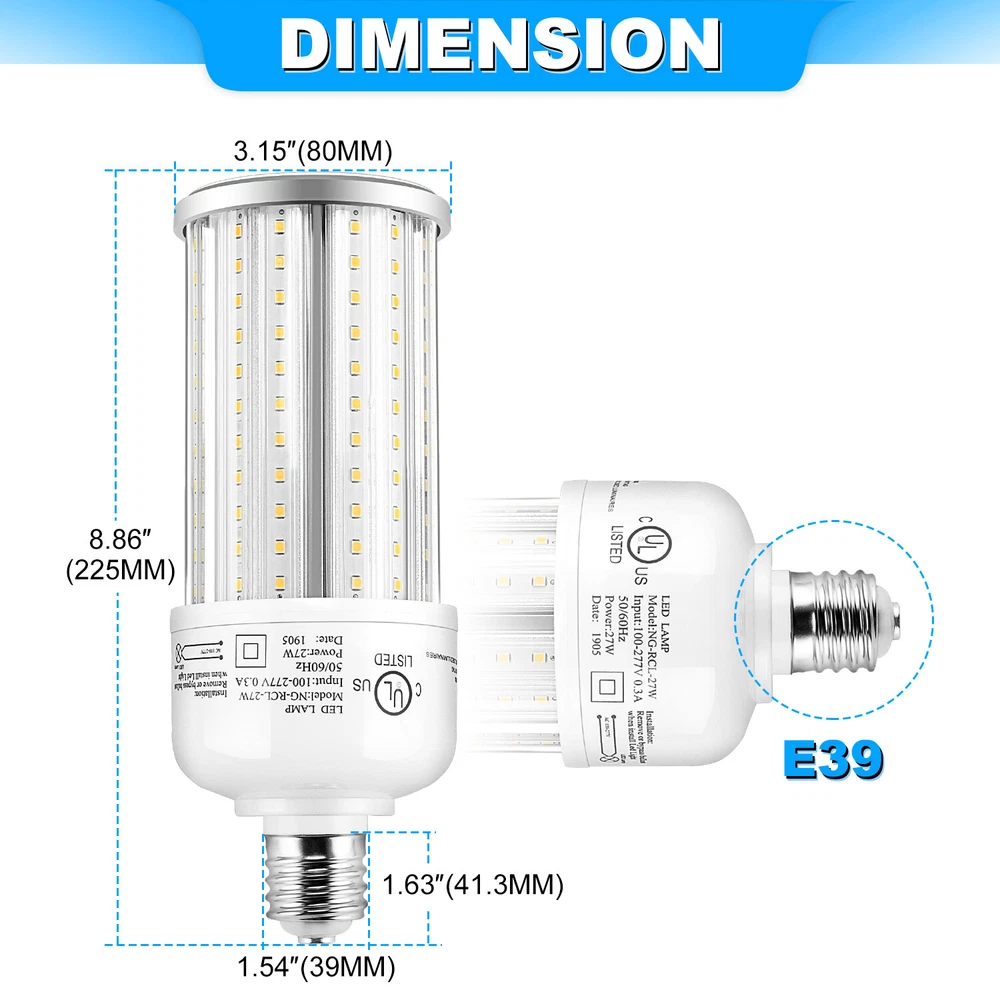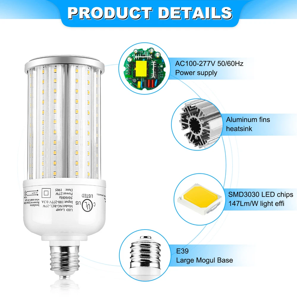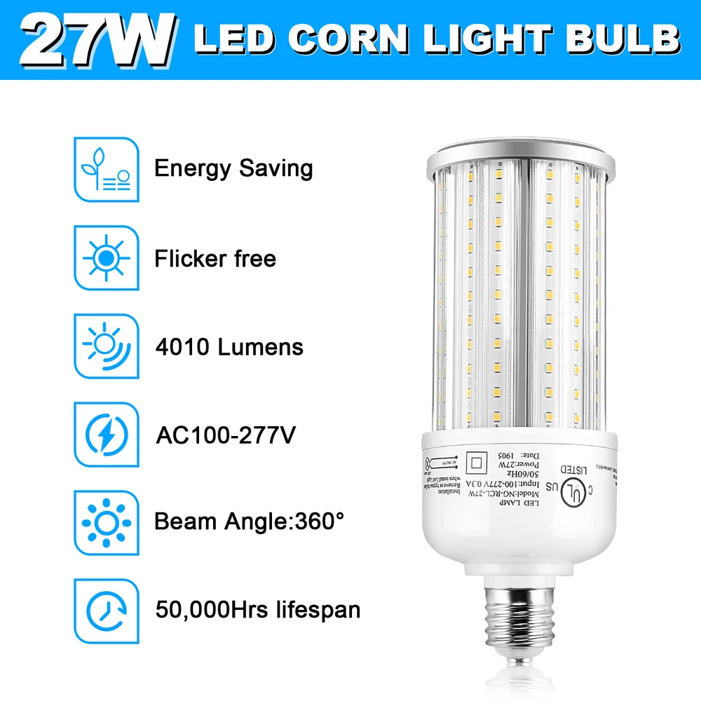 Product Description 27W LED Corn Light Bulb Warehouse Workshop Parking Lot Lighting 5000K Daylight Specification: Rated Power: 27W Base Code : E39 Light Bulb Base Type : Medium Base Power Factor: >90% Input Voltage: AC100-277V 50/60Hz LED Type:SMD2835 LED chips with 130-150Lm/W Luminous Flux(lm): 4,010Lm Color Temperature: 5,000K Color Rendering Index (RA) : >80 PFC: >90% Materials: Aluminum+ASA Certification: UL & DLC Not dimmable Notice: 1.The LED Corn bulb is wide input voltage(AC100V-277V) 2.Please turn off power before install or change assembly parts 3.Make sure to remove ballast or starter before install the lamps 4.The input voltage and lamps should be matched, after connecting the power line, please make sure the wiring section is insulated About Us Payment Shipping Terms Returns Contact Us 1. 10 Years LED Light Manufacturer 2. Certified Safety LED Light Products 3. US Warehouse Fast & Convenient Delivery 30,000 sq.ft production area &100 employees professional team. UL,cUL,cETL,ETL,DLC approved products standard produce by certified request. 6 separately production line strictly control quality & speed production Professional Aging test machine&SMT Machine&IES test system&Reflow oven 1. We only accept payment by PayPal . Your ebay address must match your paypal address. PO BOX can not delivered. 2. Please make payment within 7 days. If you don't need it, please inform us to cancel it, for eBay will open UNPAID dispute automatically in eighth day. 3. Paypal allows you to complete your purchase quickly and securely. It offers a variety of payment options including all the major card carriers. ★★★ ★ ★ USA Warehouse! 2-5days Fast shipping! 1. We will ONLY ship item to eBay physical Paypal address. Your eBay address must match Paypal address. 2. We ship daily Monday - Friday . All orders will be shipped within one working day after payment. 3. Tracking number will be upload on ebay within 24 hours after shipment. 4. Shipping Time: 2-5 working days for US buyers. ★ ★ ★ All of our products are shipped from our 3 different warehouses in the US.(KY/OH/TX) 1. Please kindly CONTACT US via eBay message if there is any problem, instead of Open Case or Return Requests, We will always try our best to solve the problem for you. 2. We provide a 30 days satisfaction or return guarantee for exchange or refund. 3. The package must be in its original packaging and include all of the original accessories or items that came with it when returning an item. The item and package should be in original and perfect condition. 1. Sellers pay return shipping costs. Sellers pay for return, replacement or exchange shipping if there's a problem with the item. For example, if the item a. Doesn't match listing description b. Damaged or defective when received c. Missing spare parts d. Counterfeit or imitation goods 2. Buyers need to pay return shipping costs. If the buyer changes mind about a purchase and wants to return an item, there may need to pay return shipping costs. For example a. Chose the wrong size or feel that the product is not suitable for buyers himself b. No need this product after received c. Find a more suitable price elsewhere than choose a return. 1.Office Time: 9:30 - 18:30, Monday - Saturday (UTC+8) 2.Please contact us with eBay Messa ge . 3.We will respond you within 24 hours on business day. Your feedback is very important to us, please leave us a Positive Feedback with all 5-star for the Detailed Selling Rating when you received the item. If there is some problem about the product, please take communication with us before leaving neutral/negative feedback or opening ebay/paypal case, we will do our best to resolve your problem. We try our best to reply to your emails as soon as possible, however, due to high volume of daily incoming emails and time zone difference; we may not be able to reply your emails immediately. Please allow 24 business hours for us to response. About Us 1. 10 Years LED Light Manufacturer 2. Certified Safety LED Light Products 3. US Warehouse Fast & Convenient Delivery 30,000 sq.ft production area &100 employees professional team. UL,cUL,cETL,ETL,DLC approved products standard produce by certified request. 6 separately production line strictly control quality & speed production Professional Aging test machine&SMT Machine&IES test system&Reflow oven Payment 1. We only accept payment by PayPal . Your ebay address must match your paypal address. PO BOX can not delivered. 2. Please make payment within 7 days. If you don't need it, please inform us to cancel it, for eBay will open UNPAID dispute automatically in eighth day. 3. Paypal allows you to complete your purchase quickly and securely. It offers a variety of payment options including all the major card carriers. Shipping ★★★ ★ ★ USA Warehouse! 2-5days Fast shipping! 1. We will ONLY ship item to eBay physical Paypal address. Your eBay address must match Paypal address. 2. We ship daily Monday - Friday . All orders will be shipped within one working day after payment. 3. Tracking number will be upload on ebay within 24 hours after shipment. 4. Shipping Time: 2-5 working days for US buyers. ★ ★ ★ All of our products are shipped from our 3 different warehouses in the US.(KY/OH/TX) Terms 1. Please kindly CONTACT US via eBay message if there is any problem, instead of Open Case or Return Requests, We will always try our best to solve the problem for you. 2. We provide a 30 days satisfaction or return guarantee for exchange or refund. 3. The package must be in its original packaging and include all of the original accessories or items that came with it when returning an item. The item and package should be in original and perfect condition. Returns 1. Sellers pay return shipping costs. Sellers pay for return, replacement or exchange shipping if there's a problem with the item. For example, if the item a. Doesn't match listing description b. Damaged or defective when received c. Missing spare
