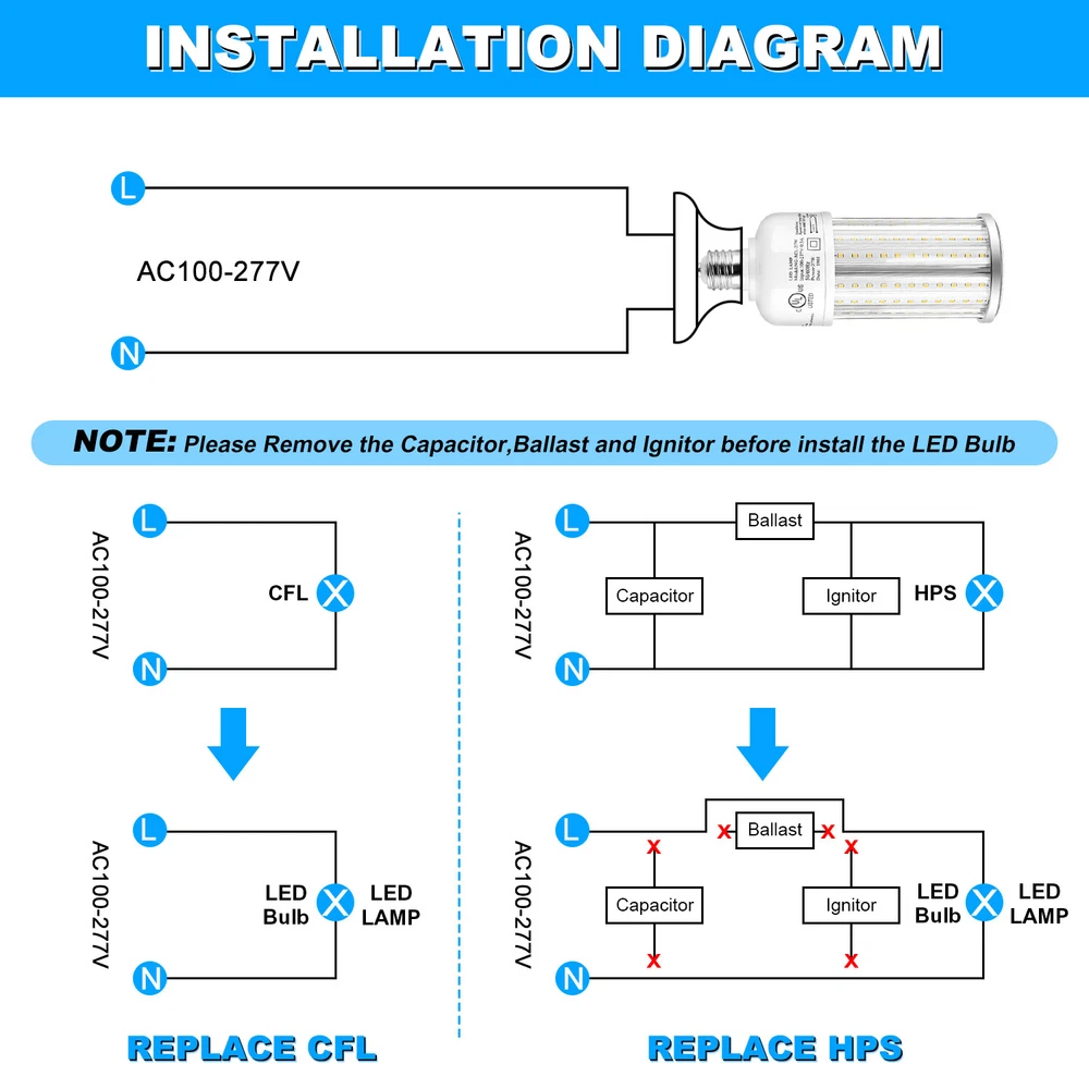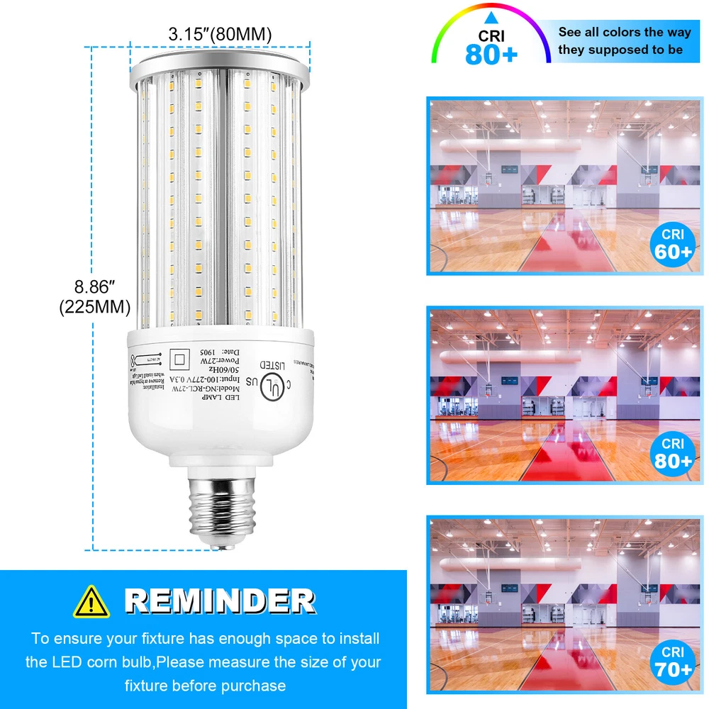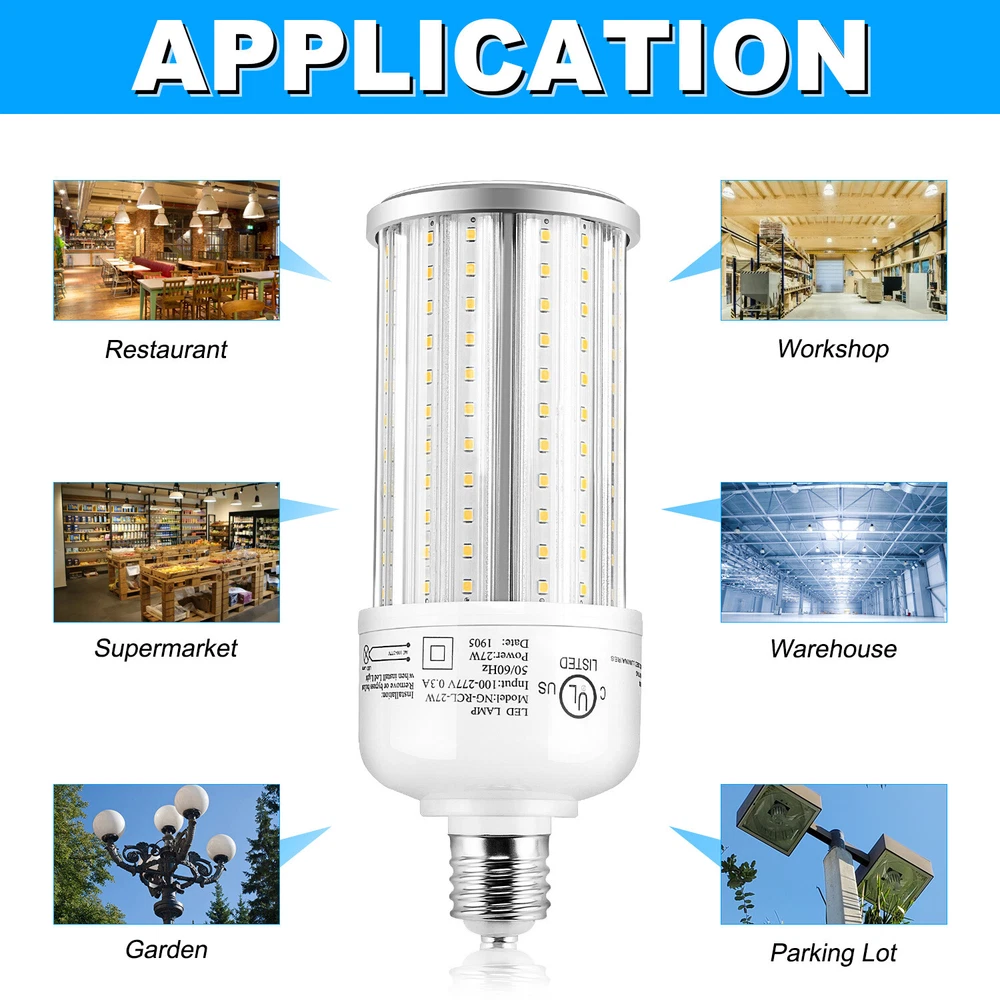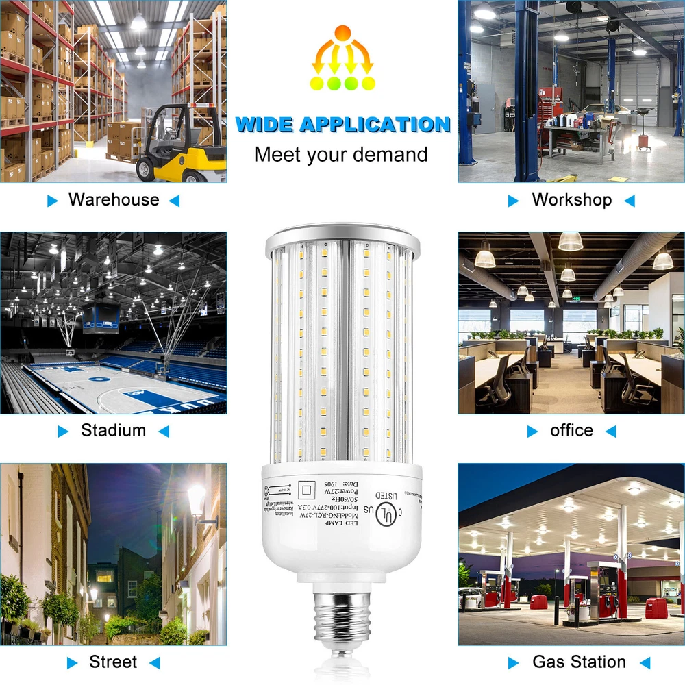 Product Description 27W LED Corn Light Bulb Warehouse Workshop Parking Lot Lighting 5000K Daylight Specification: Rated Power: 27W Base Code : E39 Light Bulb Base Type : Medium Base Power Factor: >90% Input Voltage: AC100-277V 50/60Hz LED Type:SMD2835 LED chips with 130-150Lm/W Luminous Flux(lm): 4,010Lm Color Temperature: 5,000K Color Rendering Index (RA) : >80 PFC: >90% Materials: Aluminum+ASA Certification: UL & DLC Not dimmable Notice: 1.The LED Corn bulb is wide input voltage(AC100V-277V) 2.Please turn off power before install or change assembly parts 3.Make sure to remove ballast or starter before install the lamps 4.The input voltage and lamps should be matched, after connecting the power line, please make sure the wiring section is insulated About Us Payment Shipping Terms Returns Contact Us 1. 10 Years LED Light Manufacturer 2. Certified Safety LED Light Products 3. US Warehouse Fast & Convenient Delivery 30,000 sq.ft production area &100 employees professional team. UL,cUL,cETL,ETL,DLC approved products standard produce by certified request. 6 separately production line strictly control quality & speed production Professional Aging test machine&SMT Machine&IES test system&Reflow oven 1. We only accept payment by PayPal . Your ebay address must match your paypal address. PO BOX can not delivered. 2. Please make payment within 7 days. If you don't need it, please inform us to cancel it, for eBay will open UNPAID dispute automatically in eighth day. 3. Paypal allows you to complete your purchase quickly and securely. It offers a variety of payment options including all the major card carriers. ★★★ ★ ★ USA Warehouse! 2-5days Fast shipping! 1. We will ONLY ship item to eBay physical Paypal address. Your eBay address must match Paypal address. 2. We ship daily Monday - Friday . All orders will be shipped within one working day after payment. 3. Tracking number will be upload on ebay within 24 hours after shipment. 4. Shipping Time: 2-5 working days for US buyers. ★ ★ ★ All of our products are shipped from our 3 different warehouses in the US.(KY/OH/TX) 1. Please kindly CONTACT US via eBay message if there is any problem, instead of Open Case or Return Requests, We will always try our best to solve the problem for you. 2. We provide a 30 days satisfaction or return guarantee for exchange or refund. 3. The package must be in its original packaging and include all of the original accessories or items that came with it when returning an item. The item and package should be in original and perfect condition. 1. Sellers pay return shipping costs. Sellers pay for return, replacement or exchange shipping if there's a problem with the item. For example, if the item a. Doesn't match listing description b. Damaged or defective when received c. Missing spare parts d. Counterfeit or imitation goods 2. Buyers need to pay return shipping costs. If the buyer changes mind about a purchase and wants to return an item, there may need to pay return shipping costs. For example a. Chose the wrong size or feel that the product is not suitable for buyers himself b. No need this product after received c. Find a more suitable price elsewhere than choose a return. 1.Office Time: 9:30 - 18:30, Monday - Saturday (UTC+8) 2.Please contact us with eBay Messa ge . 3.We will respond you within 24 hours on business day. Your feedback is very important to us, please leave us a Positive Feedback with all 5-star for the Detailed Selling Rating when you received the item. If there is some problem about the product, please take communication with us before leaving neutral/negative feedback or opening ebay/paypal case, we will do our best to resolve your problem. We try our best to reply to your emails as soon as possible, however, due to high volume of daily incoming emails and time zone difference; we may not be able to reply your emails immediately. Please allow 24 business hours for us to response. About Us 1. 10 Years LED Light Manufacturer 2. Certified Safety LED Light Products 3. US Warehouse Fast & Convenient Delivery 30,000 sq.ft production area &100 employees professional team. UL,cUL,cETL,ETL,DLC approved products standard produce by certified request. 6 separately production line strictly control quality & speed production Professional Aging test machine&SMT Machine&IES test system&Reflow oven Payment 1. We only accept payment by PayPal . Your ebay address must match your paypal address. PO BOX can not delivered. 2. Please make payment within 7 days. If you don't need it, please inform us to cancel it, for eBay will open UNPAID dispute automatically in eighth day. 3. Paypal allows you to complete your purchase quickly and securely. It offers a variety of payment options including all the major card carriers. Shipping ★★★ ★ ★ USA Warehouse! 2-5days Fast shipping! 1. We will ONLY ship item to eBay physical Paypal address. Your eBay address must match Paypal address. 2. We ship daily Monday - Friday . All orders will be shipped within one working day after payment. 3. Tracking number will be upload on ebay within 24 hours after shipment. 4. Shipping Time: 2-5 working days for US buyers. ★ ★ ★ All of our products are shipped from our 3 different warehouses in the US.(KY/OH/TX) Terms 1. Please kindly CONTACT US via eBay message if there is any problem, instead of Open Case or Return Requests, We will always try our best to solve the problem for you. 2. We provide a 30 days satisfaction or return guarantee for exchange or refund. 3. The package must be in its original packaging and include all of the original accessories or items that came with it when returning an item. The item and package should be in original and perfect condition. Returns 1. Sellers pay return shipping costs. Sellers pay for return, replacement or exchange shipping if there's a problem with the item. For example, if the item a. Doesn't match listing description b. Damaged or defective when received c. Missing spare