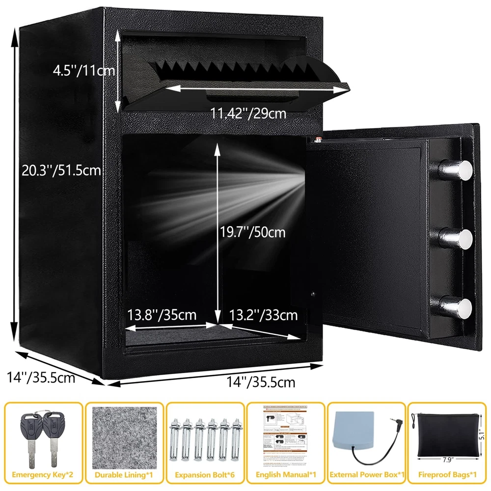 Product Features 💌Are you still troubled by this situation in your life or at work? 💌Have to open with key many times when you need to store things frequently? 💌Why not have a try with this security and large capacity money slot safe? 👍More quicker and easier for multiple drop without key! 👍A security helper in the stores, motels, gas stations, bank, checkout counter, office. 👍Multi-purpose safe: cash safe, drop box, bank safe, office safe, business safe, wall safe. Product Specifications Color: Black The Weight:45.03lb/20.55KG Material: Cold rolled steel sheet The External Size: 14''*14''*20.28''/35.5*35.5*51.5cm The Internal Size: 13.78''*13.2''*19.7''/35*33.5*50cm Package Included Safe with Drop Slot*1 English Manual*1 Expansion Bolts*6 Emergency Keys*2 (Note: Not included 4 AA alkaline batteries) 💰【2.8 CUB DROP SLOT BUSINESS SAFE】Large cash safe comes with drop slot, any shift employees are allowed to put large volumes of deposit inside faster without keys. Meanwhile manager can access by password or key to check, which is secure and well prevents internal theft in your job. Spacious interior is ideal to protect cashier report envelope, coin, night money, bill slips, check payment, files from theft for hotel, motels, bank counter, cab, café, restaurants, office, retail businesses, etc. 💰【ANTI-FISHING DESIGN+THICKENED SOLID STEEL PANEL】Anti-fishing baffle is deep and long, moreover not only there is a row of big jaggecaja fuerte edge teeth at the drop end, but also a small jagged edge teeth edge above the door. Both effectively prevent thieves from fishing out your valuables. Safe with drop slot adopts 10mm door panel, more stronger than traditional hollow. 26mm solid lock bolts, concealed pry-resistant u-shaped hinges, they’re excellent in anti-break-in and anti-collision. 💰【LED LIGHT+SILENT FUNCTION+120° OPEN DOOR】You will get a drop slot safe: ① The LED light will light up automatically to help you enter the code.② Press 1 to turn on the mute function to provide you with security in case of danger. ③ 120° oversized opening, wider and more convenient to put in items than the old 90° safe opening. ④The triangular metal handle is more solid and textured; ⑤The gray lining is soft and scratch-resistant. Come on and have a try with this useful and secure safe. 💰【2 WAYS TO OPEN】①Emergency key+knob (first use, forgotten password, low battery). ②Password+handle (quick access, 3-8 any digits). Green: unlock or promptl light, Yellow: wrong password , Red: low battery indicator. If you enter wrong password for three times, the alarm will “didi”for 20 seconds. Please don’t worry, solution: open with emergency key and take out a battery, then the alarm can be released immediately (Note: not included 4 AA alkaline batteries). 💰【EASY WALL GROUND MOUNTING】There are 4 holes back and 2 holes bottom of the depository safe and comes with 6 mounting bolts, the hidden safe can be installed in the concrete slab or wooden wall. This increases the anti-theft coefficient. Owing to good concealment and classic black, which easily integrates into your home and workplace and widely serve in many social place. Such as, safe box for home, night money drop box, lost and found box, love coin box, election box, collection safe, etc. 💰【PERFECT AFTER-SALES SERVICE】 ① In order to deliver it to you faster and better, we have upgraded the packaging of the product many times to reduce the risk. ② If you have any questions after receiving the product, please contact us, we will quickly and professionally for you to solve. 💰【WATERPROOF FIREPROOF BAG】Our safe box comes with a waterproof and fireproof document bag, you can use it to store cash, jewelry and important documents, protecting your valuables from fire, hurricanes and earthquakes.