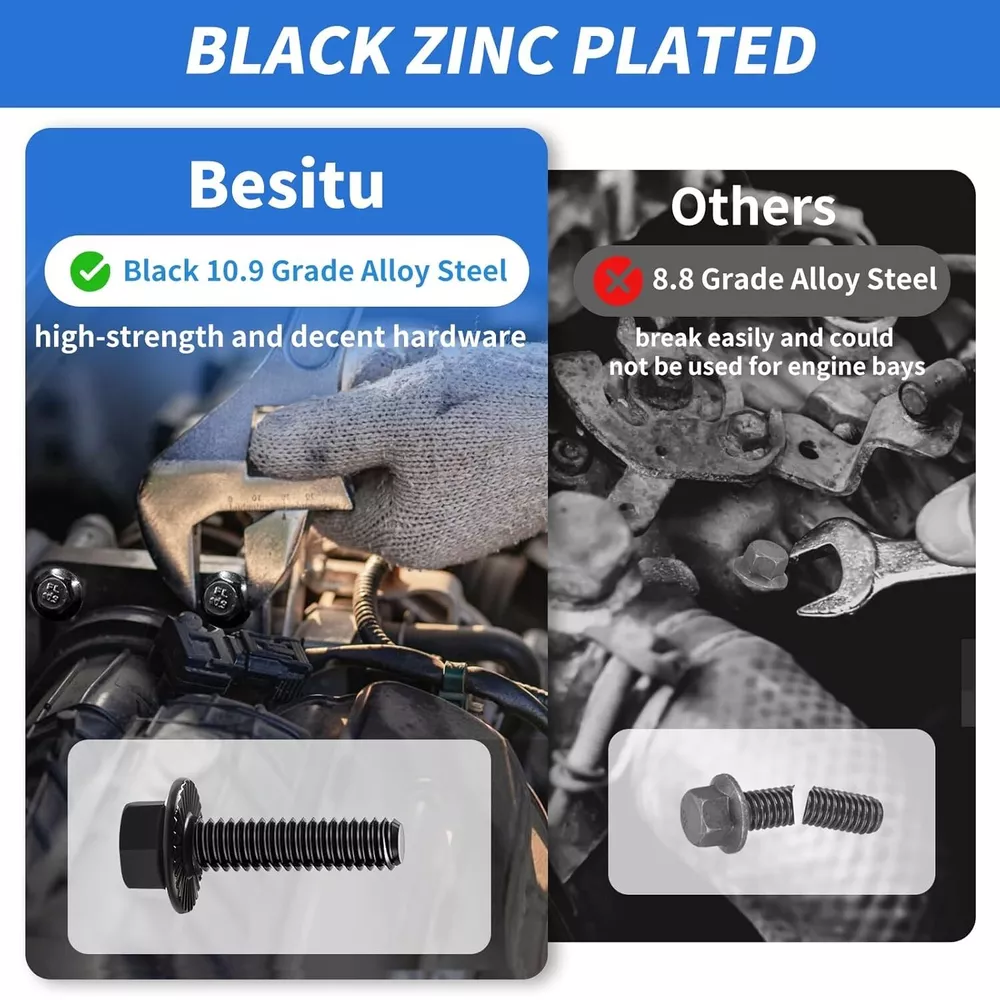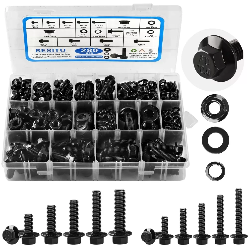 280Pcs Metric Flange Bolt Assortment, M6x1.0, M8x1.25, M10x1.5 (12mm to 30mm) Assorted Hex Bolts and Nuts Washers Kit for Automotive, 10.9 Black Zinc Galvanized 【Metric Flange Bolt Assortment】This is nice selection of metric flange head bolts of the most common lengths along with the nuts and washers, Including M6-1.0 x 12/16/20/25/30mm, M8-1.25 x 16/20/25/30mm, M10-1.5 x30mm, 280pcs in total. The fully threaded design ensures a secure and stable fit in a wide range of applications. 【10.9 Alloy and Black Galvanized】This flange bolt kit is crafted from 10.9 grade alloy steel with a durable black galvanized finish. If you're working inside the engine, you'll need high-strength Class 10.9 bolts on hand. Class 8.8 bolts are not rated for high-torque conditions. 【Time & Money Saver】Great bins for storage with a size chart on the inside and outside. Compared to the time it takes to go to a hardware store and the cost of buying individual packs, this flange bolts nuts washers kit is a time and money saver. 【Wide Applications】The flange has serrations grip that increases the torque needed to loosen the bolt, which is perfect for mounting something that exposed to vibrations and harshness during action. Widely used in home improvement, automotive projects and engineering test labs. 【Reusable Container】Everything is sorted in separate compartments that are labeled, which is nice when you're looking for a specific size. You can also reuse the plastic container after you've used all the flange bolt kit. The quintessential toolbox addition for any DIY enthusiast.