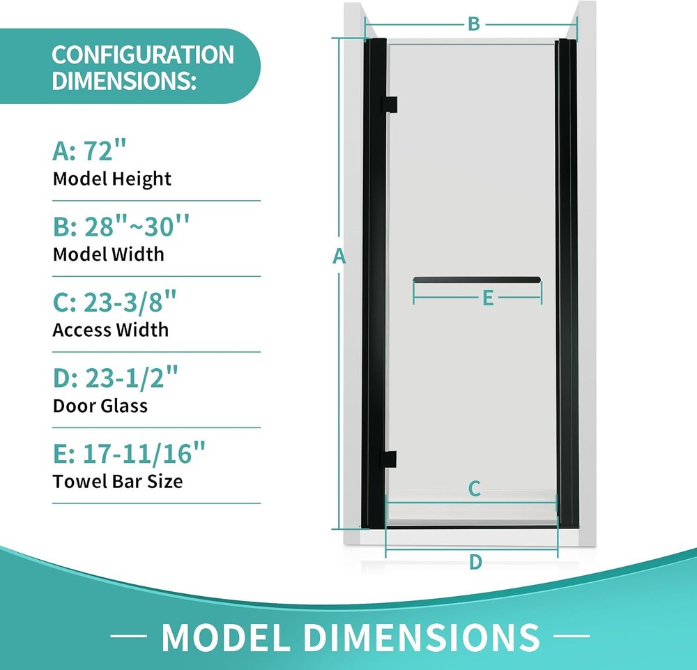 28-30 in.W x72 in.H i-Homare Frameless Pivot Shower Door, 1/4 inch (6mm) SGCC Clear Tempered Glass Pivot Swing Shower Door, Easy to Clean Item Description About this item 【SEMI FRAMELESS PIVOT DOOR】 The Semi-Frameless Pivot Door features 90° rotation outward, offering flexibility while minimizing space consumption. 【Easy to Clean】 The glass coating is easy-to-clean, waterproof, anti-pollution, and non-staining, effectively preventing water stains and sewage buildup. 【REVERSIBLE INSTALLATION】 The pivot swing shower door features a reversible design for both right and left door orientations. 【EXCELLENT WATERPROOF】 The shower door features full-length seal strips to prevent water leakage, keeping your bathroom dry and clean. 【SAFETY TEMPERED GLASS】 The 1/4-inch (6mm) glass, certified by SGCC and ANSI, ensures safety and durability. › See more product details *The pivot shower door features a different opening/closing mechanism compared to sliding shower doors. It utilizes a pivot device, allowing the shower door to open or close with ease,giving you the ultimate convenience and comfort to enjoy your shower. *Glass: SGCC-certified tempered 1/4"(6mm) clear glass *Pivot shower door maximizes space, offering a spacious entryway while conserving room. *The pivot swing shower door offers a 2-inch adjustment for a flexible and tight-fitting installation. *The stainless steel handle doubles as a towel bar, saving space and providing more storage options for added convenience. *The SGCC certified 1/4" (6mm) shower glass door is easy to clean and ensures enhanced safety. Reversible for a left or right door to meet your installation Payment We accept payment only through PAYPAL Shipping We ship products worldwide through standard express courier service, it will reach within 7 to 10 days to abroad buyers, we ship the product after recieved clear payment and give full information about shipment to the buyer Return We accept product return within 7 to 21 days from delivery date but product should be in original position and not in damaged condition,the return shipping charges will be buyer responsibility