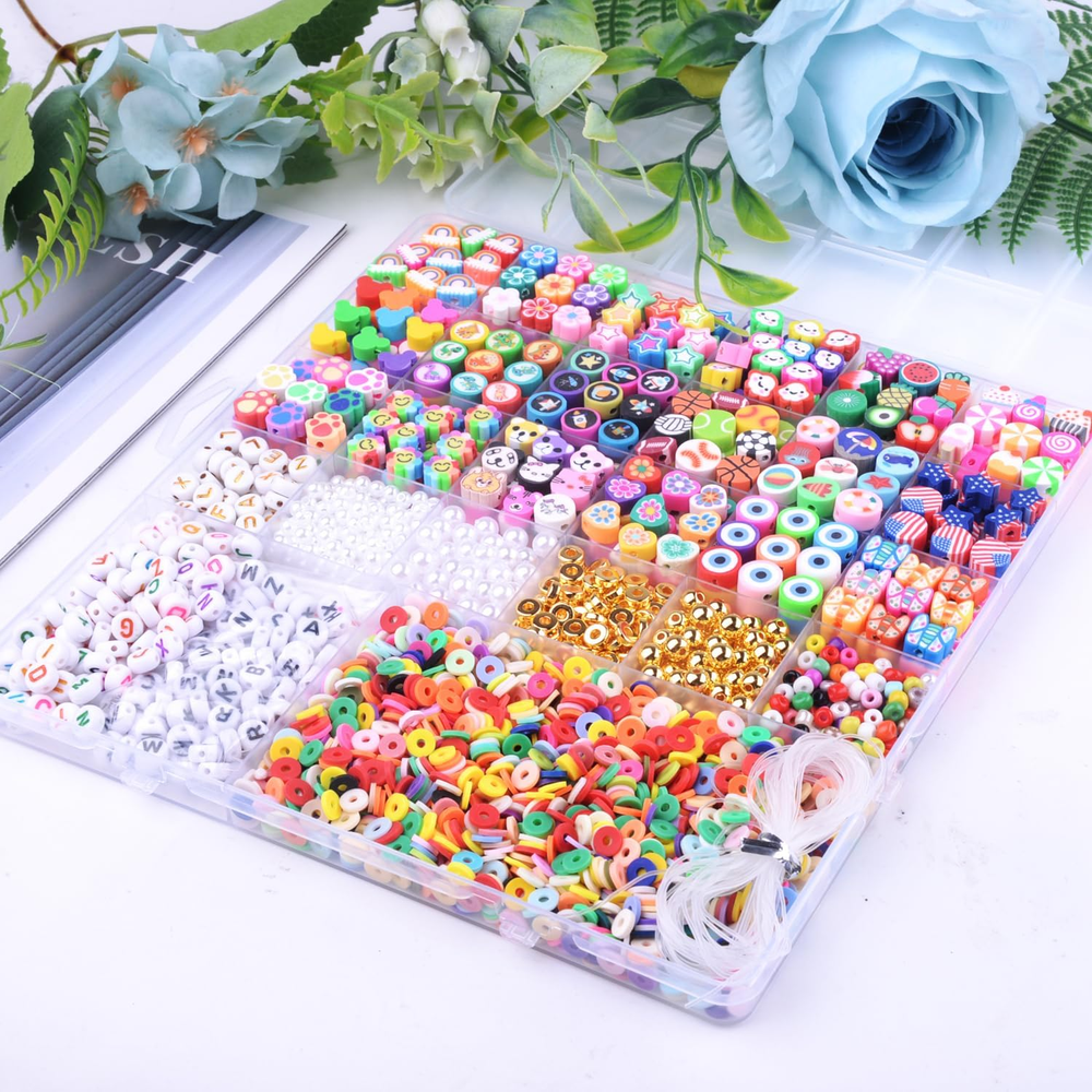 【2880PCS BRACELET MAKING KIT】Include 1 storage box, 27 different styles Bracelet Making beads,contains pony beads, flat round beads, opaque letter beads,colorful letter beads,white letter beads,gold letter beads,peal beads,flat gold spacer beads,round gold spacer beads, rainbow, flower, pentagram, cloud, fruit, candy, mouse head, dinosaur, universe, football, basketball, volleyball, rugby, ocean series, national flag, cat's paw, sunflowers, animals, love, eyes, butterflies beads etc and plus 5 meter elastic string, unique and creative to meet all needs. 【Suitable Size】The polymer clay beads about 6mm long with a 2mm hole, and the size of letter beads is 6*6*3mm,the diameter of the hole is 2mm. the diameter of the other beads are about 10mm, the holes are about 2mm, All beads are separately stored in a 26 grid plastic box, which is very convenient to store and carry 【Premium Materials】 All of our beads are made of healthy materials, light and durable, comfortable to the touch, not easy to fade, waterproof, and can be worn when bathing or swimming. You can use and wear it with confidence 【Wide Application】 Perfect for Beading, Jewelry Making, bead bracelet keychain for women, bracelet earring necklace making supplies, phone charm, phone lanyard wrist, pendants, waist beads kit, hairpin or hair braids, fashionable shoes decor and party decoration. Animal beads adhered to hairpin would be a perfect hair decoration. 【Great Gift for Friends】 This great value bracelet making kit would be a perfect gift to help your Friends to improve hand-eye coordination, improve the practical ability and concentration, broaden imagination, training creativity and logical thinking. Your best friend will love to receive this craft kit for Christmas, Birthday, Thanksgiving Day. Not for children under 3 yrs:Toy contains a small part. Not for children under 3 yrs. To be used under the direct supervision of an adult Product Description