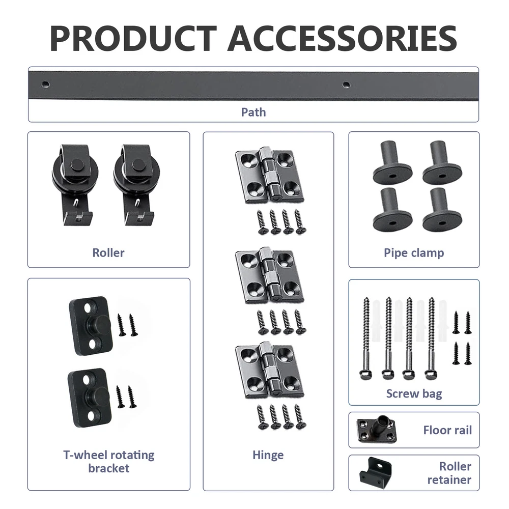 Store category Sign Up Now ! You may also like Product Description Bullet Points: Space-Saving Elegance: Transform any room with our Rail Sliding Barn Door, offering a wide range of applications, like living, dining or study areas. Its innovative space optimization design concept goodly saves space and seamlessly fits into any design. Swivel Stand for Versatile Use: Customize your barn door with our Rail Sliding Barn Door kit that includes 2x hinges and rollers, giving you the freedom to choose your own swivel stands. Additionally, 3x tracks, 3x spacers, 1x floor rail, and 1x roller holder provide the framework you need. Sturdy Reliability: Constructed with excellent carbon steel, this sliding barn door rail provides unyielding resistant to wear and tear, giving you a strong and long-lasting solution for your home. Effortless Installation: Comes with a detailed bi-fold sliding barn door kit and intuitive picture-text instructions, ensuring a quick and easy setup process. Reliable Performance: With the capacity to carry heavy loads, this Rail Sliding Barn Door boasts a sturdy bearing and nylon wheel combo, making it a practical choice for supporting and sliding even the heaviest of doors on its 6mm thick track. Ideal for various life situations, this kit includes 2*solid and durable roller swivel stands on a 6mm thick track. The sleek design is sure to complement any decor. Pictures and text are included for easy installation. Specifications: Colour: Black Material: carbon steel Track size: about 34 inches/86CM Track splicing method: 3 pieces Scope of application: Door panel thickness 0.5-50MM Packing List: 3*track 2*scroll wheel 2*roller swivel stand 1*roller holder 3*spacers 3*hinge 1*floor rail 1*sealing strip 1*screw pack 1*instruction manual 4*pipe clamp 35mm 4* wood screws Payment Delivery details Terms of sales About us Feedback & DSRs Payment Before you palce an order, please kindly make sure that you have a paypal account. We accept PAYPAL payment only. Payment should be completed within 2 days after auction closed, or unpaid dispute will be filed for an closing auction. An unpaid case will be filled after 4 days. Delivery details We ship to your eBay address. Each package will be shipped to US by UPS Regular Parcel with tracking number. Please check your shipping address carefully before checkout, it can't be changed if order completed. All items will be shipped within 1-2 business day upon receipt of payment.Orders placed on weekend will be shipped within 3 days. If you do not receive your item in 7-10 business days.please contact us immediately for further assistance. We will be responsible for any damages or losses incurred in the shipping process. About us We maintain high standards of excellence FIVE STAR and strive for 100% customer satisfaction! Positive Feedback is very important to us. We hope that you contact us immediately Before you give us neutral or negative feedback, so that we can satisfactorily address your concerns. We promise to offer the lowest price and high quality produce. Our working time: From Monday to Friday(9:30 am to 18:00pm), we don't working on holidays ,hope you can understand and know that , thank you. Please always talk to us via ebay Message. We appreciate your business and look forward to growing our e-Bay sales with satisfied customers. Feedback Contact us If you have any questions, please feel free to contact with us by ebay Message during our business hours ( 9:30a.m. to 5:30 p.m.), or email us through eBay, we will try our best to help you to resolve it. For any presale or after-sale questions,please do feel free to email us! Due to the time difference, each email will be replied within 1 working day,and weekend will be delayed a bit. Feedback