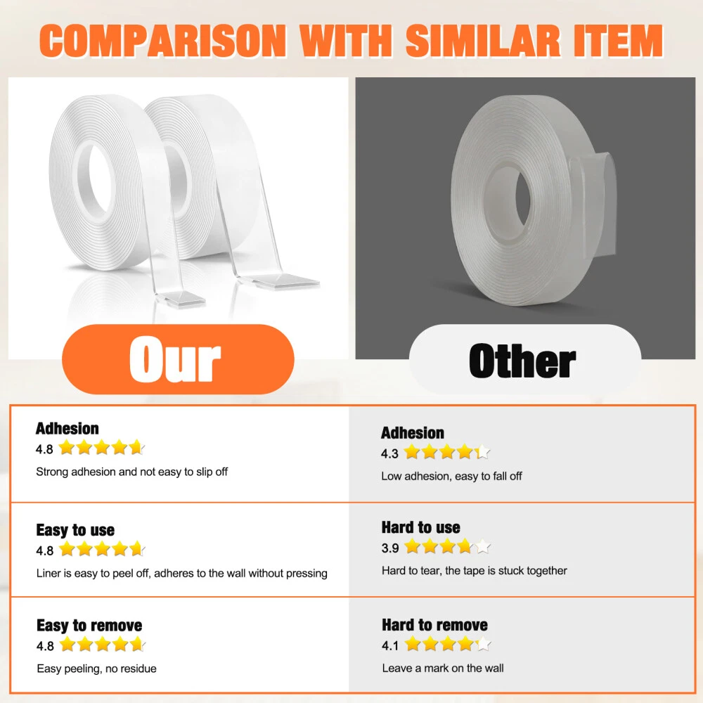 STRONG ADHESIVE Our nano glue allows easy and damage-free attachment of items to the wall.Made of leading acrylic gel material, this clear adhesive double-sided tape demonstrates strong durability and adhesion, three times that of conventional tape. And it is very easy to remove and leave no residue. MULTI FUNCTIONAL DOUBLE-SIDED TAPE The double-sided transparent tape can be used for car phone holders, posters, picture frames, pen holders, wall stickers, hooks, small tools, sticky pads, phone cases, patches, decorative items, and wall decor. Additionally, this tape is washable and reusable. SAFE NANO GEL MATERIAL: This double sided mounting tape is non-toxic, environmentally friendly and recyclable. transparent, no residue, removable. STRONG STICKY: Unlike ordinary tapes, this washable adhesive tape is used the most advanced nano-technology, made of the latest acrylic gel material, ensuring high viscosity, durability, elasticity, and residue-free performance. It adheres perfectly to smooth, clean, non-porous surfaces like glass, windows, doors, wardrobes, table tops, bathroom tiles, and marble. Not suitable for powder wall, plaster wall, rough wall, or paint wall to prevent wall damage. WASHABLE & REUSABLE: The reusable transparent two sided tape can be easily cleaned with water when dirty, but avoid using other wipes or detergents. Simply wash and dry the tape to restore its stickiness for repeated use, with the caveat that the number of uses may vary depending on viscosity. EASY TO USE: Easily cut to any size and length you want! It can be stretched, bending and folded out of shape to meet your needs. The transparent double-sided tape is very easy to remove and leave no residue. MULTI-FUNCTION AND NO MORE MESSY: Say goodbye to disorderly small items with this removable mounting tape. It is versatile and can be used in various settings such as home, office, wardrobe, and bathroom. Use it to easily fix frames, photos, festival decorations, posters, carpets, power sockets, wall stickers, hooks, small tools, pads, phone cases, patches, , wall decor and more, lightweight items.