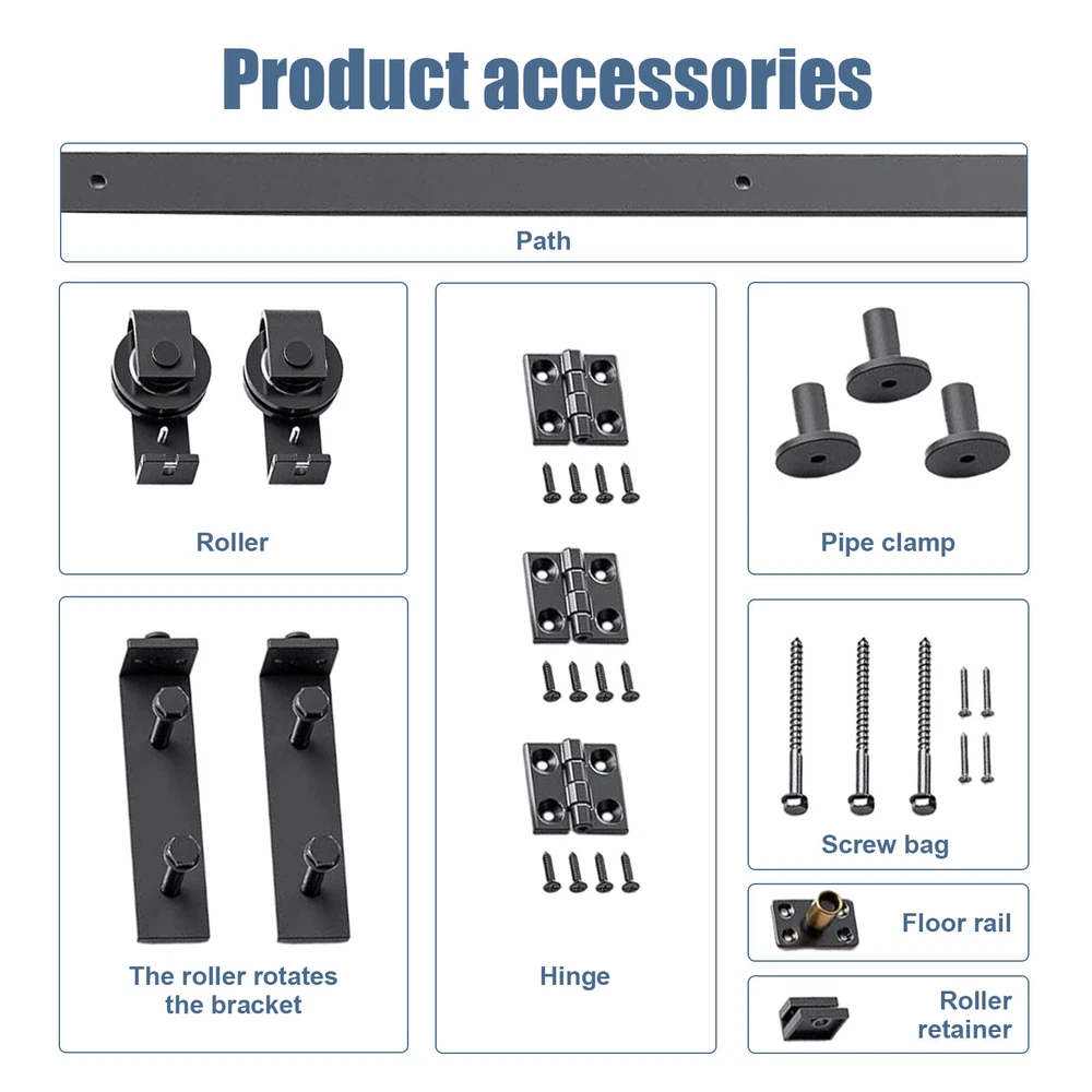 Store category Sign Up Now ! You may also like Product Description Use Easily: With its high-quality bearings and sturdy nylon wheel, this 6mm thick track ensures a smooth, quiet slide, while significantly increasing the door's carrying capacity. Durability Assured: Expertly crafted from carbon steel, this Barn Door Hardware Kit promises longevity, resisting wear and deformation with ease, ensuring smooth operation over time. Space-saving Hardware Set: Our Barn Door Hardware Kit allows you to easily slide your door, providing a good user experience and goodly saving your space. Upgrade your home's functionality and make your life more convenient with this space-enhancing design. Widely Used: Transform your space with Barn Door Hardware Kit, suitable for various areas like chic living rooms, trendy dormitories, modern study rooms, and cozy apartments while adding elegance and style to your decor. Effortless Installation: Our Barn Door Hardware Kit simplifies setup with intuitive instructions and visual aids, ensuring a quick, straightforward installation process. Transform your dormitory or home with the Sliding Door Rail Kit. Improve carrying capacity and save space while ensuring no damage or deformation. Comes with detailed instructions for easy installation. Specification: Name: Barn Door Hardware Kit Colour: Black Material: carbon steel Track size: about 28 inches (70CM) Track splicing method: 2 pieces Scope of application: Door panel with 0.5MM-50MM (0.02in-1.97in) thickness Packing List: 2x tracks 2x scroll wheels 2x roller swivel stands 1x roller holder 3x pipe clamps 3x hinges 1x floor rail 1x sealing strip 1x screw pack 1x instruction manual Payment Delivery details Terms of sales About us Feedback & DSRs Payment Before you palce an order, please kindly make sure that you have a paypal account. We accept PAYPAL payment only. Payment should be completed within 2 days after auction closed, or unpaid dispute will be filed for an closing auction. An unpaid case will be filled after 4 days. Delivery details We ship to your eBay address. Each package will be shipped to US by UPS Regular Parcel with tracking number. Please check your shipping address carefully before checkout, it can't be changed if order completed. All items will be shipped within 1-2 business day upon receipt of payment.Orders placed on weekend will be shipped within 3 days. If you do not receive your item in 7-10 business days.please contact us immediately for further assistance. We will be responsible for any damages or losses incurred in the shipping process. About us We maintain high standards of excellence FIVE STAR and strive for 100% customer satisfaction! Positive Feedback is very important to us. We hope that you contact us immediately Before you give us neutral or negative feedback, so that we can satisfactorily address your concerns. We promise to offer the lowest price and high quality produce. Our working time: From Monday to Friday(9:30 am to 18:00pm), we don't working on holidays ,hope you can understand and know that , thank you. Please always talk to us via ebay Message. We appreciate your business and look forward to growing our e-Bay sales with satisfied customers. Feedback Contact us If you have any questions, please feel free to contact with us by ebay Message during our business hours ( 9:30a.m. to 5:30 p.m.), or email us through eBay, we will try our best to help you to resolve it. For any presale or after-sale questions,please do feel free to email us! Due to the time difference, each email will be replied within 1 working day,and weekend will be delayed a bit. Feedback