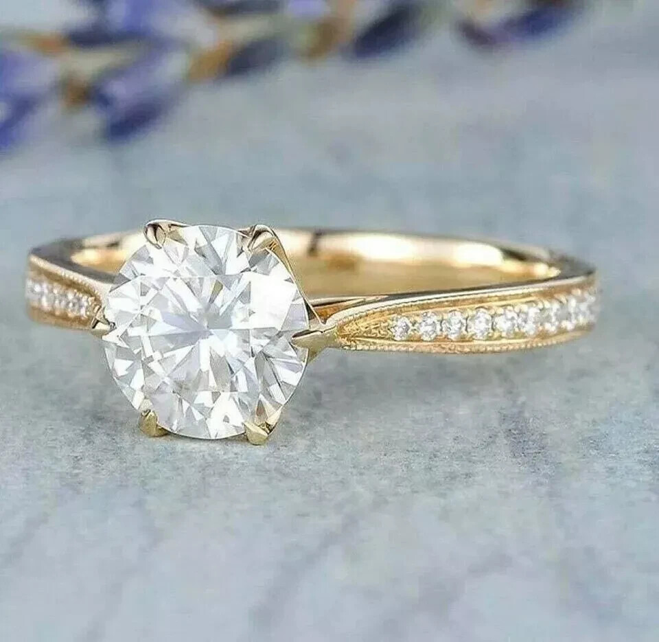 Elevate your special moments with the exquisite 2CT Round Cut Lab Created Diamond Engagement Ring, beautifully set in 14K Yellow Gold Plating. A symbol of love and commitment, this ring is designed for all ring sizes, ensuring a perfect fit for any occasion. Crafted with a prong setting, the main white diamond sparkles with a round shape and an excellent cut grade, bringing a total carat weight of 2.2Ct to your everyday elegance. With its solid gold pattern and the brilliance of a very, very slightly included (VVS1) diamond, this ring is a testament to timeless style and quality. Whether it's an anniversary or a promise of a forever love, this ring from sanavi_4215 is an unforgettable choice, complete with the option for personalization to make it uniquely yours.