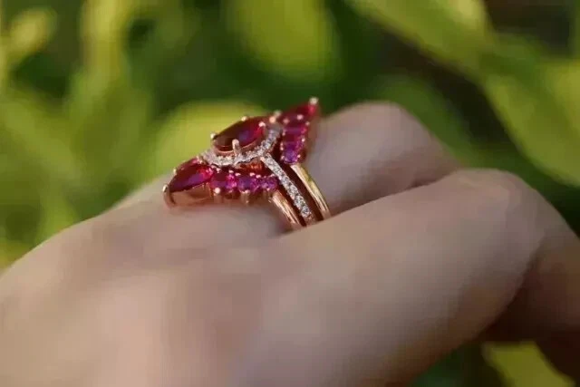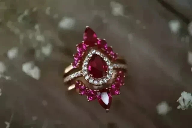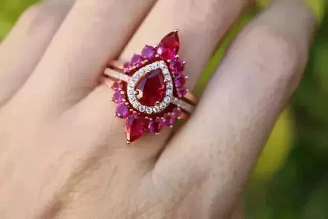 2Ct Pear Cut Simulated Pink Ruby Engagement Trio Ring Set 14K Rose Gold Plated