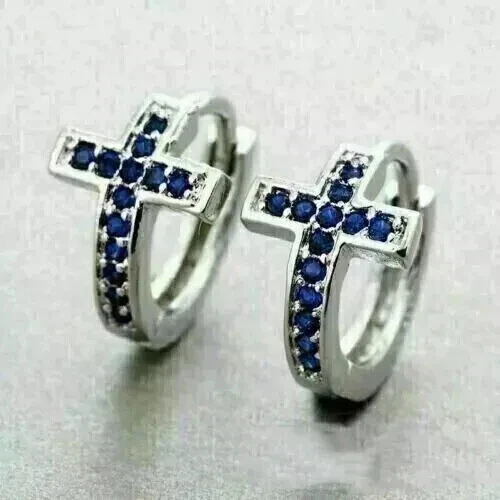 2Ct Round Cut Simulated Sapphire Cross Women's Hoop Earring 14kWhite Gold Plated