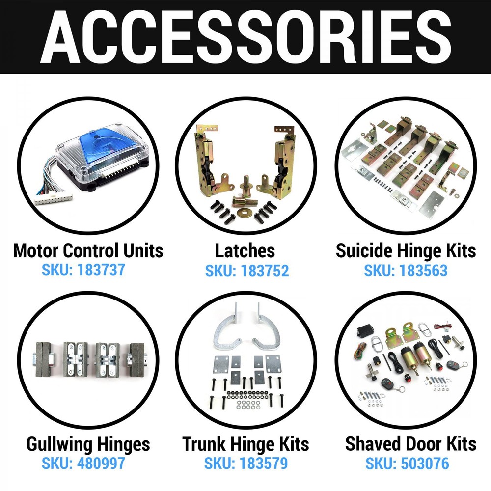 WE ARE PARTS! With over 75,000 square feet of OEM Style parts, restoration, suspension components and aftermarket accessories for your ride under one roof we got you covered. If it is stock, custom, old or new we got the parts for your ride! Custom Supply Warehouse has been owned and operated by the same family for over 50 years and we are proud to share our philosophy of offering large amounts of quality auto parts and accessories to select from at the best prices available PERIOD! In addition we offer expert technical advice along with our world famous customer service. If your looking for OEM, hot rod, restoration, or aftermarket parts for any type of vehicle, you will find it here! 2 Door Automated Motor Upgrade Kit for Car Truck Lambo Gullwing Vertical Hinges Sku # 2E98B6 Condition New Brand Autoloc Unit Of Measure 1 AutoLc Universal Automated Motorized Power Door Hinge Kit (2 Door Set) AutoLcs Universal Power Door Hinge Kit allows you to upgrade any manually operated gullwing, suicide, lambo, upright, or vertical door hinges to power operation. 2 door kit. Includes 2 heavy duty AutoLc linear actuator motors with 4 mounting brackets, designed to lift open your doors both quickly and smoothly. Ideal for gullwing doors, suicide doors, butterfly doors, lambo doors/vertical doors, and more! AutoLcs heavy-duty linear actuator motors can be used to power a variety of 12V operations. Common uses include; power-operated hoods, trunks, amp racks, tonneau covers, gates, TV displays, hidden compartments, or any other applications where heavy lifting is required. Up to 200 lbs. of lifting power per actuator! AutoLcs heavy duty linear actuators include built-in limit switches, which when combined with an AutoLcs motor control module, will allow you to program your own custom run times and distances. Motor control modules SOLD SEPARATELY. Please see AutoLc motor control SKU numbers listed below. 2 function motor control module (SKU: 9787) 4 function motor control module (SKU: 9788) 6 function motor control module (SKU: 9789) 8 function motor control module (SKU: 9790) ***PRO TIP*** The stroke is adjustable. i.e. For example, setting the start/stop points on a 8" motor can be limited to 4" by setting these points. They are located below a cap on the bottom of the linear actuator. (See Fully Adjustable Image). Includes detailed instructions, Free Live USA Technical Support, and a Limited Lifetime Warranty. ---------------------- :: Linear Actuators # of Actuators :: 2 Included Max Weight :: Each Lifts up to 200lbs Motor :: Heavy Duty Torque Method :: Screw Drive Adjustable :: Yes Limiter :: Built In Switch Travel/Stroke :: 8" Collapsed :: Length 17" Extended :: Length 25" Gear Ratio :: 10:1 Quick Operation Assembly :: Sealed & Lubricated Material :: Steel ---------------------- :: Other Mounts :: 4 Bolt On Brackets Instructions :: Detailed Instructions Warranty :: Limited Lifetime Warranty. Shipping Policy: In order to have faster service please pay for all items at the same time of purchase. If shipping rates do not combine properly, contact us or send a buyer requested total. You must contact us before making payment to combine your items. Failure to do so will result in separate shipping fees for each individual item. I am sorry but cannot combine your order if you have already paid. Returns: We want you to be satisfied with your purchase. If within 60 days after you receive your shipment and you are not satisfied, you may return the item for a refund or an exchange. Please note all exchanged or returned merchandise must be in original factory condition with no modifications or alterations. You must ship orders back prepaid. We do not accept COD packages. All exchanges need to have reshipping charges included. Please note there is no returns on special order, custom made, or closeout merchandise Warranty: For warranty information please contact the product manufacturer directly. In some cases stock photos may not be an exact representation of the item. Please read all product info, descriptions and terms before purchasing. Duties & Taxes: You are responsible for all duties and taxes for your local area. This includes but not limited to international shipments. We can not quote you these fees, so you need to contact your local tax authority to confirm the amounts if any in your area.