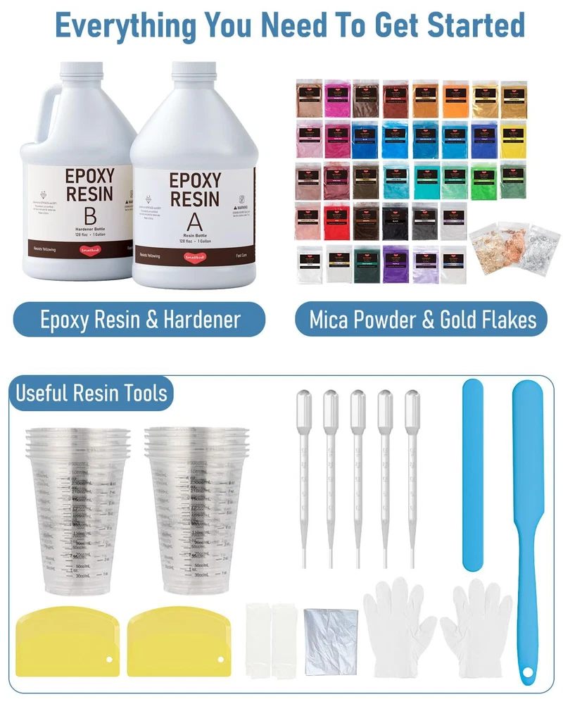 2 Gallon Epoxy Resin Kit with 36 Colors Mica Powder, Gold Foil, Cups & Stick, Crystal Clear Resin Beginner Supplies for Coating Casting Table, Molds, Jewelry Making, DIY Art Craft, 1:1 Ratio VALUED RESIN KIT - Includes 1 gallon resin and 1 gallon hardener, 36 colors mica powder, 3 PCS gold foil flakes, 20 measuring cups, 2 plastic scrapers, 2 silicone sticks, 10 gloves, 5 pipettes, 2 tablecloths, 1 disposable apron and a user manual. All the essentials you need to start your resin work CLEAR EPOXY RESIN - epoxy resin features advanced formula, adding a high gloss bubbles free finish on your resin work. The cured resin is durable, hard as rock, heat resistant and UV resistant, stays crystal clear over time EASY TO USE - Just mix the resin and hardener 1:1 by volume in room temperature. Our resin is self leveling and self degassing, easily creating an even smooth surface and clear finish. Usually you will have 45 minutes of work time and it takes 24 hours to fully cure FOOD SAFE EPOXY RESIN - Our epoxy resin is made from premium materials, conforming to ASTM D4236 standard, totally non-toxic. Our low odor, non flammable epoxy is free of VOC emissions, safe to contact with food after curing WIDE APPLICATION- Our crystal clear epoxy resin is ideal for all casting, coating, art crafts, jewelry, molds, countertop, wood work. epoxy resin also works well with the included mica powder and other color dice, which brings more color and stunning effects to your project. Join us and become creative 2 Gallon Epoxy Resin Kit with 36 Colors Mica Powder Shipping We offer FREE shipping on all orders! We ship within Three business days of payment, usually sooner. We use a selection of shipping services such as UPS, FedEx, USPS etc. We only ship to the lower 48 states, no APO/FPO addresses or PO Boxes allowed. Local pickups and combined shipping options are not provided at this time. Return You can return a product for up to 30 days from the date you purchased it. Any product you return must be in the same condition you received it and in the original packaging. Please keep the receipt. Payment We accept payment by any of the following methods: PayPal Please pay as soon as possible after winning an auction, as that will allow us to post your item to you sooner! Feedback Customer satisfaction is very important to us. If you have any problem with your order, please contact us and we will do our best to make you satisfied. Contact Us If you have any queries, please contact us via ebay. We usually respond within 24 hours on weekdays. Please visit our eBay store to check out other items for sale! Thank you for shopping at our store.