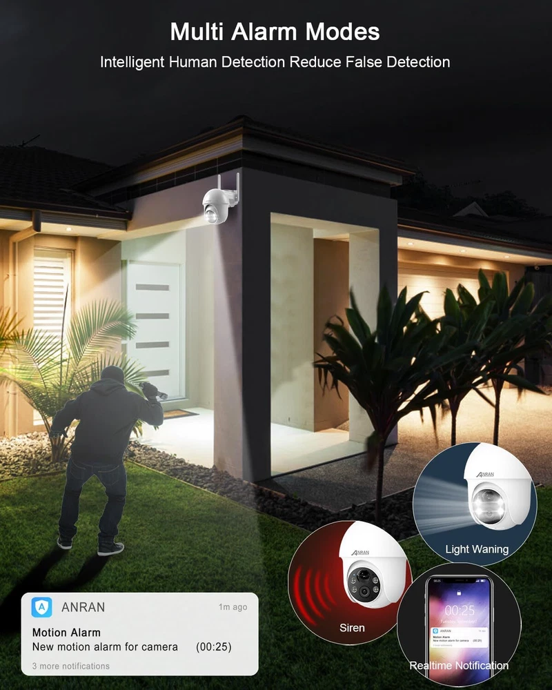 No wires or power cords needed. Only need to install the bracket to the wall and fix the camera on the bracket with simple tools, you can easily set up the outdoor PT camera within 10 minutes. Crisp Image & 360°View: Solar Powered Camera takes a panoramic shooting and make sure no blind spots or zone,and get great video quality. Great IR night vision in darkness as well as Color night vision enabled by 4 powerful spotlights. Smart Siren Alarm and Spotlights: Unique Smart Siren Alarm feature work with Spotlights is really an awesome design when the wireless security camera detects unexpected visitors at night in darkness and derters them off your place right away. No Wiring No Hassle: No electrical wiring jobs,100% wire-free outdoor camera comes with built-in rechargeable batteries of large capacity and gets non-stop power by the solar panel kit included . Smart PIR Human Detection: Be notified instantly when security camera wireless detects unexpected visitors, and talk to them by 2.4G WiFi stronger connection than 5G WiFi (not support) outsides crossing walls. US-Based Support and Cloud: US-Based support and service via phone and email. US-Based cloud service (optional) with encrypted secure data and privacy protection