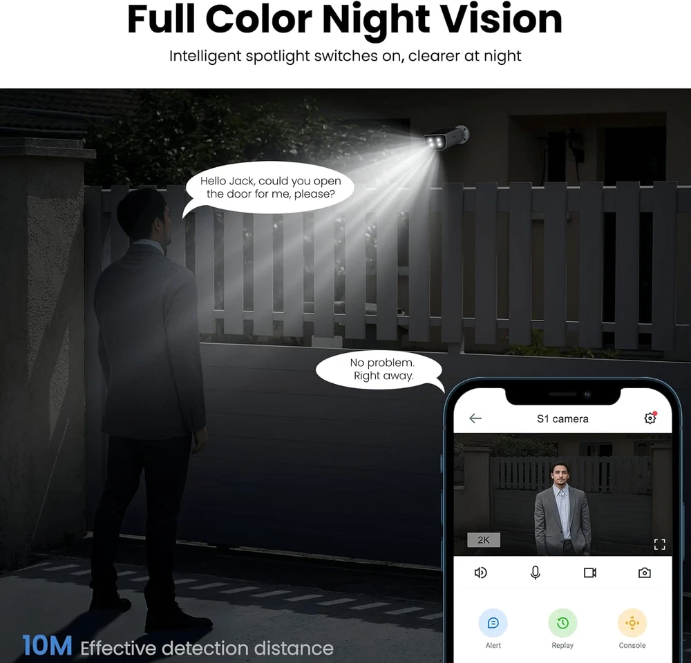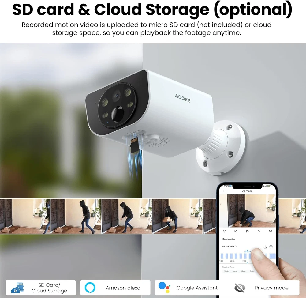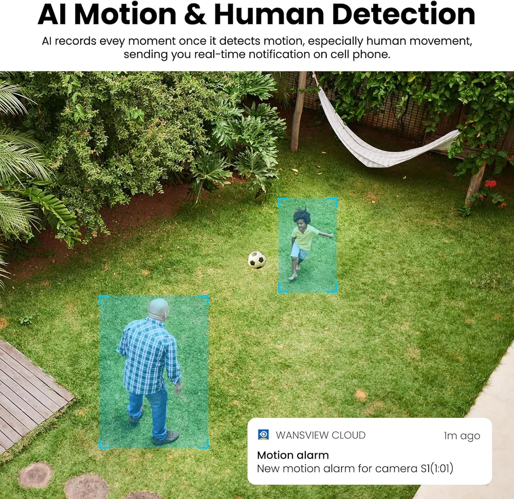 Store New Arrivals Add to Favorite View Feedback Contact 2K Solar Camera Outdoor Wireless-2.4Ghz Wifi Cameras for Home Security, Continuous Power, Color Night Vision, SD Card/Cloud Storage, Waterproof, Compatible with Alexa/Google Home S1 (1 Pack) Description Style 1 Pack Photo Sensor Technology CMOS Number of Items 1 Power Source Battery Powered, Solar Powered Item Dimensions 4.49 x 3.58 x 2.24 inches Focus Type Auto Focus Control Method App Night Vision Range 33 Feet Controller Type Android Unit Count 1.0 Count Connectivity Protocol Wi-Fi Effective Still Resolution 3 MP Video Capture Format MPEG-4 Viewing Angle 100 Degrees Number of Channels 2 Model Name S1 Alert Type Motion Only Night Vision Night Color Additional Features Color Night Vision, HD Resolution, 2-Way Audio, Image Sensor, Motion Sensor Specific Uses For Product Surveillance Waterproof Rating IP65 Built-In Media Camera body, Type-C to Type-A Power Cord, installation guide, mounting screws, bracket Video Capture Resolution 1296p Wireless Technology Wi-Fi Item Weight 480 Grams Connectivity Technology Wireless Model S1 Special Feature Color Night Vision, HD Resolution, 2-Way Audio, Image Sensor, Motion Sensor Effective Video Resolution 1296 Mounting Type Wall Mount, Tree Mount, Door Mount Color White Wattage 3 watts Photo Sensor Resolution 3 MP Indoor Outdoor Usage Outdoor Compatible Devices Smartphone Voltage 5 Volts (AC) Are Batteries Required Yes Recommended Uses For Product Surveillance, Home Security, Pet Monitoring, Outdoor Security Wireless Solar Charging & Easy installation: Built-in solar panel, security cameras wireless outdoor allow you to truly get rid of tangled wires, just place the outdoor camera under the solar energy to charge, realizing 365 days of solar energy use continuously. Simply press the power button and follow the in-app instructions to connect the security camera to your 2.4GHz Wi-Fi easily. Not support 5GHz WiFi Crystal 2K Image & Color Night Vision: Compared with 1080P image, the wireless camera outdoor provides you with a sharper image at 2K Resolution, which reproduces the lifelike images, allowing you to view every detail of your outdoor area and prevent threats or intruders. During the nighttime, the security camera outdoor spotlight turns on automatically, offering you clear images even in pitch black. Only work with 2.4Ghz WiFi AI Human Detection Siren & Intelligent Spotlight: The wireless security camera outdoor with PIR motion sensor and automatic spotlight provide you and your family a full-protection on your safety and property. When the wireless camera outdoor detects unexpected visitors approaching your house, it will trigger an audible alarm and automatically turn on the night spotlight to scare the intruders and send you instant notifications, so you can maintain a peace of mind even when you're not at home SD Card & Cloud Storage (optional): The outdoor security camera supports 24/7 motion recording to a micro SD card (up to 128GB, not included) and Cloud Storage service (optional). Additionally, it is compatible with Alexa or Google Home, so you can ask their assistants to show you any location where the Wi-Fi camera outdoor wireless is recording. Not support 24/7 continuous recording Two-Way Audio & Muti-User Sharing & All weather protected: The outdoor cameras for home security with microphone and speaker to ensure clear and real-time remote calls to your family or friends, and even warn off intruders at the door. You can share your camera remotely with your family from anywhere, and they can also access to the solar security cameras with you simultaneously. It is waterproof to withstand any bad weather Product Description The video showcases the product in use. The video guides you through product setup. The video compares multiple products. The video shows the product being unpacked. The security camera with PIR Human Detection can recognize human precisely, minimizing false alarms. 1 PIR Human Detection 2 Color Night Vision 3 2K Crystal Image 4 2-Way Audio 5 Motion Detection & Siren Reduce False Alarms Customize the sensitivity level and retrigger interval to reduce false alarms and save battery power. Privacy Mode Temporarily turn off the outdoor camera wireless as needed. Easy Installation The security camera outdoor can be installed easily and mounted on the wall for minutes. Waterproof With waterproof, the cameras for home security can stand by at any situations without worrying about any incremental weather, like storm, blizzard, etc. Works with Alexa & Google Home Connect your security cameras wireless outdoor to the Alexa or Google home device, then their assistants will display cameras for home security live feed with your voice commands. Note: the wireless camera is not allowed to be viewed on their APPs. Sharing with Multiple Users The outdoor camera make it more convenient for you to share your wireless security camera outdoor with your family members or friends from everywhere at any time, so they can view the solar camera outdoor wireless with you simultaneously. Does this wireless camera support 5G Wi-Fi? No, it doesn't support 5G Wi-Fi, it can only connect to 2.4Ghz Wi-Fi. Does the outdoor camera wireless S1 support 24/7 continuous recording? No, it doesn't support 24/7 continuous recording as it is a low-power camera with requiring power-saving for a balance battery-powered working status. But it can detect and record motion via PIR, generating motion alerts and save them in the app. Does the outdoor security camera support SD card or cloud storage? Yes, you can use both or select one that you need. Pls note that the micro SD card is not included, and it needs to be formatted as FAT32; Its max capacity is 128GB. The Cloud storage is optional. How to enable Motion Alert and receive alert notifications? Please enable the Motion Alert feature on the app first. Go to Camera Settings -- Enable Motion Alert -- Select Time Schedule, then please find General Settings a