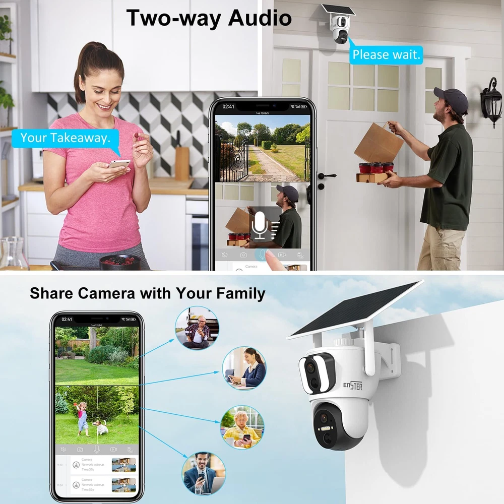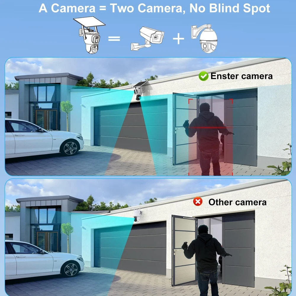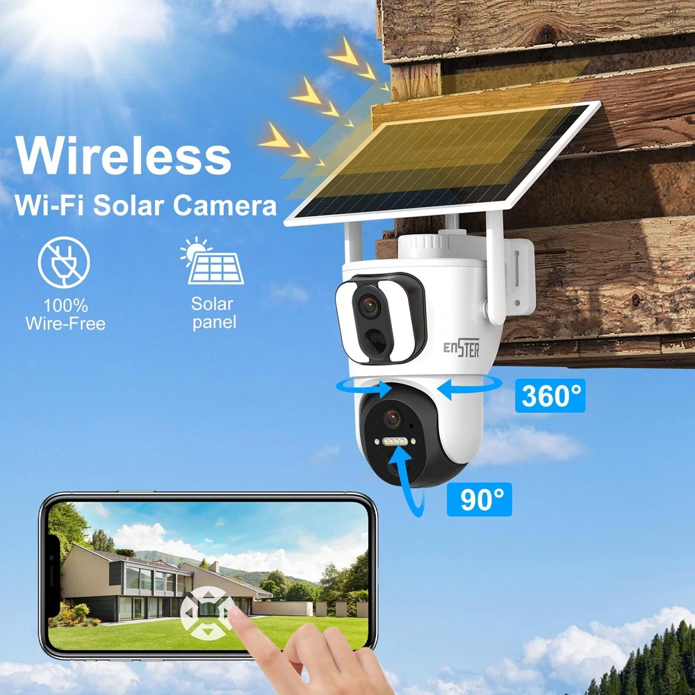 【 2K HD Live Video & Color Night Vision 】 Enjoy 2K high-definition live video with advanced color night vision. The camera ensures vivid, accurate colors even in low-light conditions. Keep an eye on your property day and night with this state-of-the-art security camera, perfect for monitoring your home. 【 Solar Powered Wireless Battery 】 Say goodbye to tangled wires with our solar-powered security camera. The camera features a rechargeable battery that keeps it running as long as there is sunlight. Enjoy hassle-free installation and continuous home security without interruptions. Ideal for maintaining outdoor surveillance. 【 4MP Dual Lens Technology for Full Coverage 】 The dual-lens system in the camera provides comprehensive surveillance. With a 4MP dual lens, it captures a wider and more detailed perspective. Monitor your surroundings effectively with this innovative security solution, designed for optimal home security. 【 Enhanced 360° PTZ Coverage & Night Vision 】 Protect every corner of your property with the Solar Security Camera's 360° PTZ coverage, allowing full 360-degree rotation. Capture every detail, day or night, with infrared LEDs that provide clear images up to 65ft away. Perfect for any home security setup. 【 2.4G WiFi & Two Way Audio 】 Easily access and control the camera from anywhere with 2.4G Wi-Fi. The outdoor camera for home security also features a built-in microphone and speaker, communicate directly through the app. Connect with visitors, deter intruders, and have complete control over your property. 【 PIR Motion Detection & Smart Alerts 】 Stay connected with the Solar Security Camera. Featuring PIR motion detection, you can receive real-time alerts, ensuring you're always informed about your home's security status. Ideal for comprehensive surveillance. 【 Easy Setup & Versatile Storage Options 】 Install the Solar Security Camera effortlessly with its wire-free design. Choose between SD card (up to 256GB) or cloud storage for your video recordings. This flexibility ensures that you can access and store footage easily, enhancing your home security experience. 【 High-Capacity Battery & IP66 Waterproof 】 The Solar Security Camera comes with a high-capacity battery and an IP66 waterproof rating. This means it can withstand various weather conditions, from rain to extreme heat. The solar panel ensures continuous power, making it an ideal choice for reliable home security throughout the year.