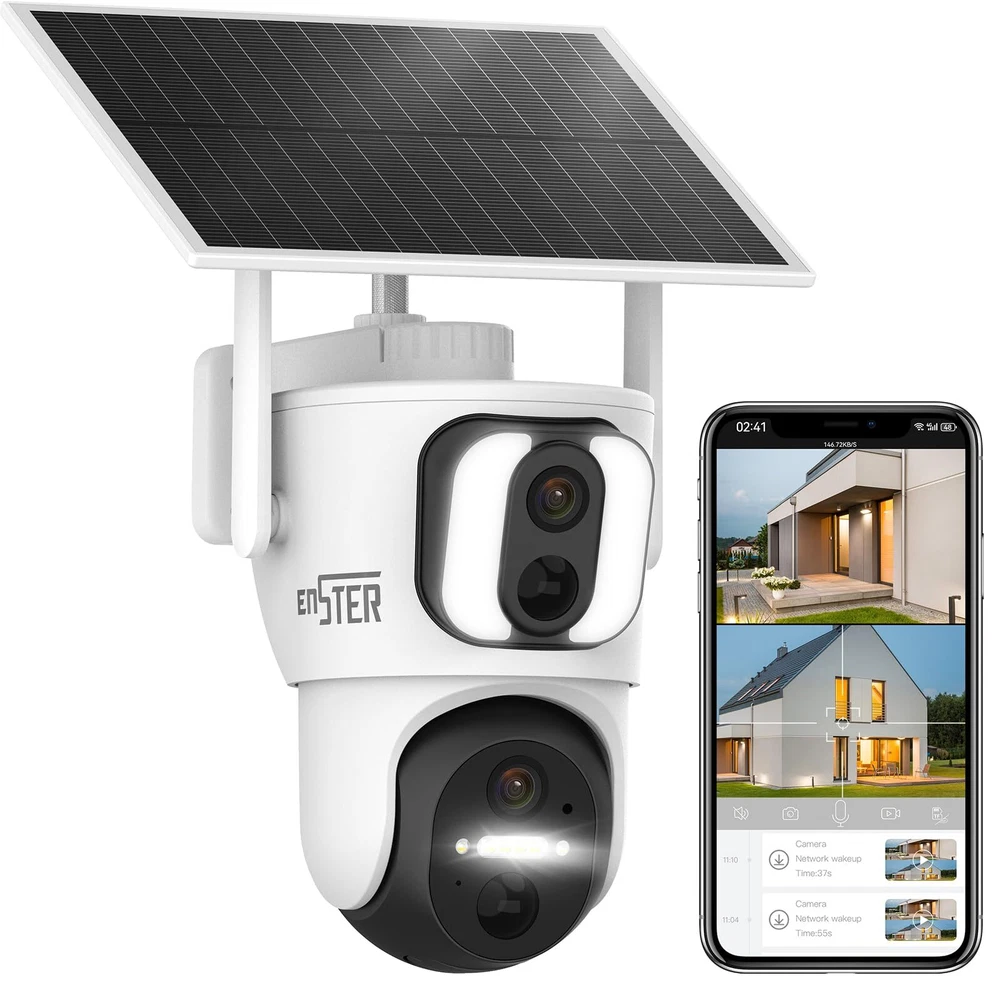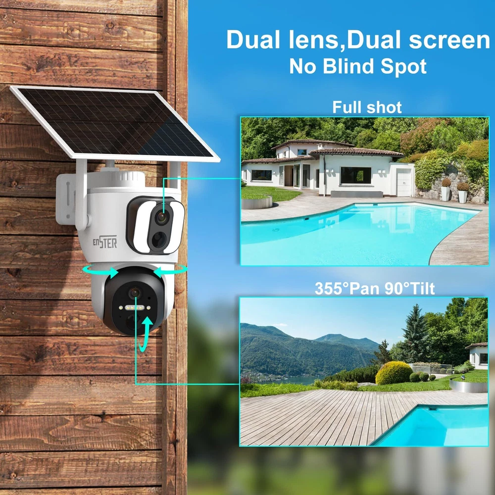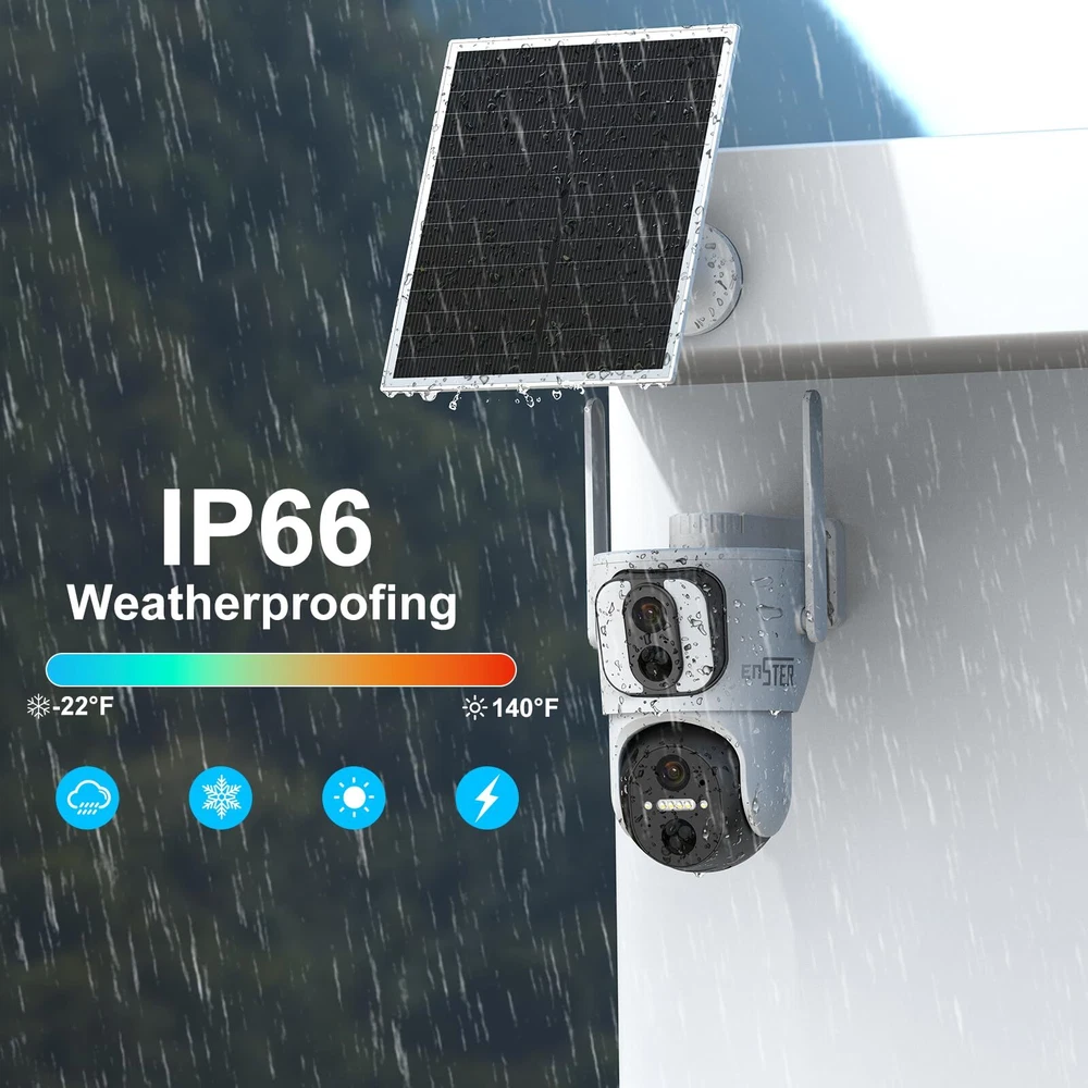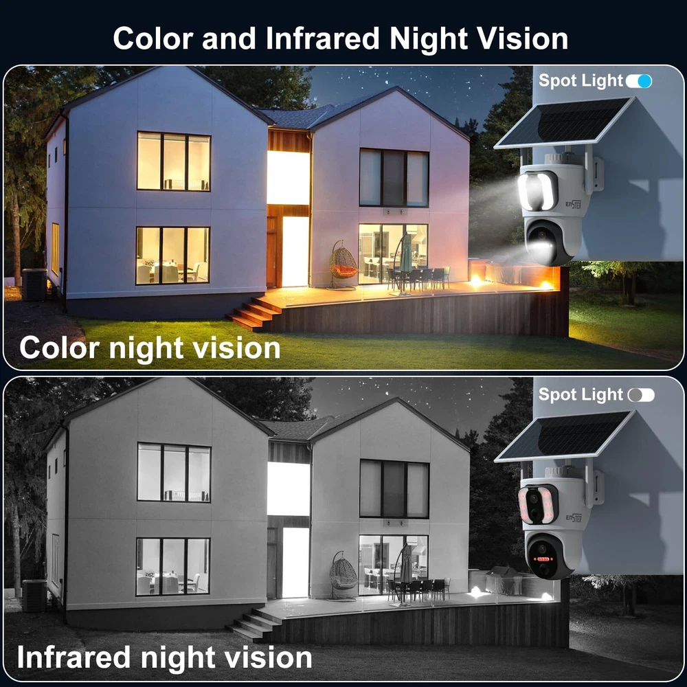 【 2K HD Live Video & Color Night Vision 】 Enjoy 2K high-definition live video with advanced color night vision. The camera ensures vivid, accurate colors even in low-light conditions. Keep an eye on your property day and night with this state-of-the-art security camera, perfect for monitoring your home. 【 Solar Powered Wireless Battery 】 Say goodbye to tangled wires with our solar-powered security camera. The camera features a rechargeable battery that keeps it running as long as there is sunlight. Enjoy hassle-free installation and continuous home security without interruptions. Ideal for maintaining outdoor surveillance. 【 4MP Dual Lens Technology for Full Coverage 】 The dual-lens system in the camera provides comprehensive surveillance. With a 4MP dual lens, it captures a wider and more detailed perspective. Monitor your surroundings effectively with this innovative security solution, designed for optimal home security. 【 Enhanced 360° PTZ Coverage & Night Vision 】 Protect every corner of your property with the Solar Security Camera's 360° PTZ coverage, allowing full 360-degree rotation. Capture every detail, day or night, with infrared LEDs that provide clear images up to 65ft away. Perfect for any home security setup. 【 2.4G WiFi & Two Way Audio 】 Easily access and control the camera from anywhere with 2.4G Wi-Fi. The outdoor camera for home security also features a built-in microphone and speaker, communicate directly through the app. Connect with visitors, deter intruders, and have complete control over your property. 【 PIR Motion Detection & Smart Alerts 】 Stay connected with the Solar Security Camera. Featuring PIR motion detection, you can receive real-time alerts, ensuring you're always informed about your home's security status. Ideal for comprehensive surveillance. 【 Easy Setup & Versatile Storage Options 】 Install the Solar Security Camera effortlessly with its wire-free design. Choose between SD card (up to 256GB) or cloud storage for your video recordings. This flexibility ensures that you can access and store footage easily, enhancing your home security experience. 【 High-Capacity Battery & IP66 Waterproof 】 The Solar Security Camera comes with a high-capacity battery and an IP66 waterproof rating. This means it can withstand various weather conditions, from rain to extreme heat. The solar panel ensures continuous power, making it an ideal choice for reliable home security throughout the year.