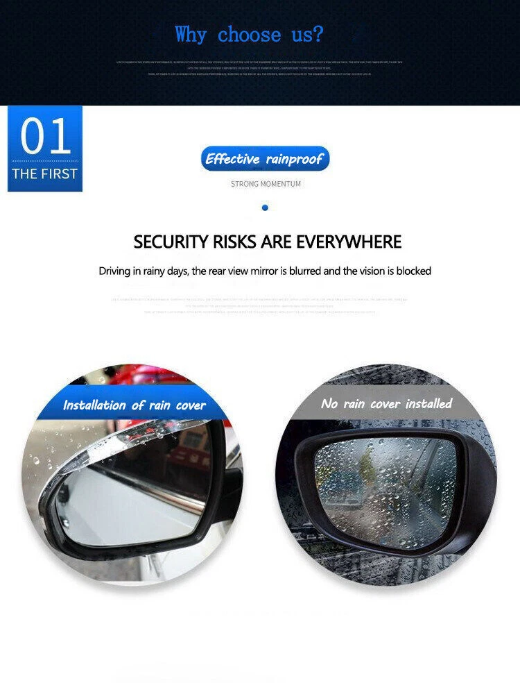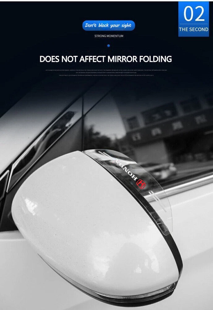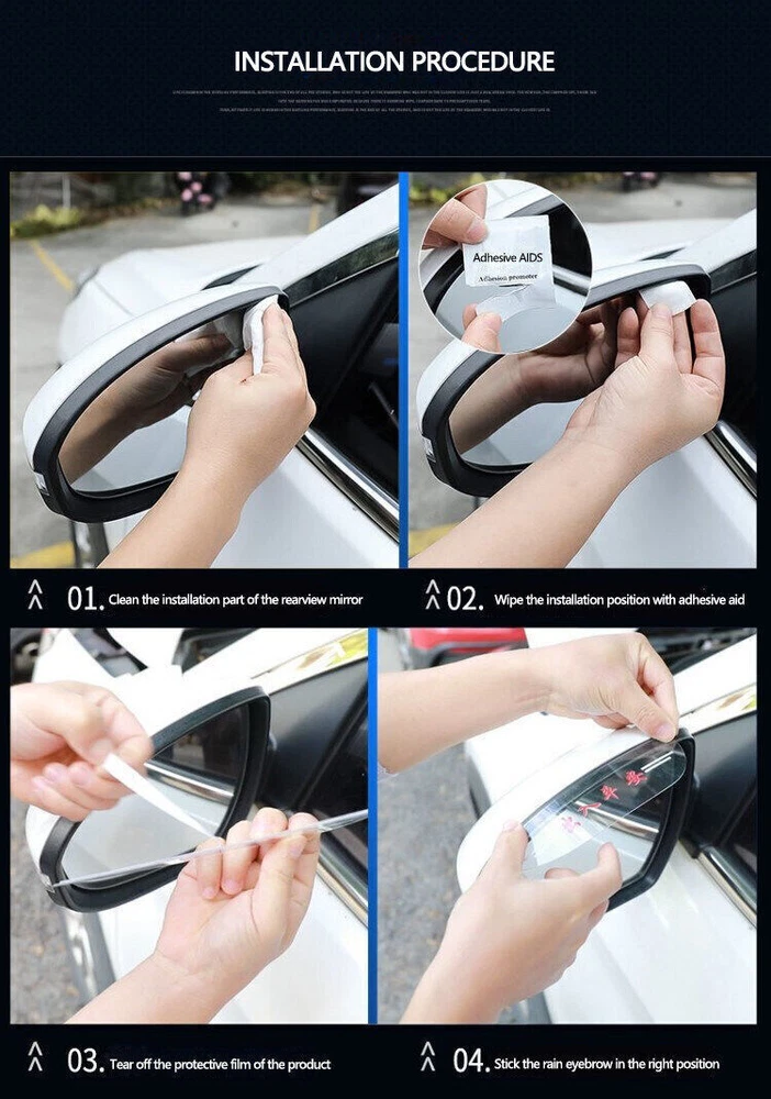 Material: Silicone Dimensions:about 17.7 x 4.2CM Color:as picture Purpose: decorative protect rearview panel, prevent rain Quantity:This pack contains 1 piece left and 1 piece right. Features:Easy installing, without any tools. automotive adhesive tape is attached. Installation Method: 1.This rain shield must be installed in the gap between the frame and mirror glass. 2.In cold weather, if necessary, heat the shield using a hair drier(or other heat source) to make the plastic soft for easy Installation. 3.Prior to installation, clean surface with alcohol and a dry cloth. 4.Remove the protective film from the adhesive and apply to the wanted position. 5.Press firmly to ensure a good grip of the adhesive. 6.Please do not get water within 48 hours after installation. Do not reposition it for pasting to ensure its stickiness. This product is soft and bendable. If it is bent and deformed during transportation, you can use a hair dryer to heat it properly, and then twist it back by yourself. Note:Due to the different light, maybe the photos of description will be differential with the real colors. Package Included: 2pcs Rear view Mirror Rain Eyebrow