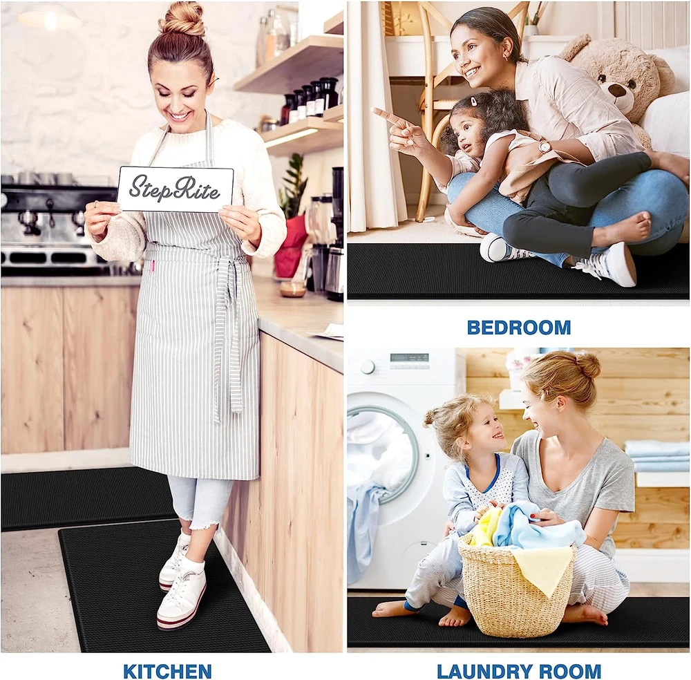 Anti-Fatigue Comfort: StepRite 0.4 inch thick kitchen mat offers supportive cushioning that eases strain on your feet and joints, allowing you to stand comfortably for longer periods in the kitchen Stain Resistant: Our kitchen mats have a stain-resistant texture that makes cleaning simple. Whether it’s water, wine, or other spills, you can easily wipe the mat clean with a damp cloth or rag Non-Slip Design: This standing mat features non-slip backing to keep it securely in place on various surfaces like tile, wood, ceramic, and marble. For optimal safety, always place the kitchen mat on dry, flat surfaces Reliable Material: StepRite kitchen rugs are crafted from premium material that maintains its shape and support over time, ensuring long-lasting performance without deterioration Versatility: This anti-fatigue mat is perfect for multiple areas, including the kitchen, laundry room, office desk, doorways, and balconies. It provides a spacious standing area, making it a practical addition for various tasks at home or in the office Product Description