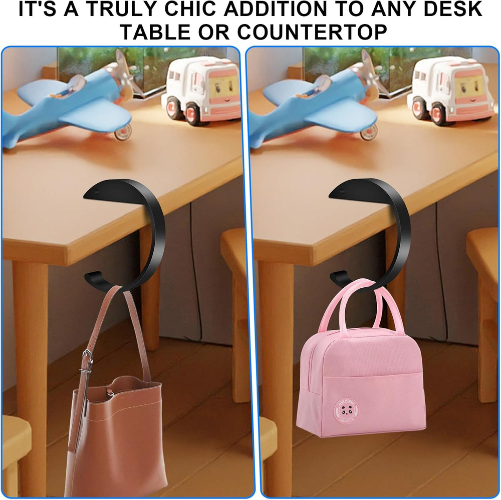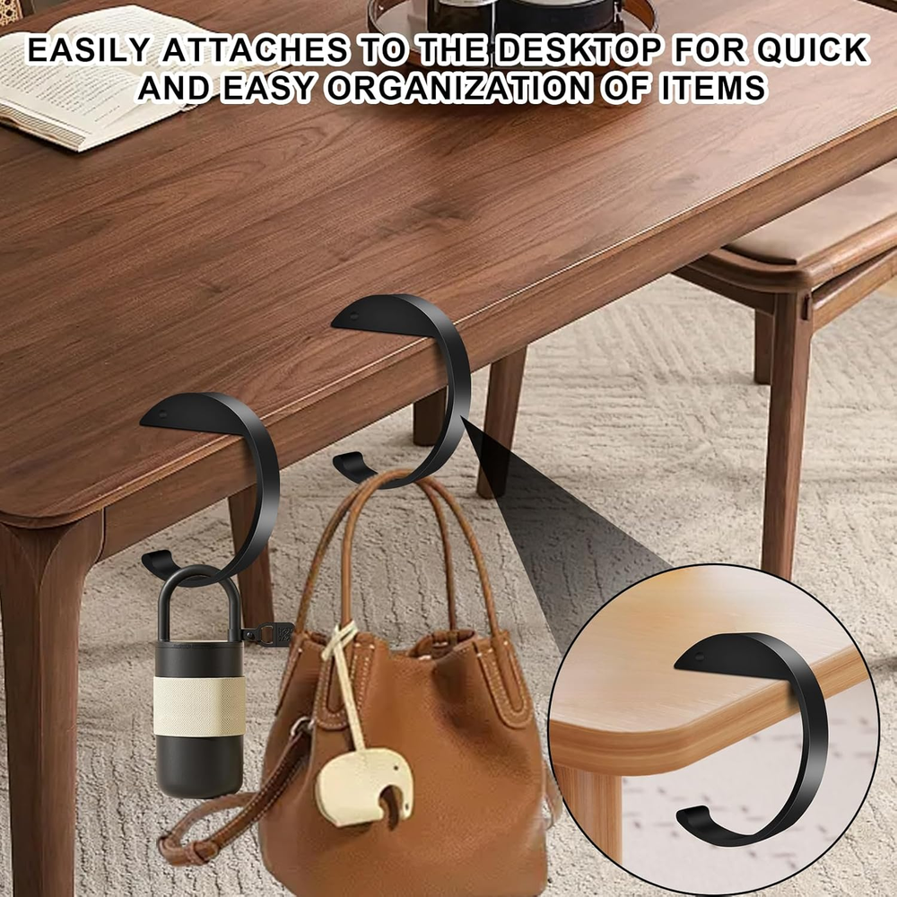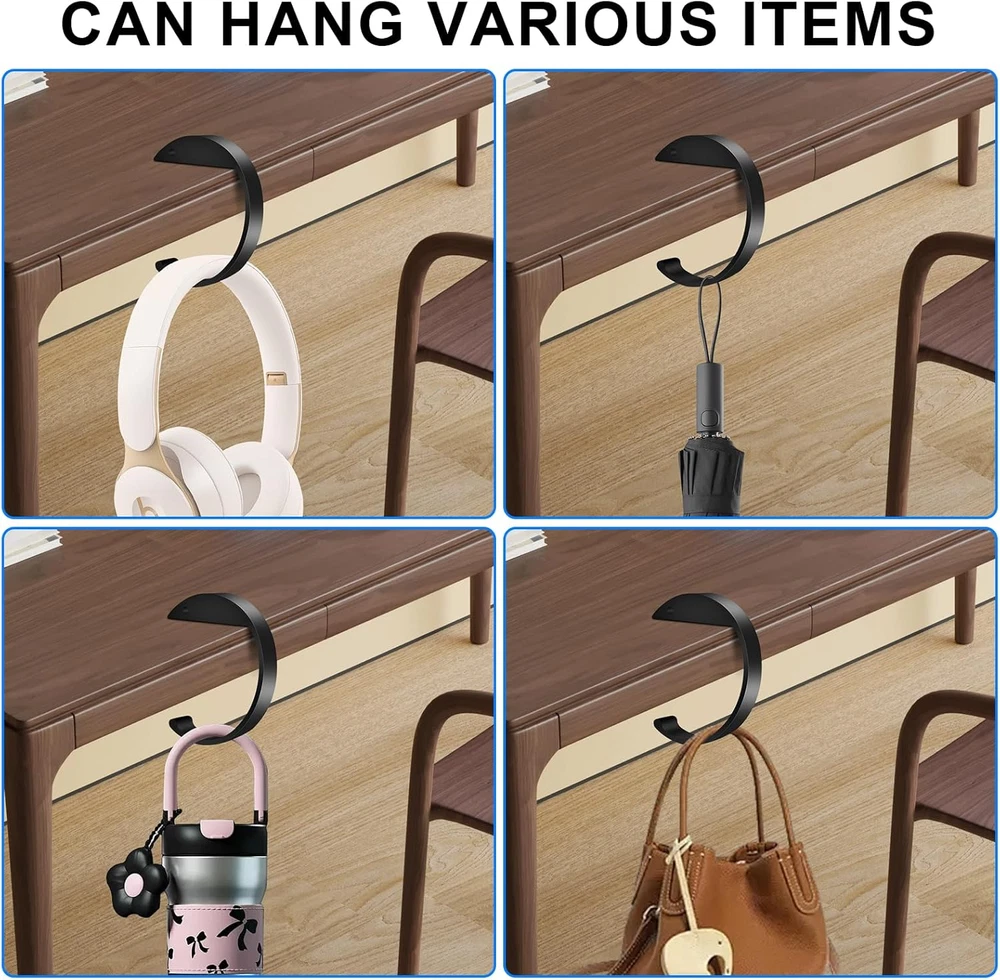 【High Quality Materials】: C Shape Purse Hook from high-strength aluminum alloy, these purse hooks are durable and sturdy, capable of securely holding your bag or purse without bending or breaking. 【Portable Design】: Keep your purse hook for table, or backpack organized with this foldable purse hook. Easily attach it to any table, desk, to save space and protect your items from the floor. 【Versatile & Multifunctional】: Purse hook for desk Not just for purses, these hooks are suitable for holding a variety of small items such as keys, umbrellas, headphones, or even lightweight coats, offering convenience and organization in any workspace. 【Elegant & Stylish】: With a sleek, modern design, this desk purse hook adds an elegant touch to your office or home decor.it’s the perfect addition to your office desk accessories. 【Perfect Gift】: A thoughtful and practical gift, this table hook is perfect for birthdays, holidays, or office events. Your friends, ladies will love this compact, portable solution for keeping their bags organized. Packing list: 2 pcs purse hook for table, 2 adhesive strips.