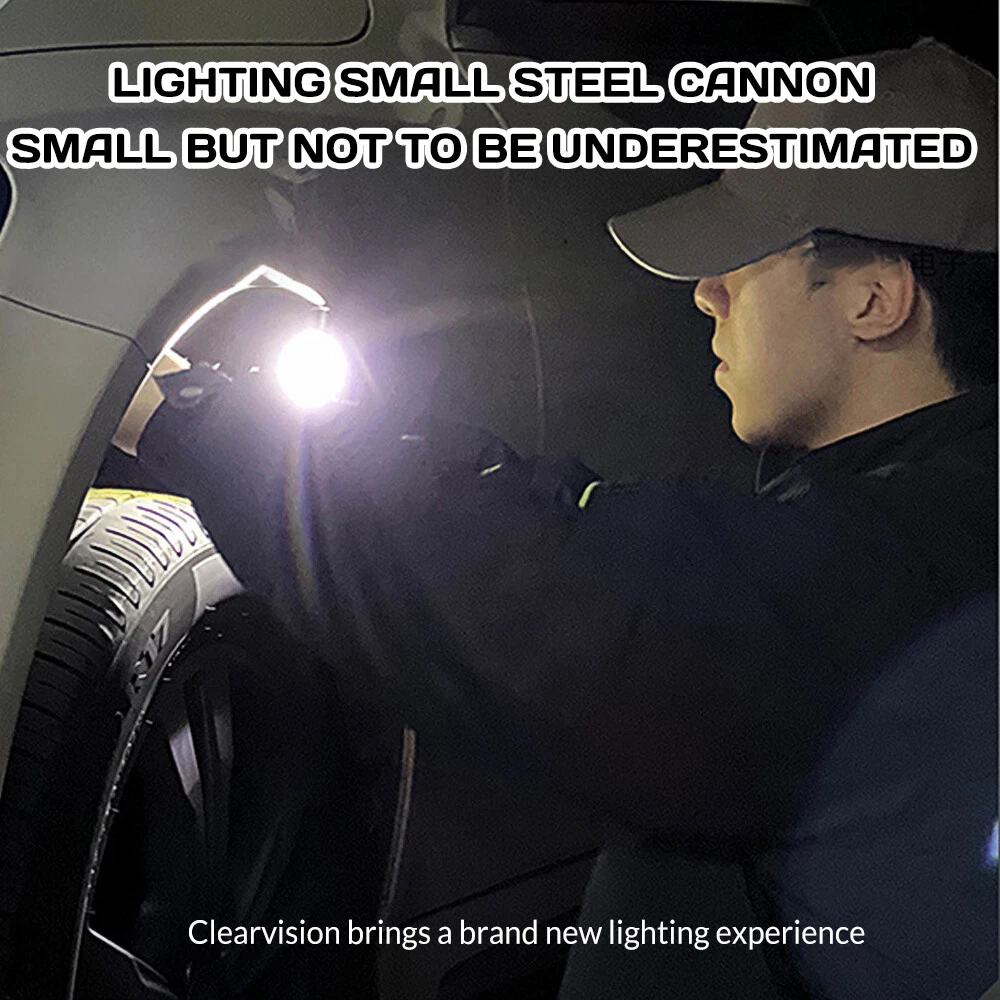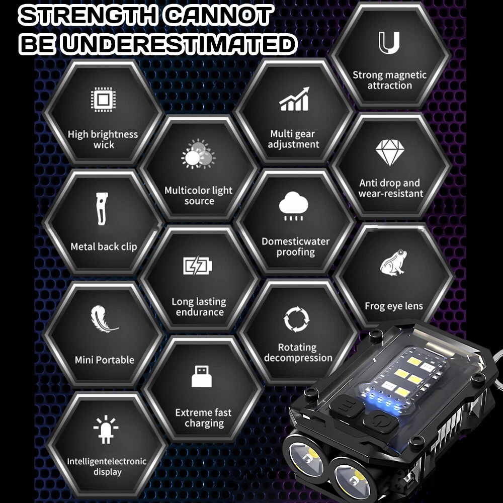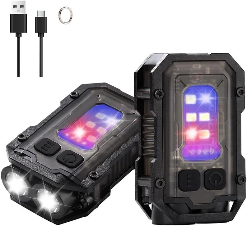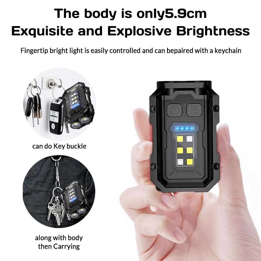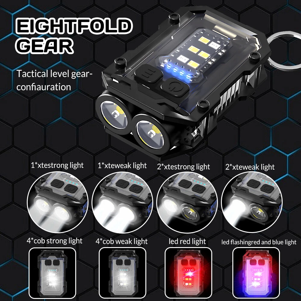 Product Description Purchase Specification: Light bulb: 2 * XTE+4 * COB+1 * LED red light+1 * LED blue light Material: Zinc alloy+Acrylic+ABS Switch: Double press switch Battery: Built in 1 * 800mAh polymer battery Charging method: Type-C USB charging Charging time/battery life: Charging time: ≤ 3H battery life: 3-4 hours Left gear button: 1 * XTE Strong Light -1 * XTE Weak Light -2 * XTE Strong Light -2 * XTE Weak Light Right click: Side light 4 * COB strong light - Side light 4 * COB weak light - LED red light - LED red blue light flashing Long press to turn on/off, click to shift gears Zoom mode: None Waterproof grade: IPX4 Lumen/Range: ≤ 2000lm ≦50m Features: Compact and exquisite, with pen clip and magnet for easy carrying Indicator light: 4 blue LEDs Power indicator: 25% -50% -75% -100% After turning on the light, the LED blue light stays on for a long time. When charging, the LED blue light flashes Product color: Black The package includes : Flashlight USB line English manual Color box