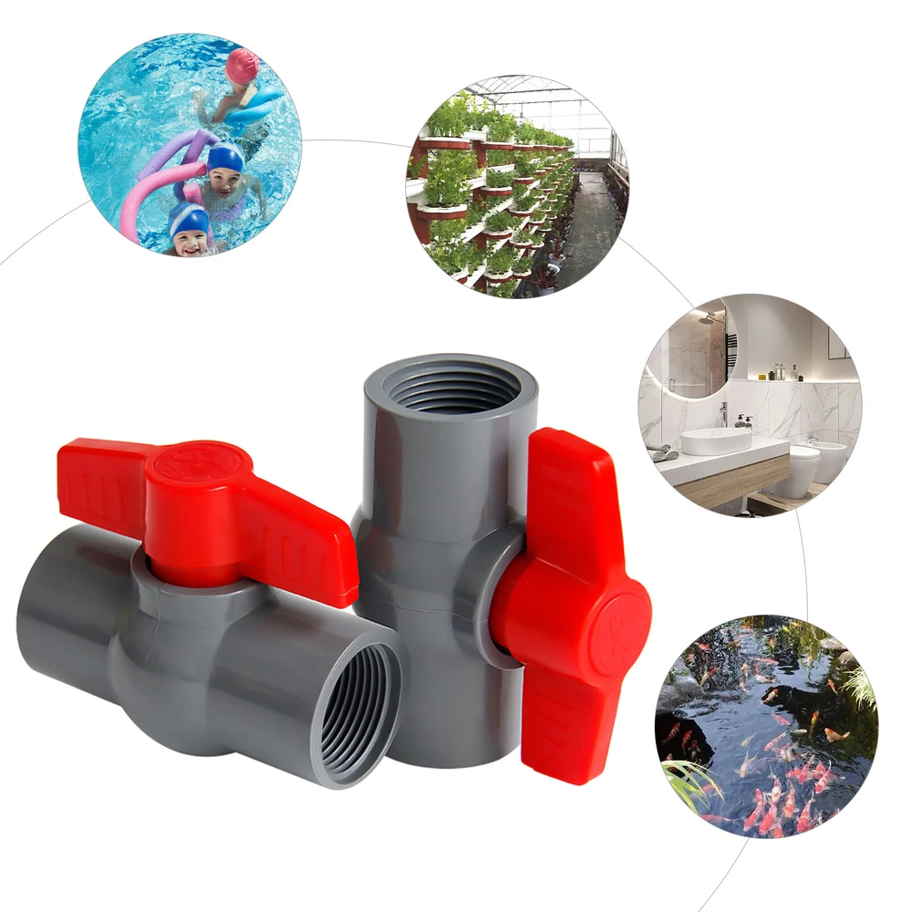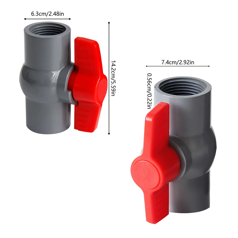 Description This ball valve is made of premium PVC, which is strong and durable. The socket and rubber rings can ensure a tight connection to prevent water leakage. Meanwhile, it can be used many times and is economical. It's your ideal choice! Key Features Premium Material: This product is made of high-quality PVC with high strength, which is non-toxic, lead-free, odorless, wear-resistant, corrosion-resistant, chemical-resistant, shock-resistant, crack-resistant, strong, durable, and not easy to deform. So, it can be used many times, saving you a lot of money. Tightly Connected: The dense socket and rubber rings on both ends can ensure a tight connection between the product and the water pipe, which can prevent water leakage. Highly Functional: It is used for connecting and 2PCS PVC Ball Valves 2 Inch Inner Hole T-shaped Handle Water Air Liquid Valve Description This ball valve is made of premium PVC, which is strong and durable. The socket and rubber rings can ensure a tight connection to prevent water leakage. Meanwhile, it can be used many times and is economical. It's your ideal choice! Key Features Premium Material: This product is made of high-quality PVC with high strength, which is non-toxic , lead-free , odorless , wear-resistant , corrosion-resistant , chemical-resistant , shock-resistant , crack-resistant , strong, durable, and not easy to deform. So, it can be used many times, saving you a lot of money. Tightly Connected: The dense socket and rubber rings on both ends can ensure a tight connection between the product and the water pipe, which can prevent water leakage. Highly Functional: It is used for connecting and controlling flow. When the hole through the ball-shaped disc is aligned with the inlet and outlet of the valve it will allow flow while the sphere is rotated horizontally by 90 degrees it allows the flow to be stopped so that the hole in the sphere is perpendicular to the opening of the valve. A Set of Two: This product includes a total of 2 PVC ball valves , which is enough for you to use. Easy Installation: You only need to apply glue (Not Included) to connect the ball valve and the pipe. This is simple and can save you lots of time and effort. Easy to Clean: The surface of this product is smooth and flat, which is easy to clean. You just need to wipe it with a wet rag. Guaranteed Customer Service: We aim to provide quality products and services. If you have problems, please feel free to contact us. We will reply and solve the problem for you as soon as possible. Details T-shaped Handle: It is ergonomic with non-slip patterns, allowing you to rotate the handle comfortably without hand soreness while preventing slipping. Smooth Inner Wall: It has a smooth inner wall to reduce the resistance of water flow, which can ensure the smooth and rapid flow of water without scaling. Application It is suitable for indoor and outdoor use such as cess-pipe, pool, venting, waste applications, aquaculture, sprinkler system, and agricultural irrigation system. It can be widely used in air, gas, liquid, and steam applications. Specification Color: Grey, Red Material: PVC Style: Modern Inner Hole Diameter: 2inch/5cm Number of Pieces: 2 Maximum Working Pressure: 10kg/22lbs Handle Rotation Angle: Max 90° Water Pipe Connection Method: Adhesive Net Weight: 0.3kg/0.66lbs Gross Weight: 0.6kg/1.3lbs Package Size: 26*16*13cm/10*6*5inch Socket Inner Diameter: 63mm/2.4inch Internal socket Model: 2inch/5cm Outer Diameter: 74.2mm/2.9inch Socket Thickness: 5.6mm/0.2inch Product Height: 142mm/5.5inch Package Included 2* PVC Ball Valves Notes The size of the product is small, please keep it away from children to prevent swallowing. This product is suitable for normal temperature use and can be used for drinking water. Please allow the slight color difference caused by the shooting light and 1-3cm error due to manual measurement, and make sure you do not mind before ordering. Payment Delivery details Terms of sales About us Contact us Payment We accept ebay payment 。 Fees such as import duties, taxes are not included in the item price or shipping costs. These charges are the buyer's responsibility. Delivery details Shipping: 2-9 working days to: USA Terms of sales We maintain high standards of excellence and strive for hundred percent customer satisfaction. Feedback is very important to us. We hope that you contact us immediately before you give neutral or negative feedback, so that we can address your concerns. It is impossible to address issues if we do not know about them! About us Your satis faction is our ultimate goal. We work hard to earn your trust and future business. Our certified technicians have tested each item before shipping. The unit comes with 1 year limited warranty on all manufacturing defects. a) If you receive a defective item, you may return it or ask for a discount. Please contact us within 14 days after you receive the package. b) What you returned must be intact and in its original packaging as re? u. Customer is responsible for shipping costs of the returned item. c) We will cover the cost of shipping back t with the shipping rate indicated in the registration page. We will send you a new unit or refund the full payment you paid. Thank you. Contact us Business Hour Business Hour: Monday To Friday: 8:30 AM to 5:00 PM (Beijing China time) Due to time zones, our reply to your questions may not be immediately. But within above working time, we will reply your email within 24 hours. If it's non-workdays, please kindly be patient and wait till Monday. Please contact us with ebay message. Please feel free to contact us if you have any questions. Monday To Friday: 8:30 AM to 5:00 PM (Beijing China time) Due to time zones, our reply to your questions may not be immediately. But within above working time, we will reply your email within 24 hours. If it's non-workdays, please kindly be patient and wait till Monday. Please contact us with ebay message. Please feel free to conta