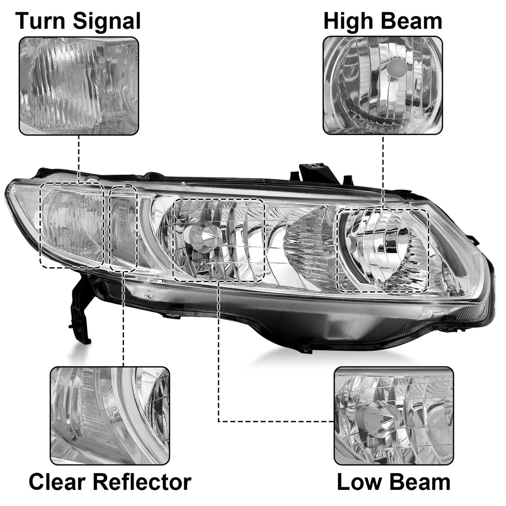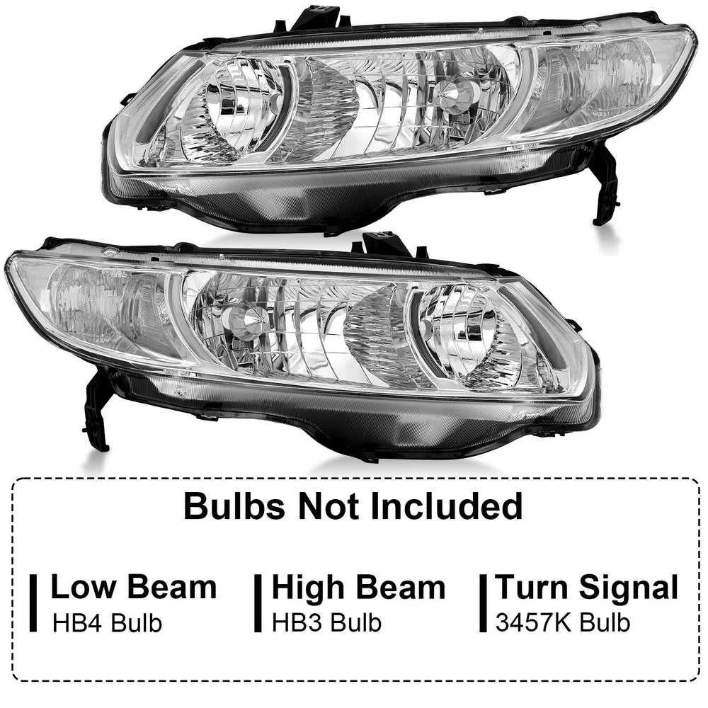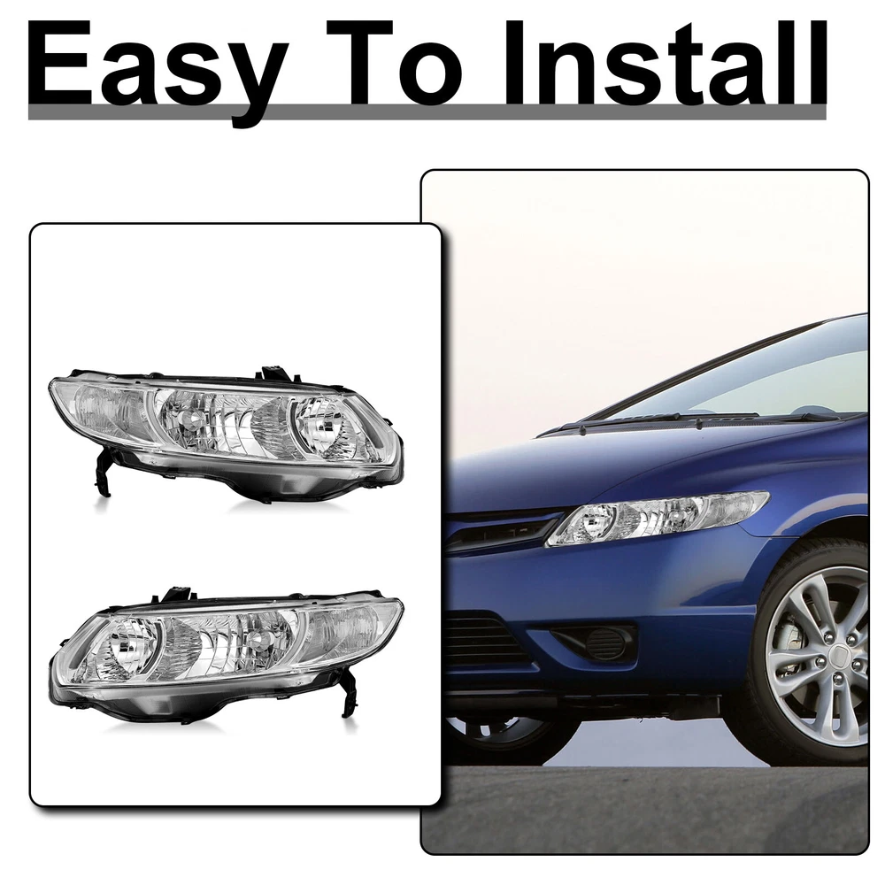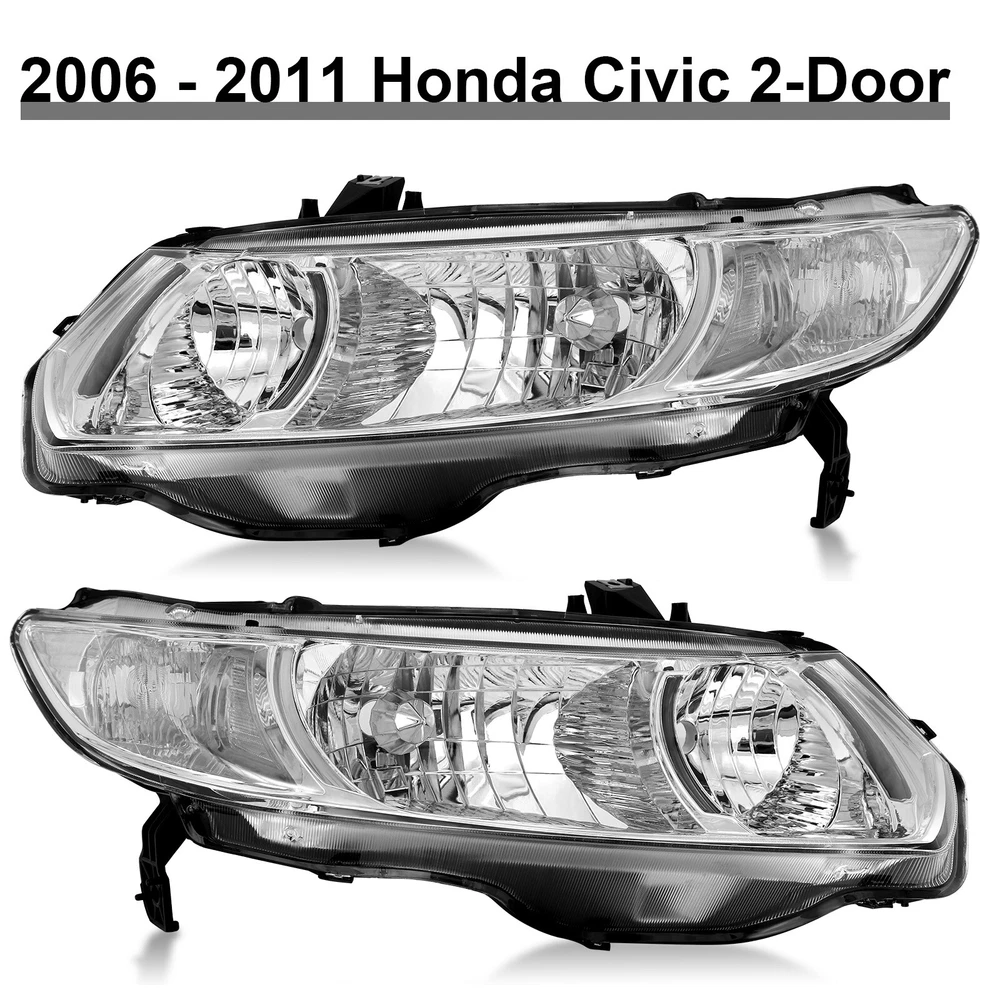 2PCS Pair Headlights For 2006-2011 Honda Civic 2-Door Coupe Headlamps Left+Right Specifications: 1.Color: Black Housing Amber Reflector 2.Material: ABS Plastic+ Polycarbonate Lens 3.The bulb type: High Beam:HB3 (Blubs Not included) Low Beam: HB4 (Blubs Not included) Features: 1.Anti-UV coating specially added to strengthen the lenses 2.Well sealed with premium silica glue and gone through air-tight tests 3.Plug and play operation; no drilling or wiring required 4.Meet or exceed DOT and SAE standards 5.Professional Installation is Highly Recommended. Installation Instruction is NOT Included. 6.3-Months Limited Warranty. Buy With Confidence! Compatible With: 2006-2011 Honda Civic 2Dr Sedan Model Only Not compatible with 4Dr Model Package includes: 1 pair of Headlights Driver and Passenger Side ( Left and Right Side ) Payment Shiping Policy Returns Policy Feedback Contact us Payment We accept PayPal, Google Pay, Credit Cards, and Debit Cards. Shiping Policy All Orders Will Ship Within Two Business Days.Except PR,HI,AK,GU and PO Box addresses. No local pick up All Packages Will Be Inspect Before Shipping, We Will Provide All Packing Material Needed For Your Package For Shipping Such As Boxes, Cushioning And Tape To Improve Shipping Quality. Very Important: Double check shipping address. We are not responsible for incorrect or undeliverable addresses. Returns Policy 60 Days returns satisfaction guarantee. All of Our Items Are 100% Brand New. If The Item Shows Up Defective or Broken, Please Contact Us Within 3 Business Days By Using "Ask A Question" Link Located At The Bottom of Our Listing. Your Questions/Concerns Will Be Responded Within 12 Hours Monday To Friday. Buyers May Contact us On The Weekends or Pubic Holidays And We Will Respond On The Next Working Day. We Will Offer Replacements, Exchange or Full Refund. 100% Satisfaction Guaranteed. We Will File Damage Or Lost Claim For Our Buyers Feedback We will leave a positive feeback immediately after payment is received. We appreciate a positive feedback as much as you do. If you have any issue with order,pls. contact us before leaving a feedback. We will glad to resolve your issue.Your satisfaction is our priority. Contact us If you have any concerns, Pls. feel free to contact us at any time.