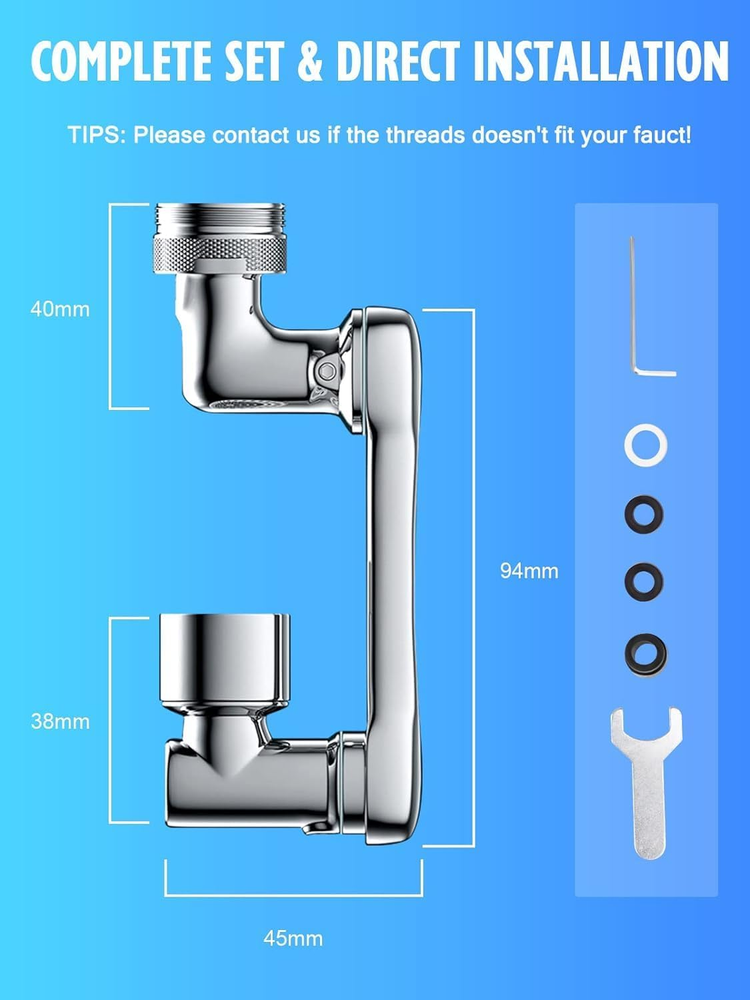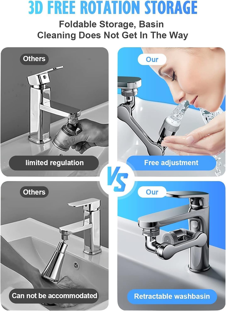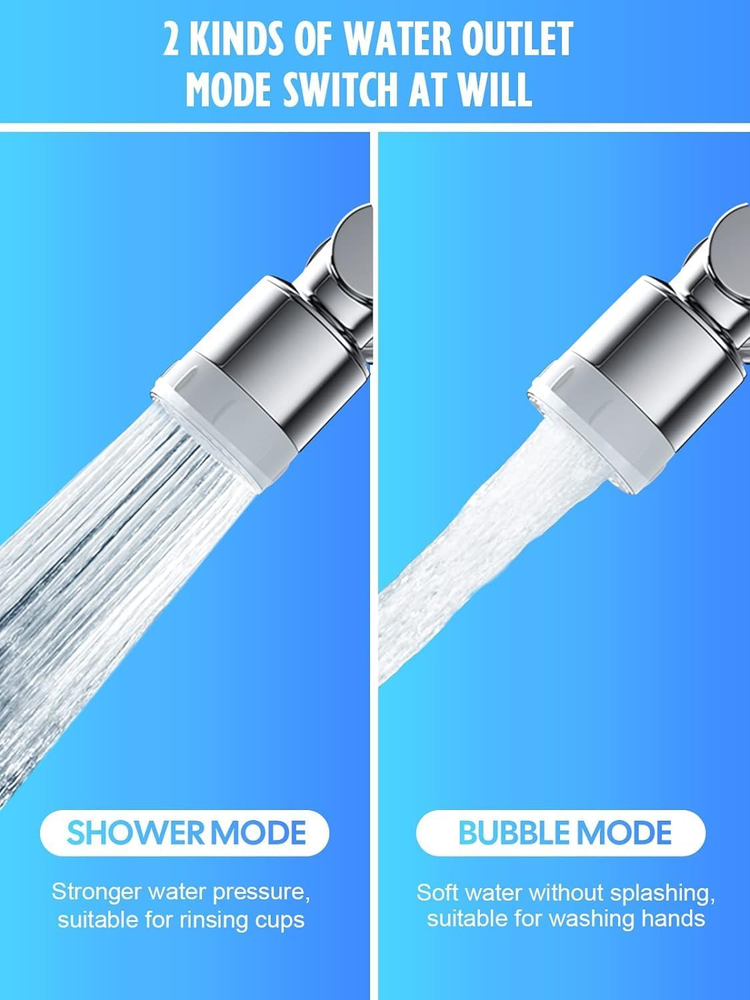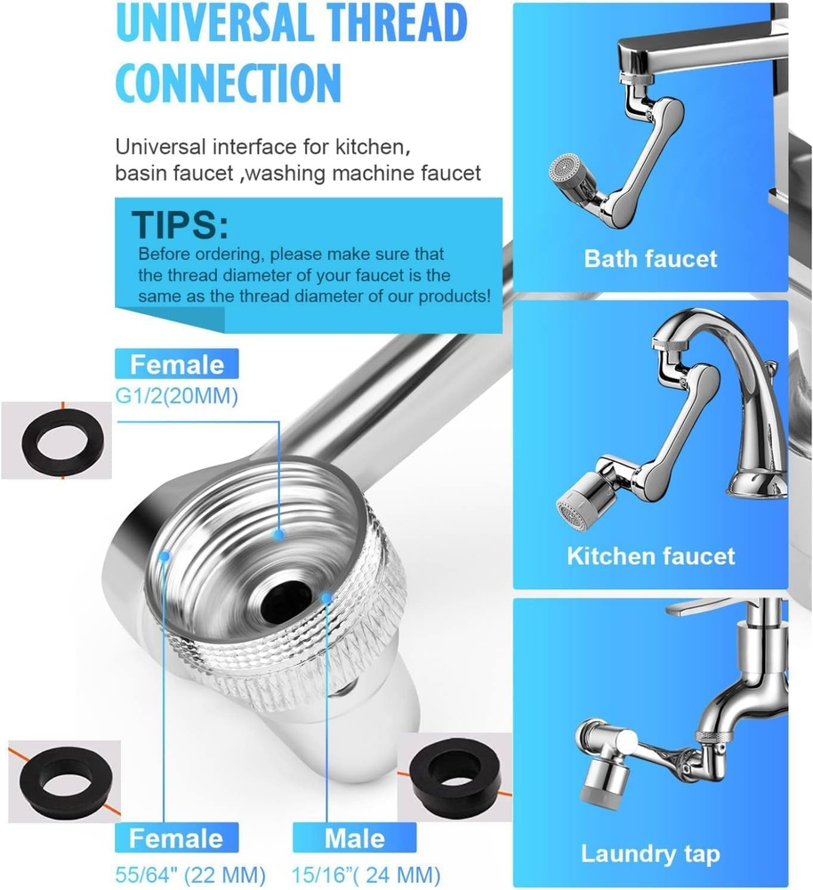 480 Pocket Coins Storage Book High-capacity Collection Album Folder Money/Holder 15.19 USD 15.99 USD Free shipping 5% off 2pc Headlamp Flashlight 1200 Lumen LED Rechargeable Headlight White Red Light 13.84 USD Free shipping No Crumbs Kitty Kurlz Cat Toy Wear-Resistant Cat Scratching Board A+ 13.59 USD Free shipping Indestructible Dog Toys for Aggressive Chewers Extreme Tough Dog Toys (Beef) A+ 12.99 USD Free shipping 10-PCS Thick Pyrex Glass Chillum Tobacco Pipe, Smoking pipe, Smooth One Hitter 11.27 USD Free shipping 15W Phone Holder Wireless Charger USB Charging Mount for Motorcycle Handlebar s+ 22.59 USD Free shipping Feedback: We will leave POSITIVE FEEDBACK after receiving the payment. Please contact us if you are not satisfied with the item after receive it. If you are dissatisfied for any reason, please donot be quick to leave negative/neutral feedback. We work hard to make sure EVERY CUSTOMER 100% SATISFIED and resolve any problem for you and always leave positive feedback to all our customers. To our esteemed customers: Greetings! If you buy a package in our store if you show any problem please do not worry, we will certainly solve the problem for you, please feel free to contact us, we will communicate with you within 24 hours to confirm that you provide programs to solve the problem! Thank you for every one in my store to buy you, have a good day ~! Product Description 💖Improved Coverage: Our faucet features a robotic arm design with three 360° rotation interfaces, allowing for a total of 1080° adjustment. This ensures that water flow reaches every corner of your sink for a more effective clean. 💖Versatile Water Modes: Our swivel faucet aerator offers two different modes to meet all your cleaning needs. The soft oxygen-rich bubble mode is perfect for washing hands, face, and gargling, while the high-pressure spray shower mode is ideal for quick cleaning of items like vegetables, fruits, and sink surfaces. 💖Superior Quality Materials: Crafted from high-quality ABS materials, our faucet aerator is not only durable, but also resistant to rust and corrosion, ensuring long-lasting performance. 💖Easy Installation: Our faucet is designed to be easy to install, with accessories and tools included. It is suitable for most faucets and can be installed directly on 20/22/24mm internal/external thread diameter faucets. 💖Multi-Purpose Design: Our faucet is versatile and can be used in a variety of settings. In the kitchen, it makes cleaning fruits and dishes a breeze, while in the bathroom, it makes washing your face or hair easier than ever. Product Specification Type Swivel Faucet Extender Color Silver Material ABS Qty 2 Pack Installation Type Screw Type Mode Two Gears Package Included 🎁2 x Faucet Extender 🎁6 x Connector Accessories 🎁8 x Rubber Washers