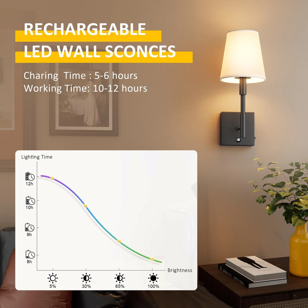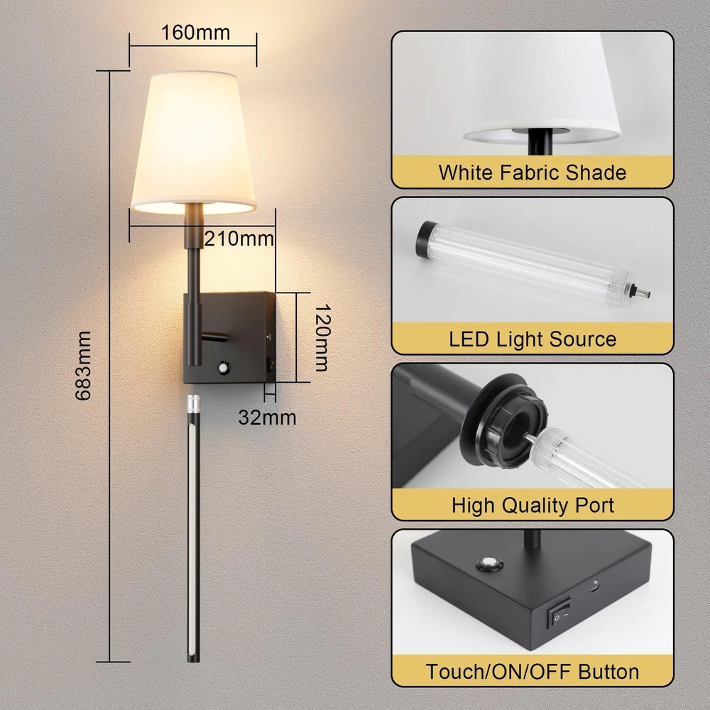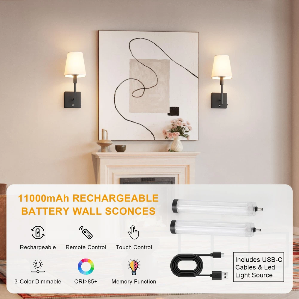 Indoor non-hardwired remote control wall sconce with built-in 11,000mAh battery, which can be used for 10-12 hours on a full charge. The wall sconce has three color temperatures, stepless dimming and timer function, the touch wall sconce is suitable for lighting areas without electricity or frequent power outages. Versatile Control Options: This battery-operated black wall sconces features both remote control and touch switch capabilities, ensuring convenience and ease of use. Perfect for adjusting the lighting without the need to reach for the switch. High-Quality Construction: Crafted from premium aluminum metal, the battery wall light not only boasts durability but also adds a modern touch to any space. The LED light source pairs beautifully with a white fabric lampshade, creating an elegant aesthetic. Customizable Lighting Experience: With a color temperature range of 3000K to 6000K and adjustable brightness settings (5%-100%), the battery powered wall sconce allows for complete control over the ambiance. Timer function options of 0.5 hours, 1 hour, 2 hours, 4 hours, 6 hours, and 8 hours offer convenience for energy-saving use. 11000mAh Battery Capacity: Charging via a USB-C(2.0A)cable provides quick and efficient power replenishment. Once fully charged, the black battery sconces set of two operates for approximately 10-12 hours, making it ideal for uninterrupted usage during nighttime or power outages. Ideal for Various Settings: This non-hardwired wall light is suitable for indoor areas lacking electrical outlets, making it a great choice for bedrooms, living rooms, hallways, and warehouses. Functioning as an emergency lighting solution, it ensures safety and visibility in critical situations.