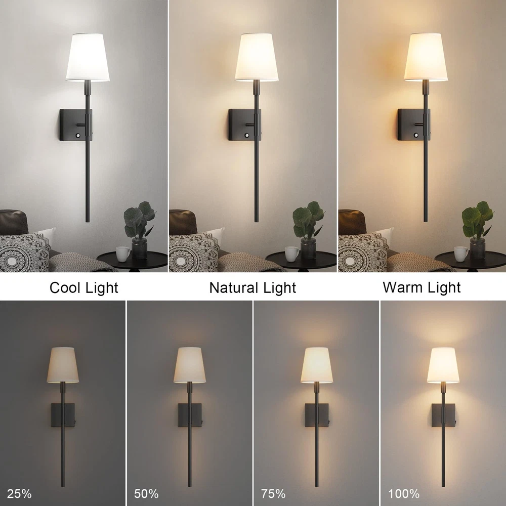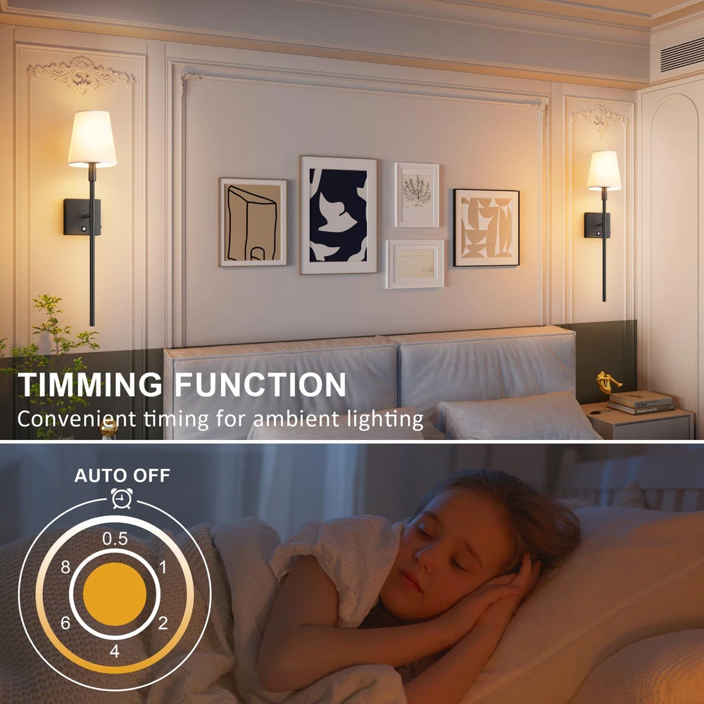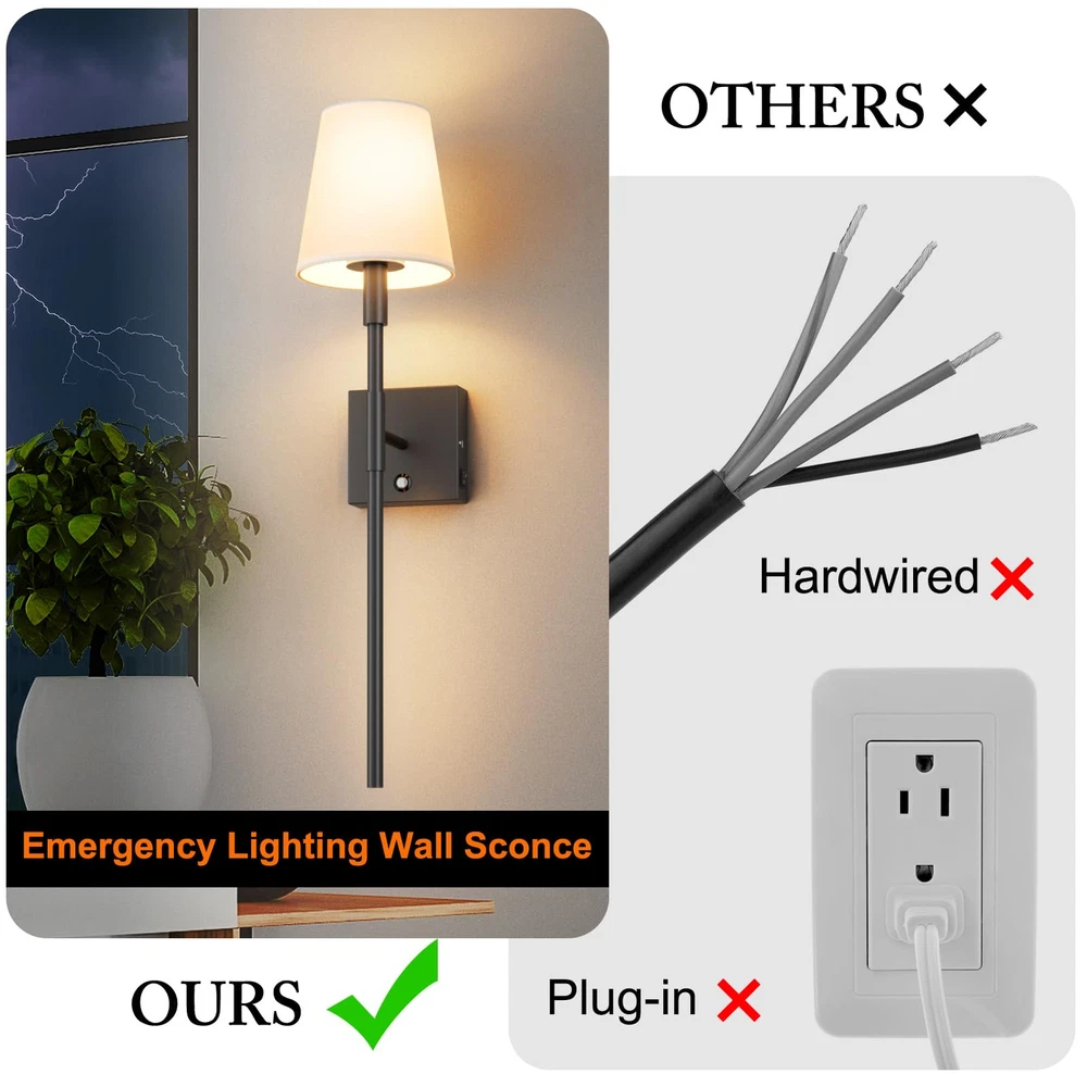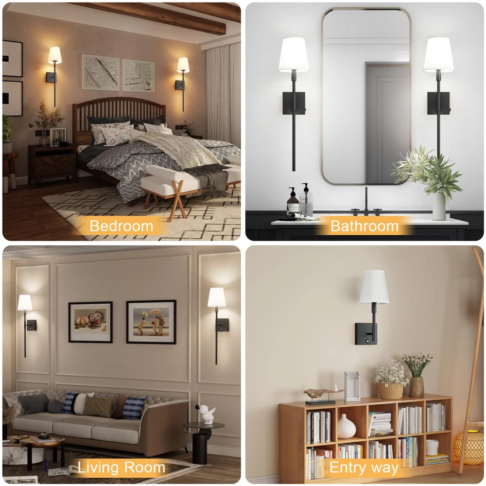 Indoor non-hardwired remote control wall sconce with built-in 11,000mAh battery, which can be used for 10-12 hours on a full charge. The wall sconce has three color temperatures, stepless dimming and timer function, the touch wall sconce is suitable for lighting areas without electricity or frequent power outages. Versatile Control Options: This battery-operated black wall sconces features both remote control and touch switch capabilities, ensuring convenience and ease of use. Perfect for adjusting the lighting without the need to reach for the switch. High-Quality Construction: Crafted from premium aluminum metal, the battery wall light not only boasts durability but also adds a modern touch to any space. The LED light source pairs beautifully with a white fabric lampshade, creating an elegant aesthetic. Customizable Lighting Experience: With a color temperature range of 3000K to 6000K and adjustable brightness settings (5%-100%), the battery powered wall sconce allows for complete control over the ambiance. Timer function options of 0.5 hours, 1 hour, 2 hours, 4 hours, 6 hours, and 8 hours offer convenience for energy-saving use. 11000mAh Battery Capacity: Charging via a USB-C(2.0A)cable provides quick and efficient power replenishment. Once fully charged, the black battery sconces set of two operates for approximately 10-12 hours, making it ideal for uninterrupted usage during nighttime or power outages. Ideal for Various Settings: This non-hardwired wall light is suitable for indoor areas lacking electrical outlets, making it a great choice for bedrooms, living rooms, hallways, and warehouses. Functioning as an emergency lighting solution, it ensures safety and visibility in critical situations.