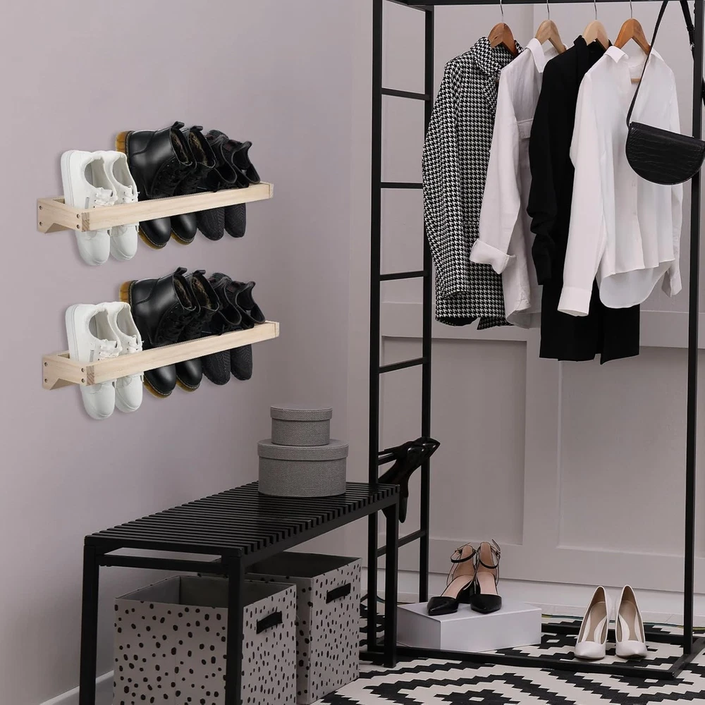 This wall-mounted shoe rack is a game-changer for small spaces! The rustic wood design adds charm while holding 3-4 pairs securely. Perfect for sneakers, heels, or sandals, it keeps everything tidy without taking up floor space. The sturdy construction feels durable, and installation was a breeze. Love how it turns shoe clutter into neat organization while looking stylish on my wall!